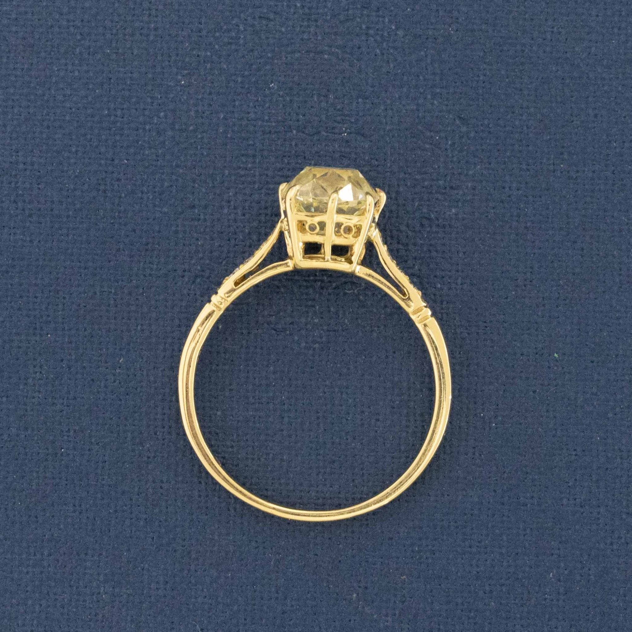 A super chonky and rustic old mine cut diamond - an early cut OMC with so much pesonality! She faces up a deep yellow in some lighting conditions and a warm vanilla in others. We love the personality changes! Set in a vintage yellow gold setting (the stone is much older than its current setting) that is both simple yet beautiful - allowing the stone to shine in all its old cut glory!