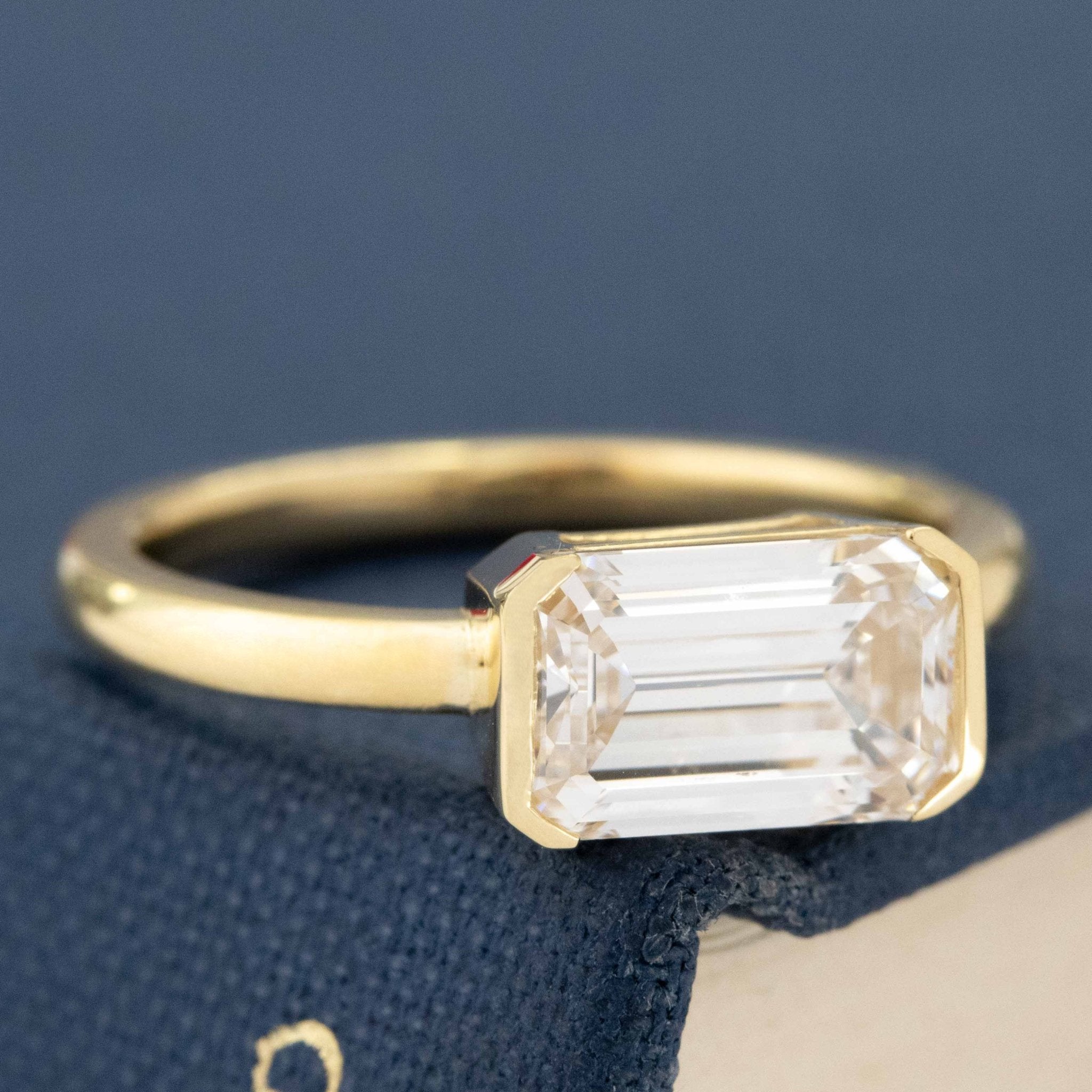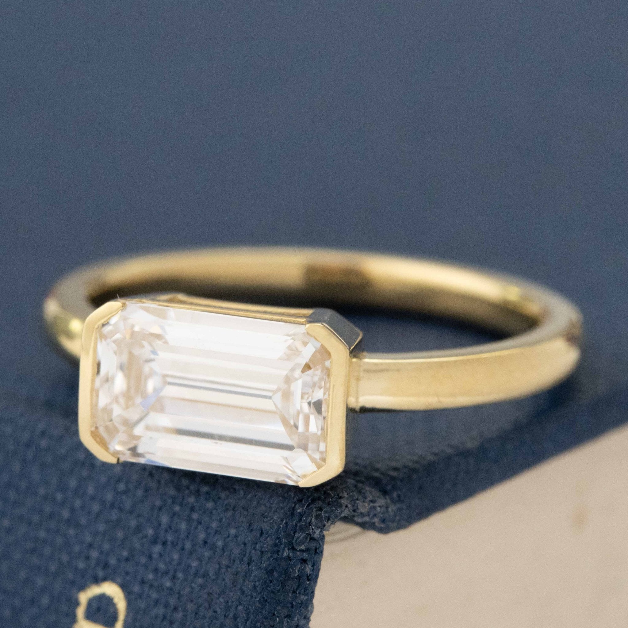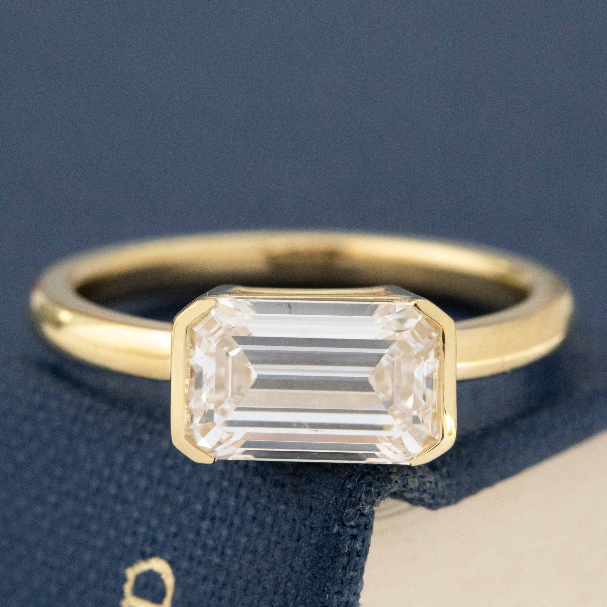 A staff fave - a half-bezel ring set with an emerald cut diamond, and we must say, we love the results! The icy-white diamond is elegantly set East-West with gold channels on either side. Low set on the finger, the ring is all elegance on the finger. And the bonus, the ring will allow a wedding to stack beautifully against it too! A gorgeous and unique ring - what a beautiful engagement ring she would make.