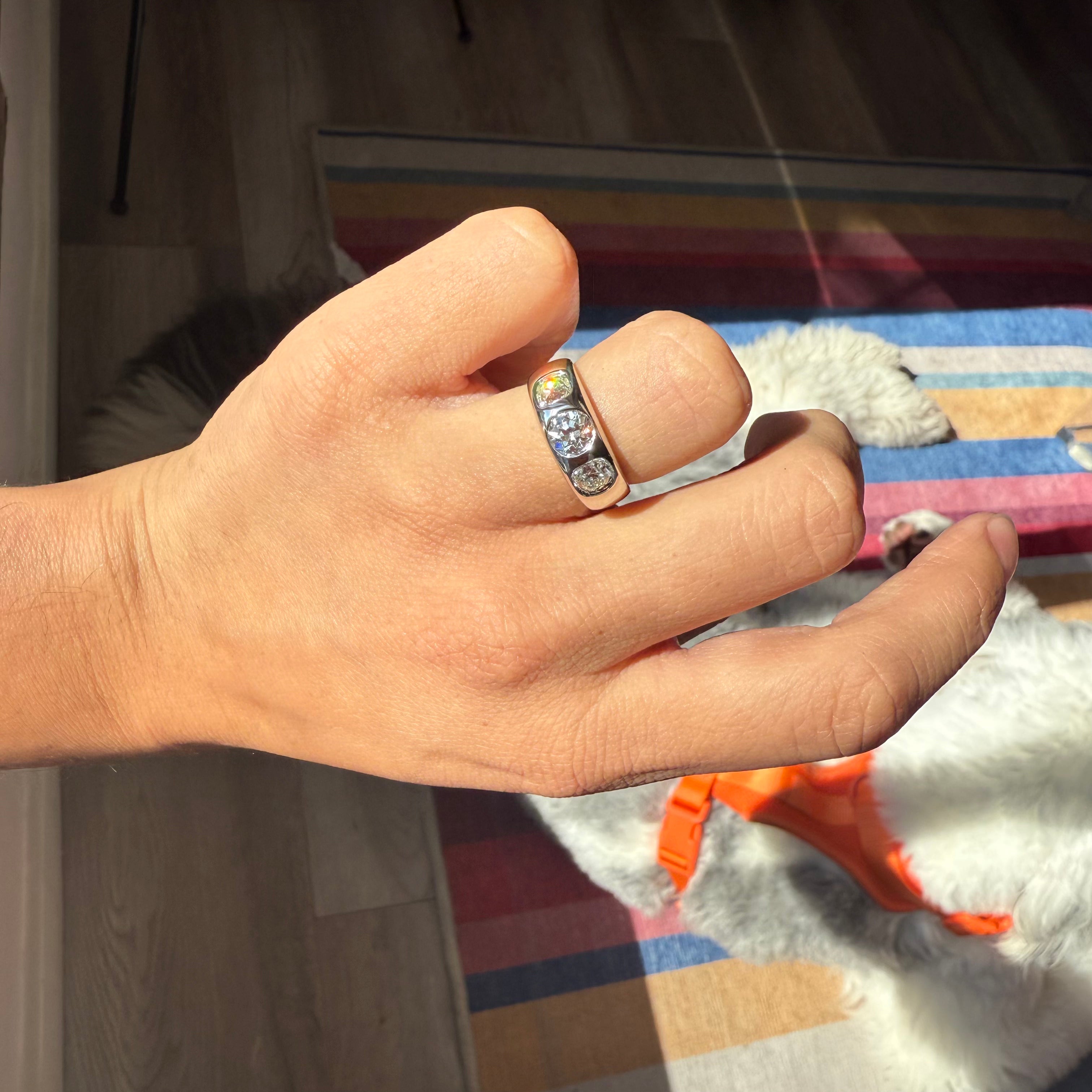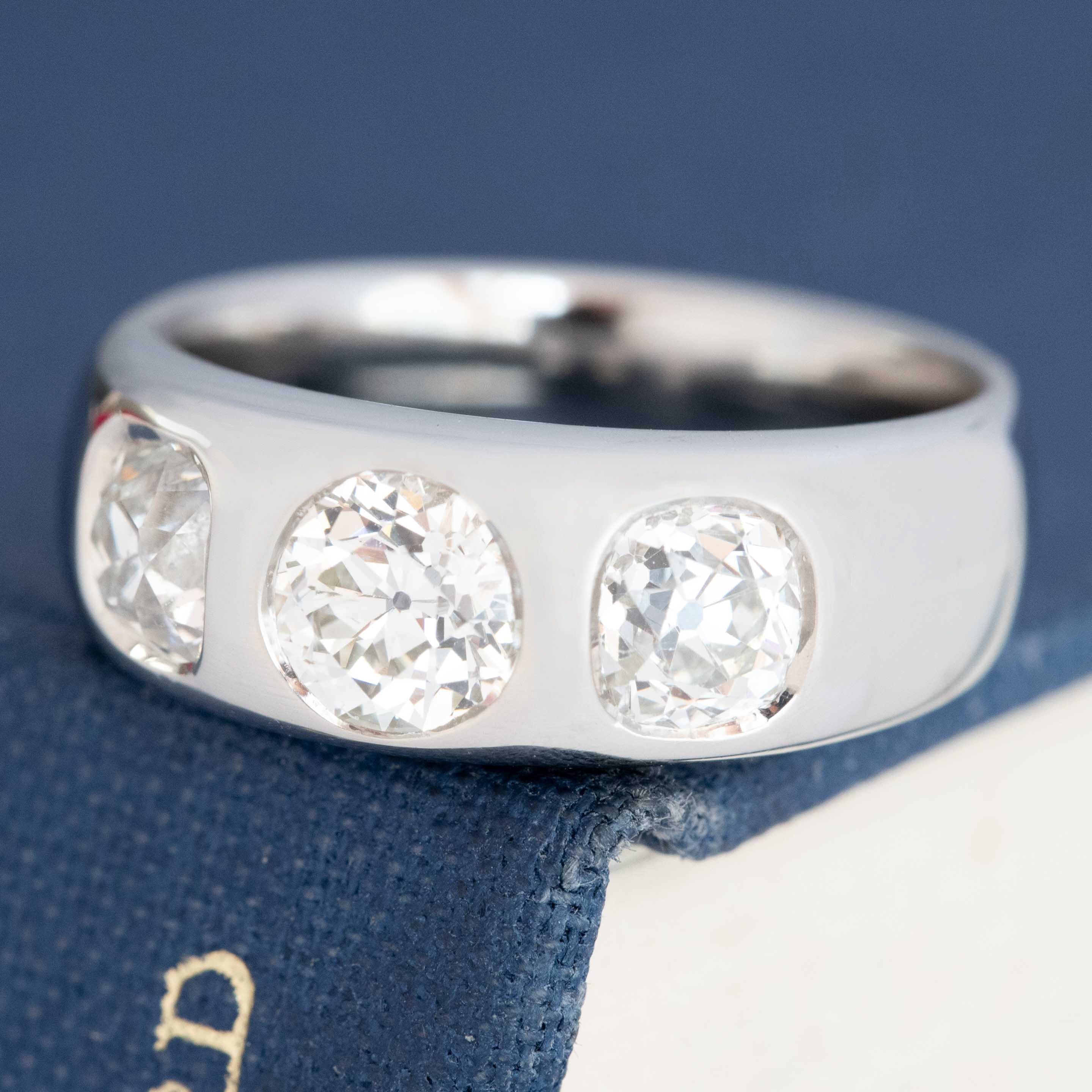 Trilogy rings are meant to represent the past, present, and future. These bezel-set trilogy rings with antique old European cut diamonds are a perfect example of that! Chunky and sparkly OECs are wrapped in platinum bezels and wear quite comfortably. They sparkle like little buttery fireballs and span beautifully across the top of one’s finger.