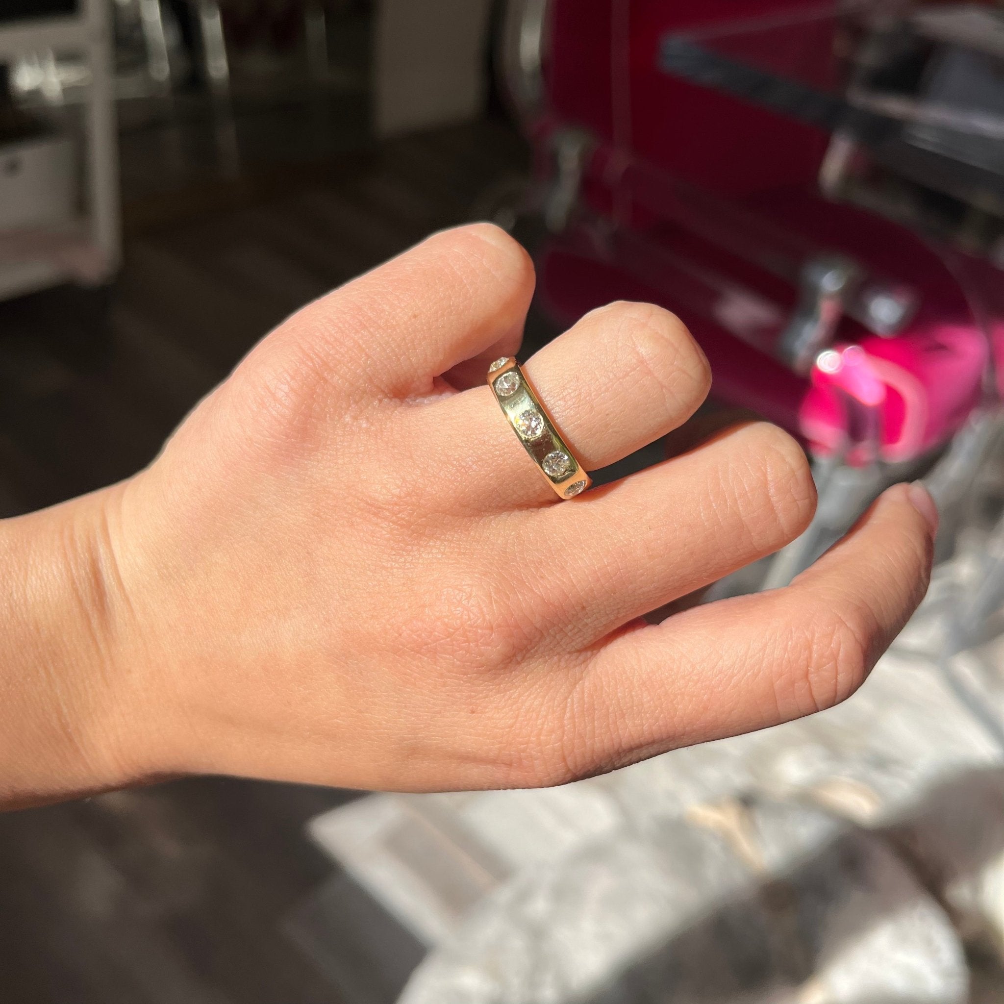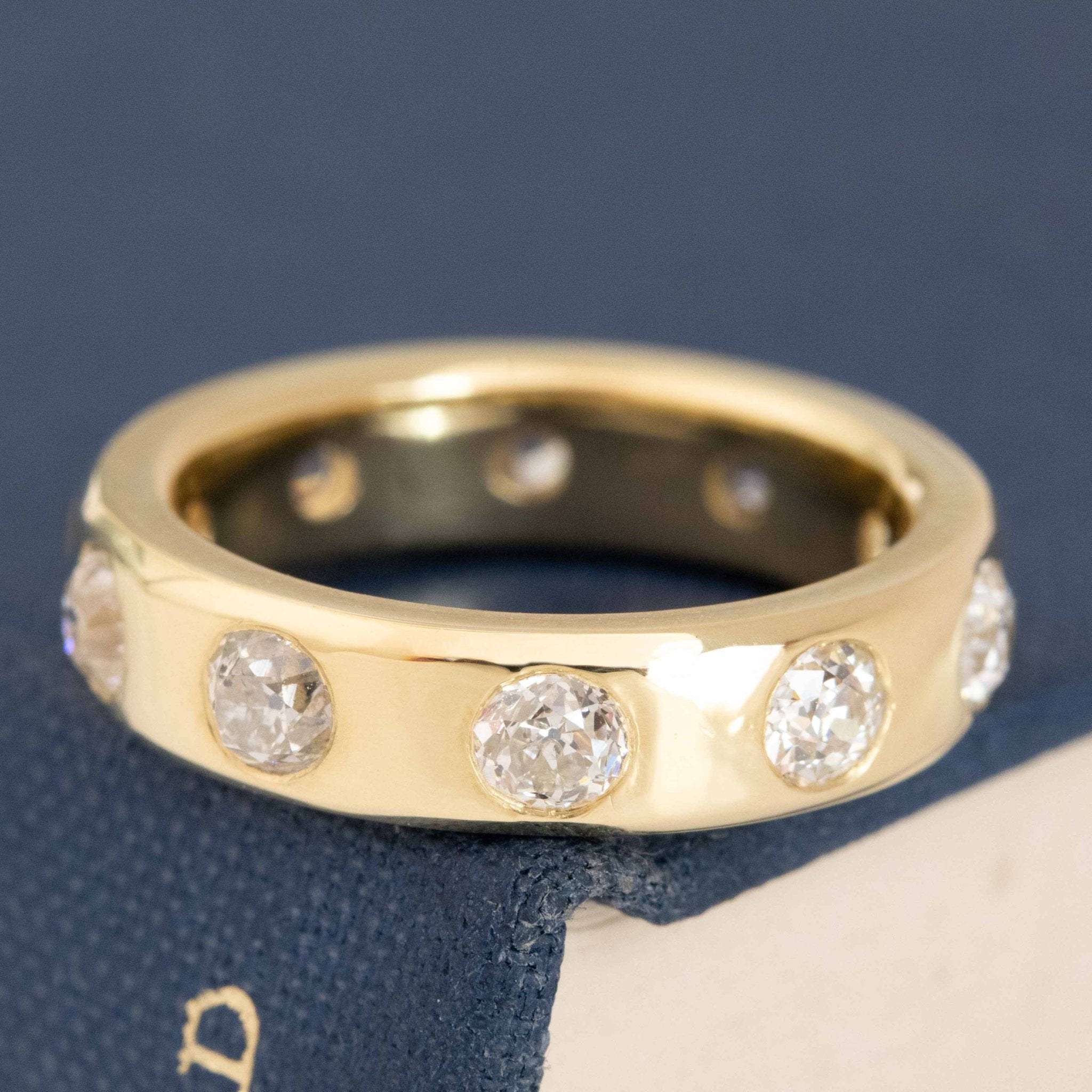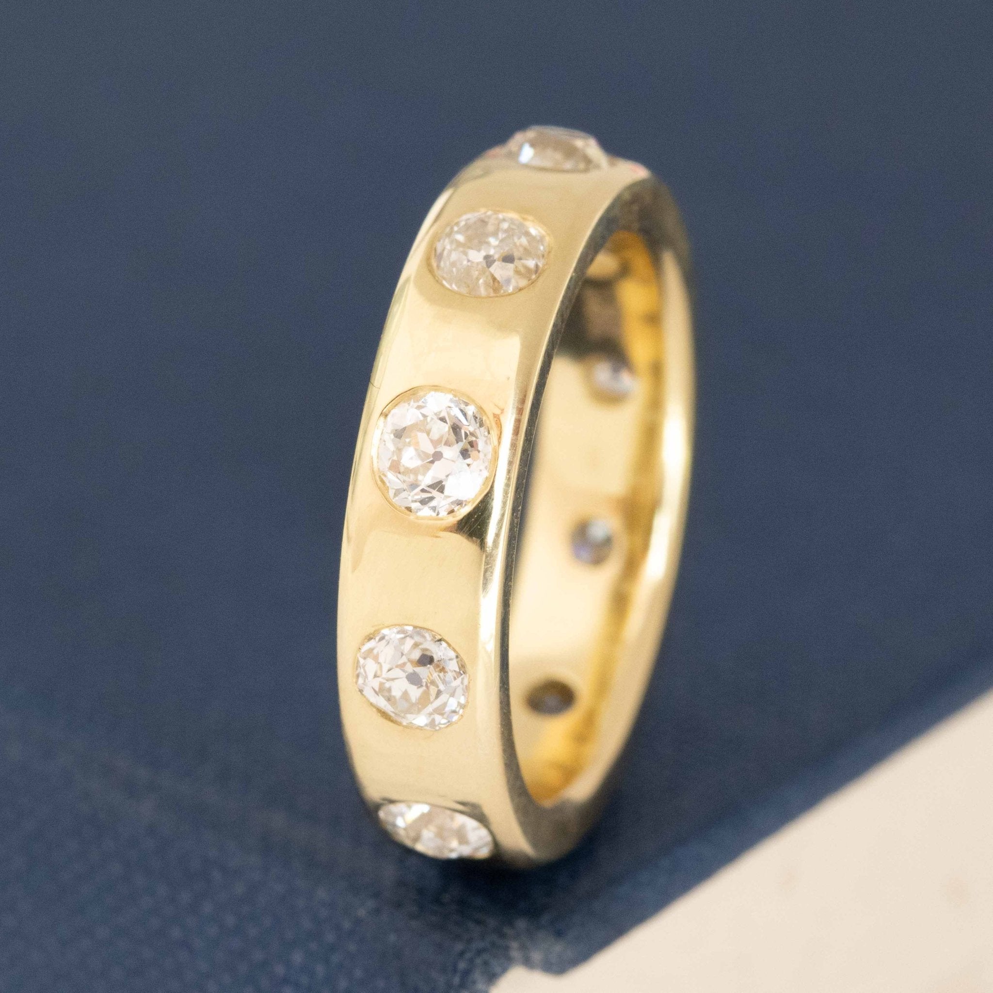 We wanted to create a set of eternity bands which were more gold heavy than diamond heavy, so this chunky gold band with flush set old cuts is our curret favorite! Set in luscious, solid 18kt with rustic Old European cuts, this band is perfect for stacking or wearing solo. It has an incredible buttery feeling and weight - she's sure to be your new favorite daily jewel.