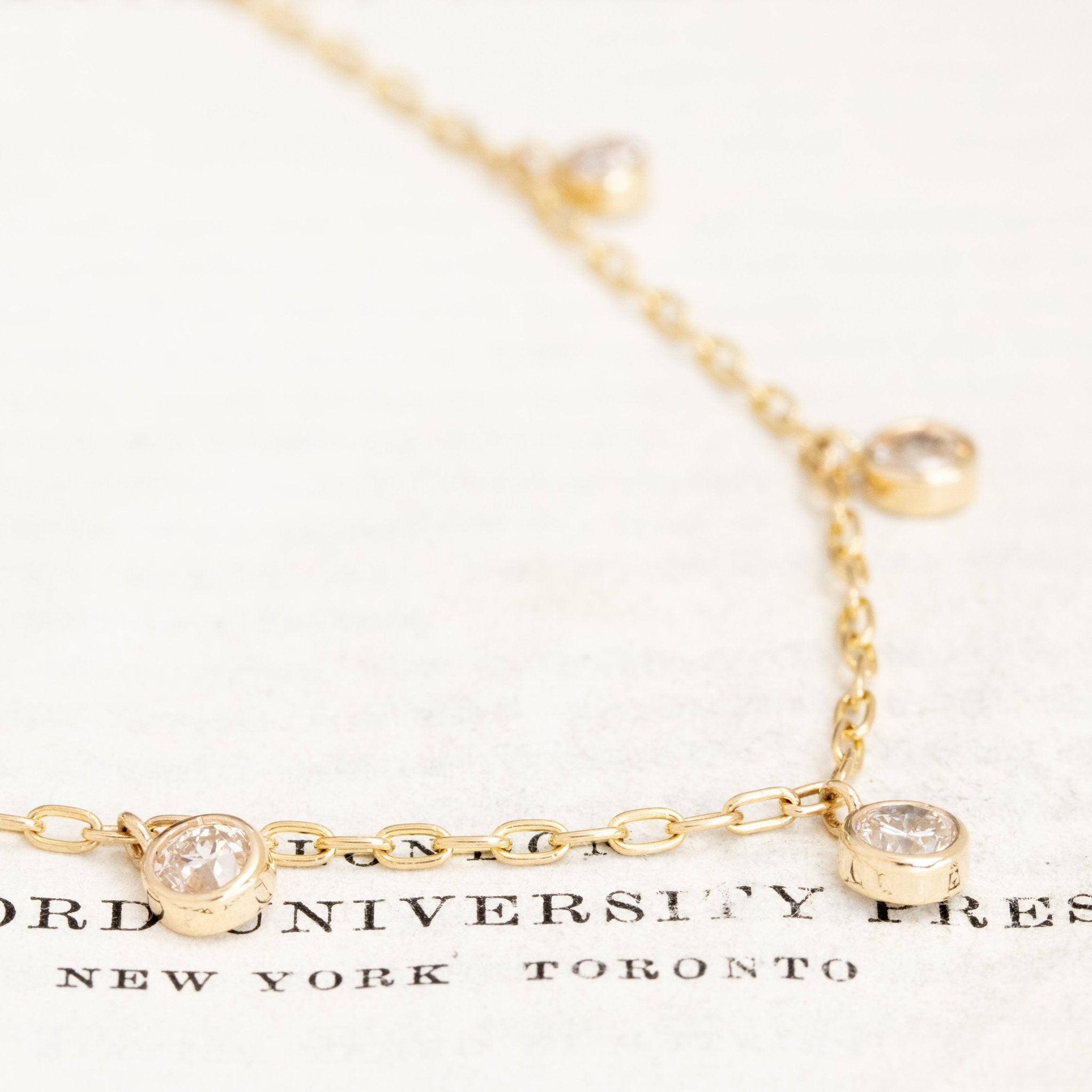 A graduated Old European cut diamond bezel station necklace, with bright old cut diamonds sitting along a contemporary petite paperclip chain. These stones are bright and prismatic, giving you tons of diamond fire with each movement in the light. We love how they span across the decolletage and the visual impression they make in their graduating sizes. Perfect for wearing solo or to add diamond details to your existing neck stack!