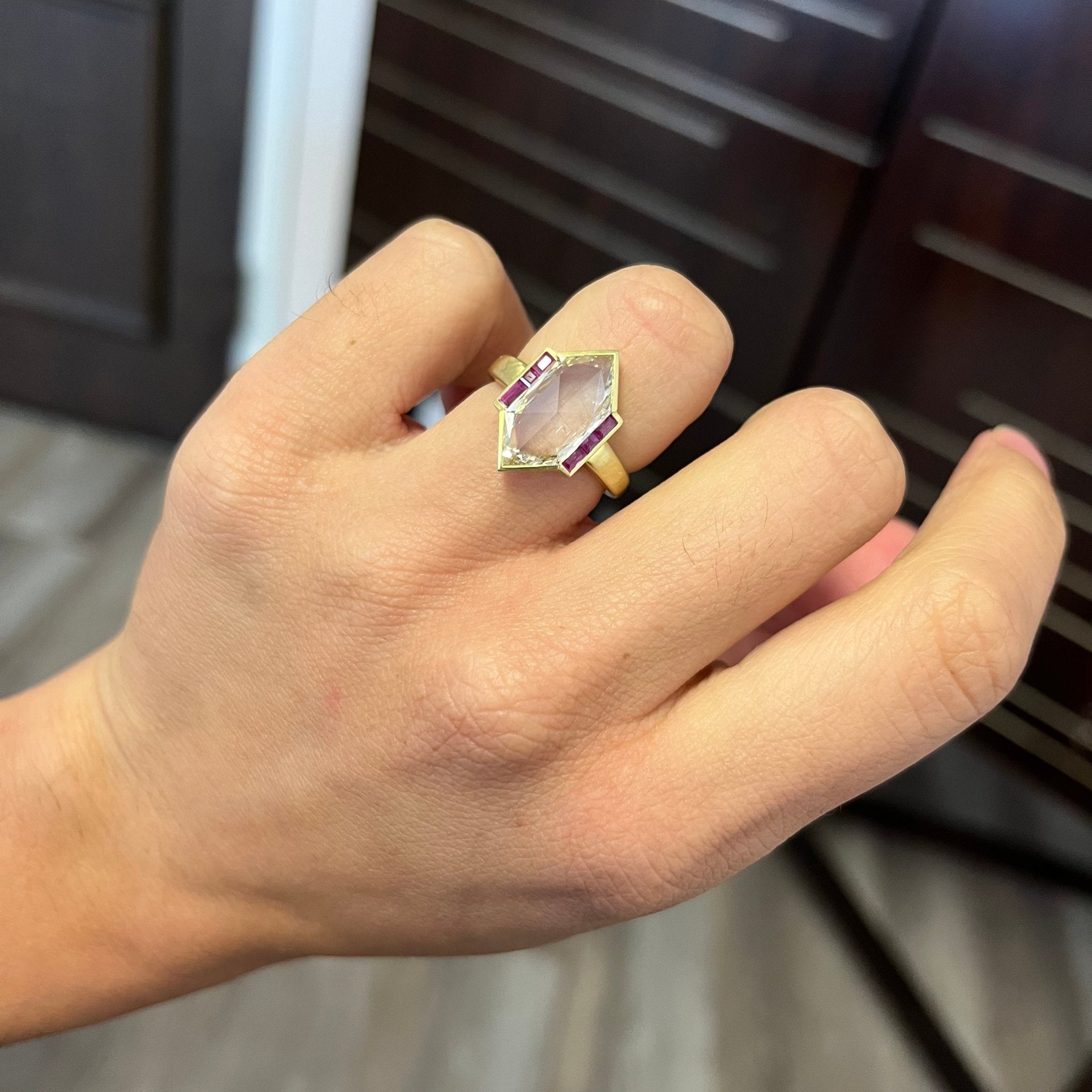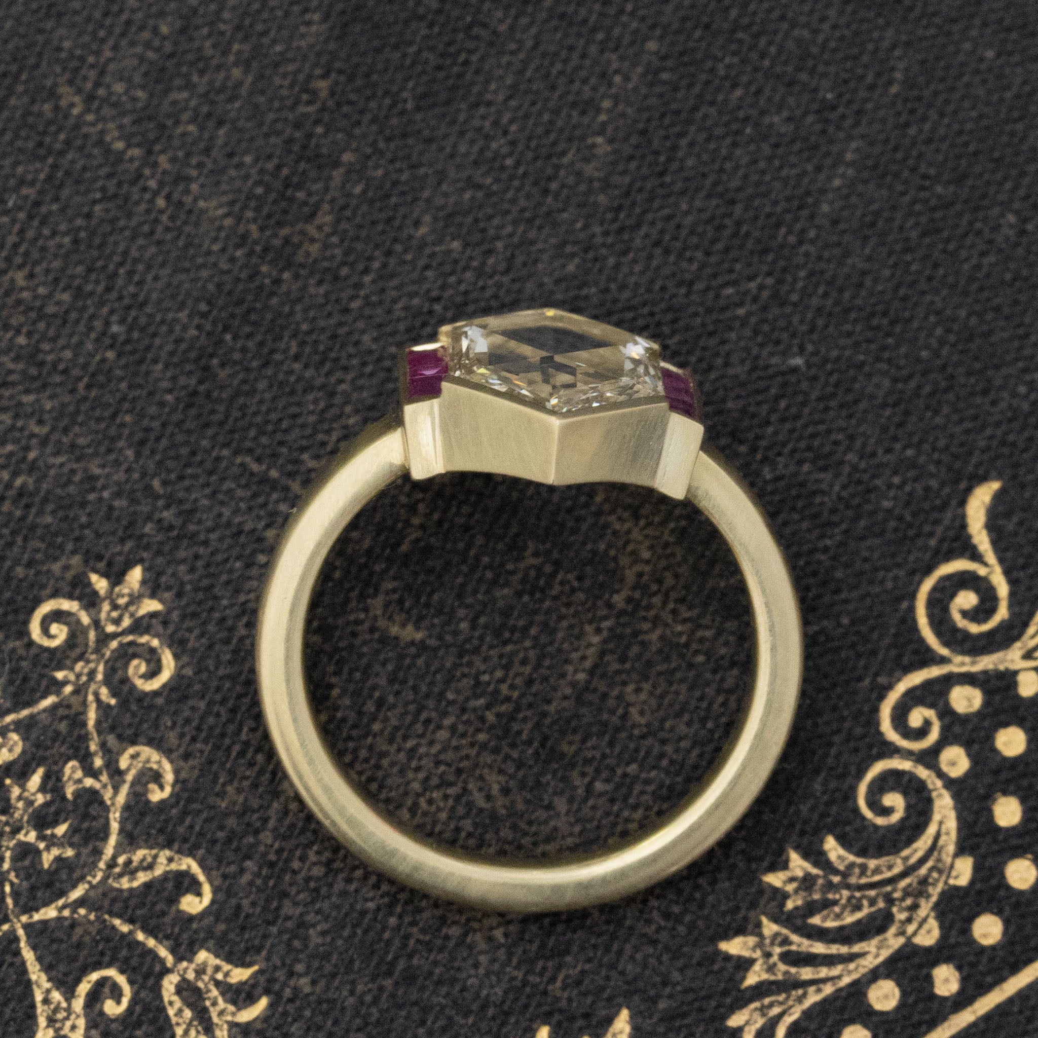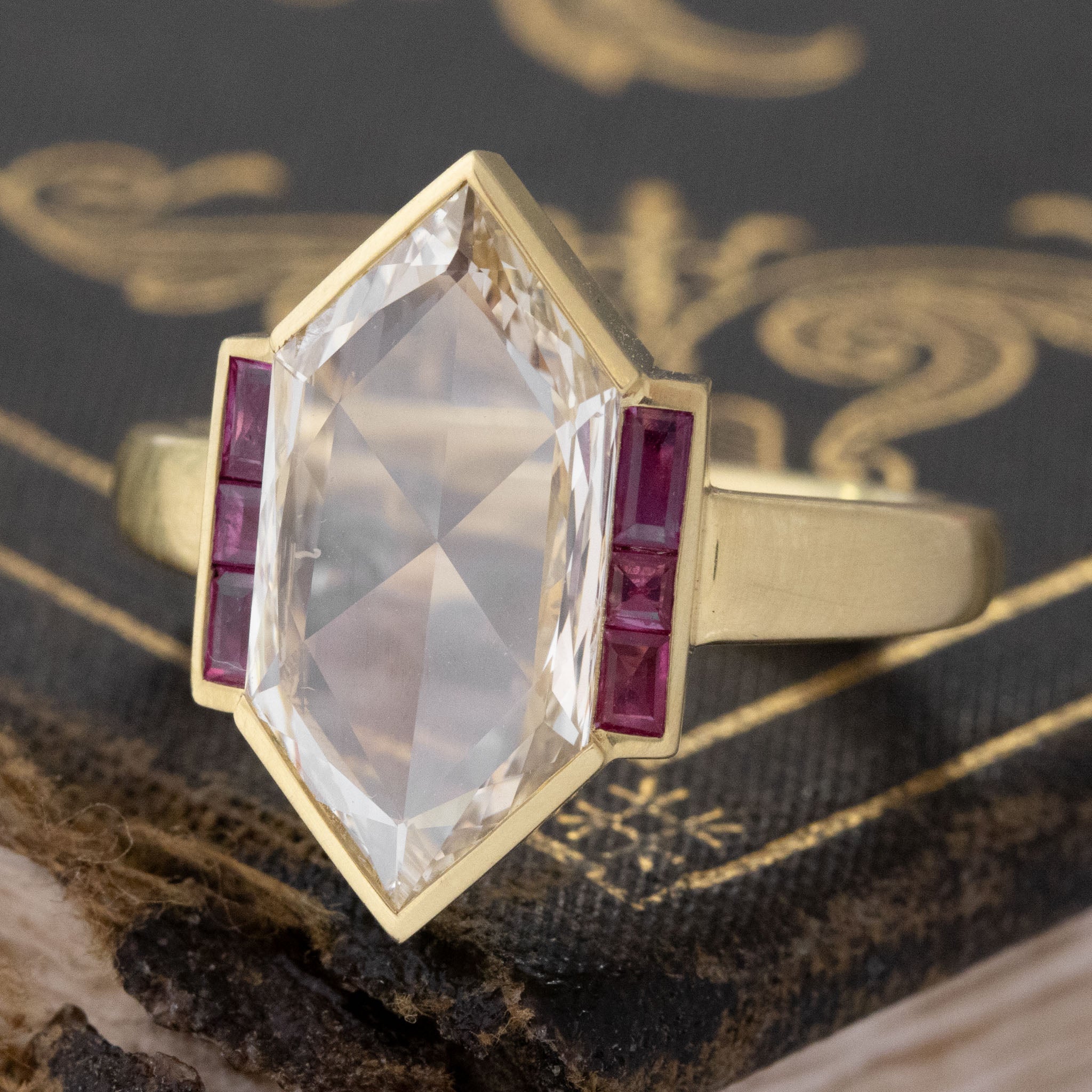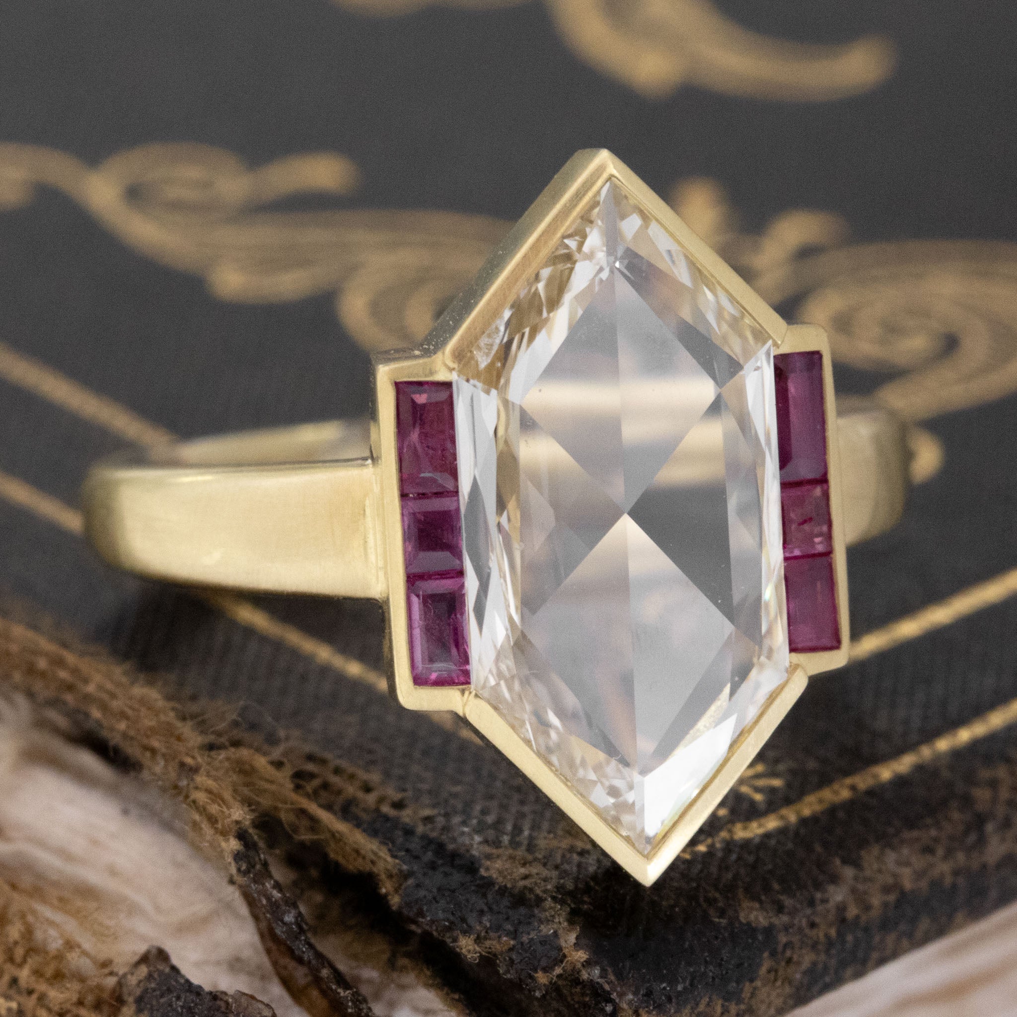 Sometimes a beautiful modern cut diamond stops us in our tracks, and makes our antique-loving hearts skip a beat. This hexagonal portrait/rose cut hybrid is a perfect example of exactly that! Set with old stock carre cut rubies, Burma origin with no heat treatment in 18kt yellow gold, we find it to be an absolutely perfect ring. The 1.97ct center stone is much whiter than its graded color (N), and just sings in yellow gold with these juicy red accents on the shoulders. The faceting is broad and shimmery like that of a rose cut, although so big and clear you can see right through them, much like a portrait cut.
