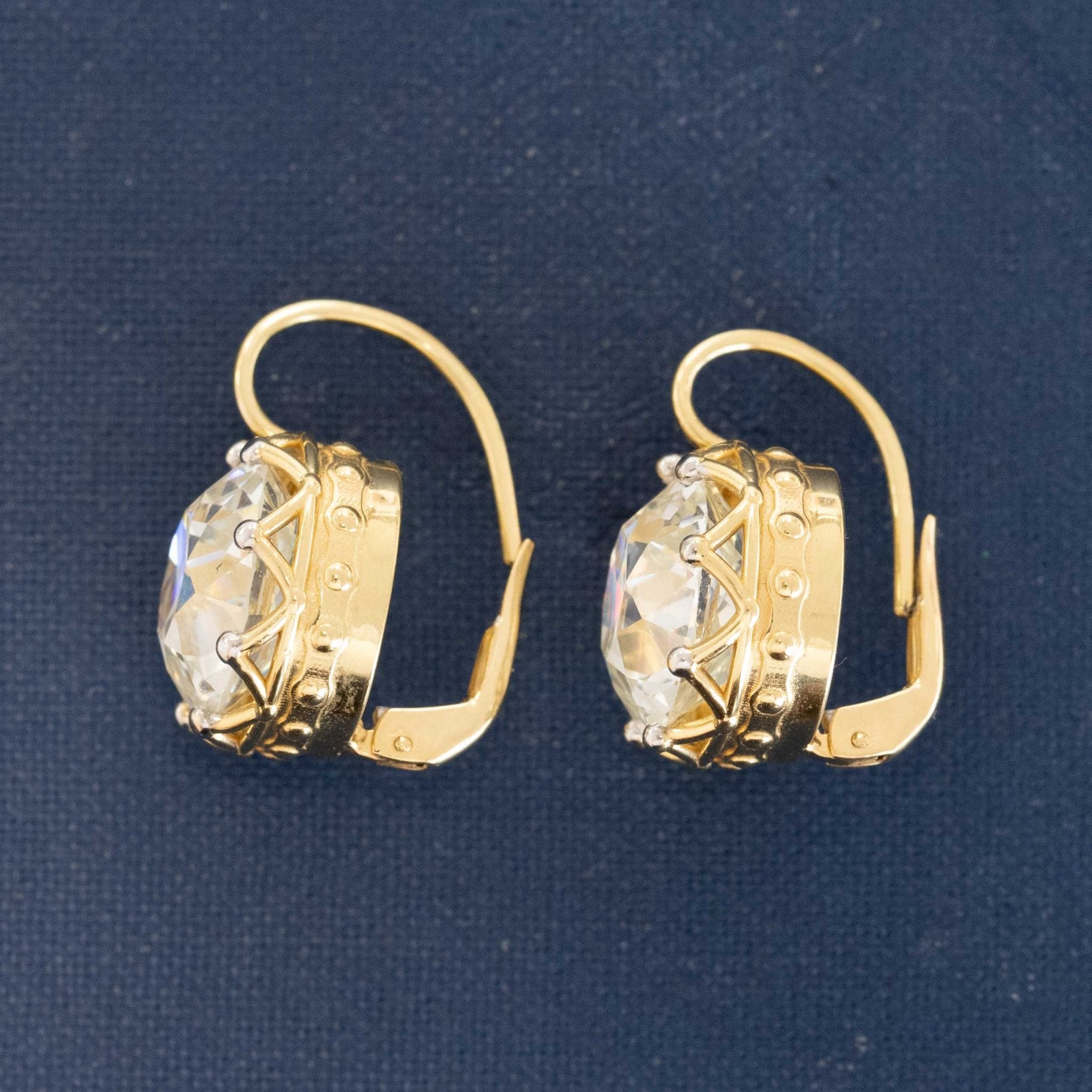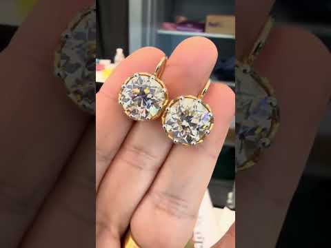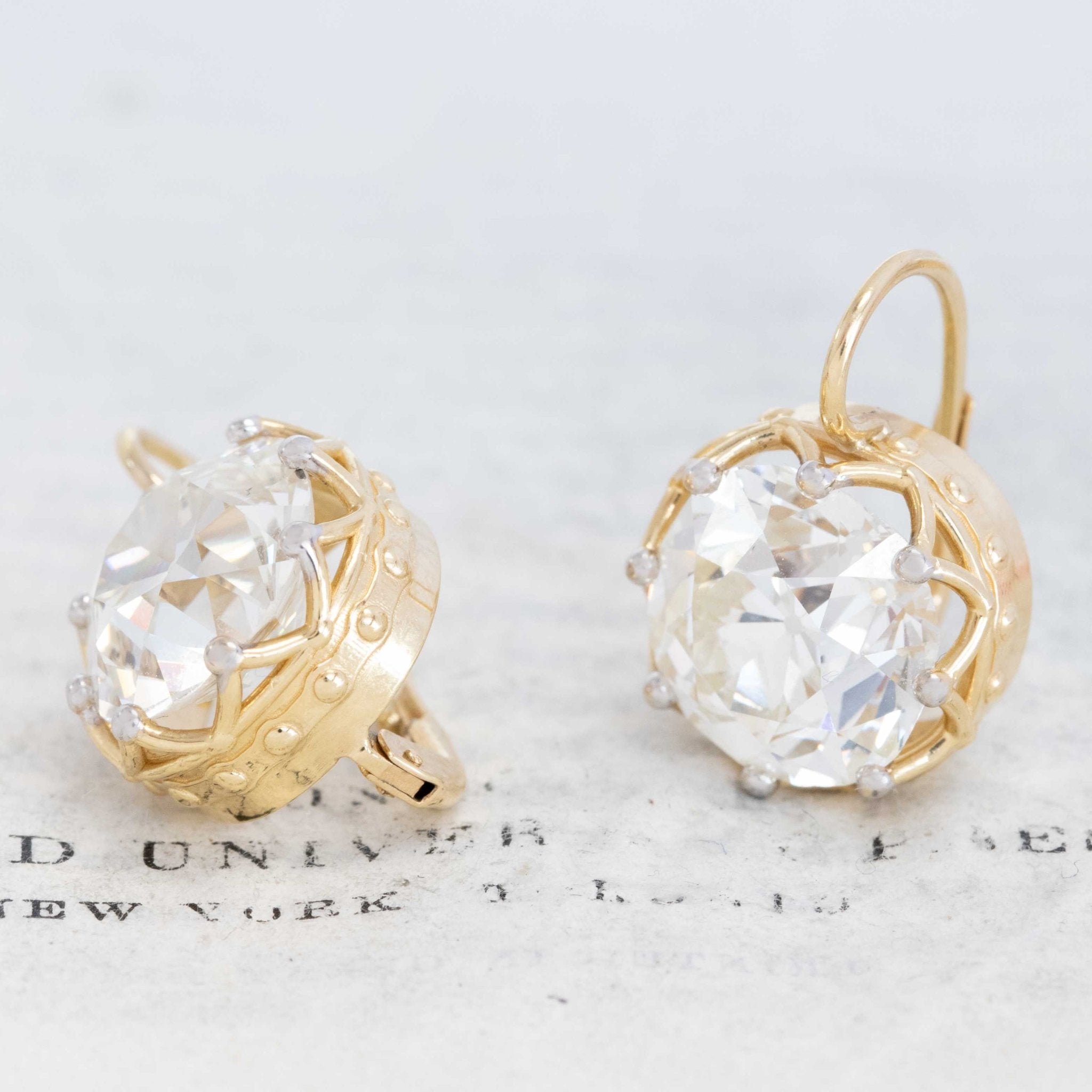 Yes, yes, you read that correctly - 14.20ctw. Over 14 carats of old mine-cut deliciousness, set in 18kt yellow gold with open-gallery metalwork and white gold prongs that help make these big diamonds look even bigger. They’re set in lever backs for both comfort and security, and the stones themselves are magnificent. Bright, prismatic, and the fieriest little (large?) orbs you ever did see. Incredible doesn’t do them justice.