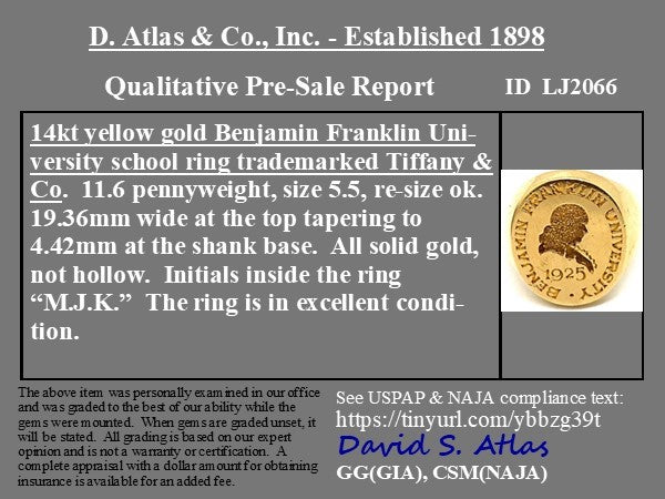 1925 Benjamin Franklin University Class Ring by Tiffany & Co