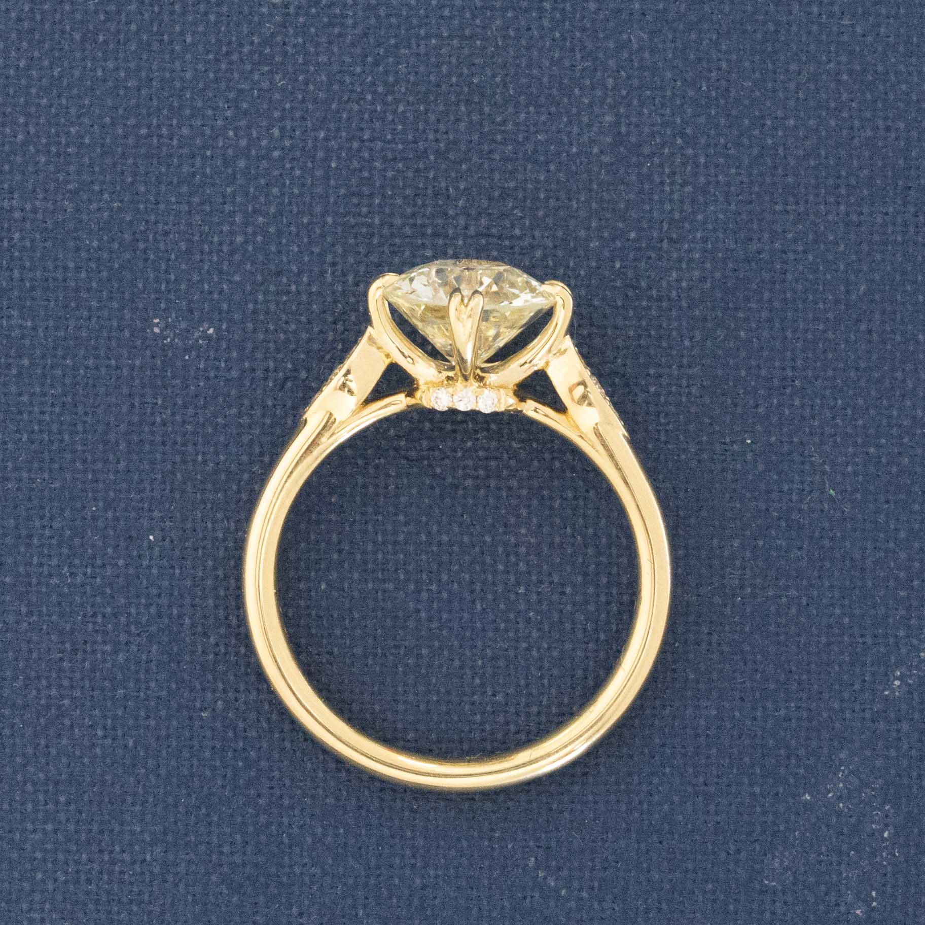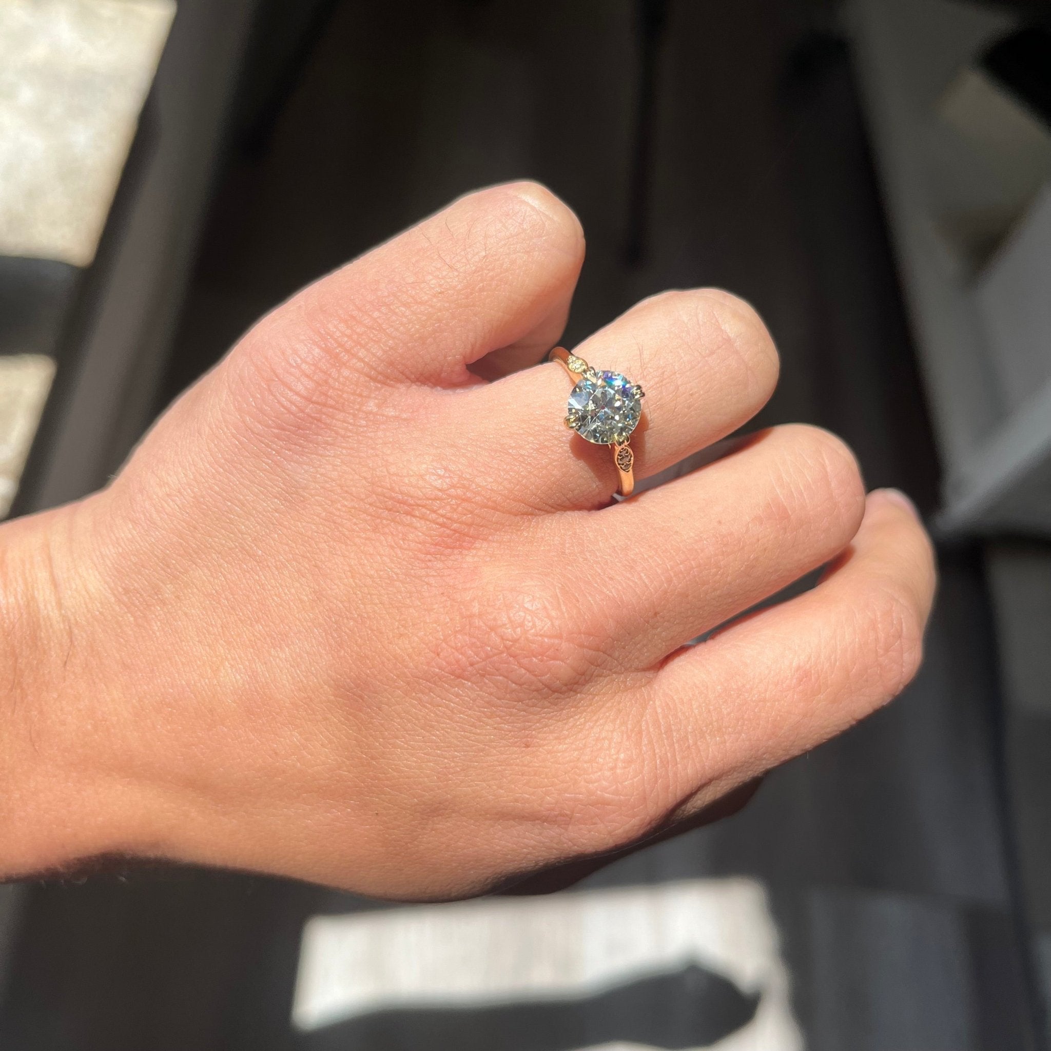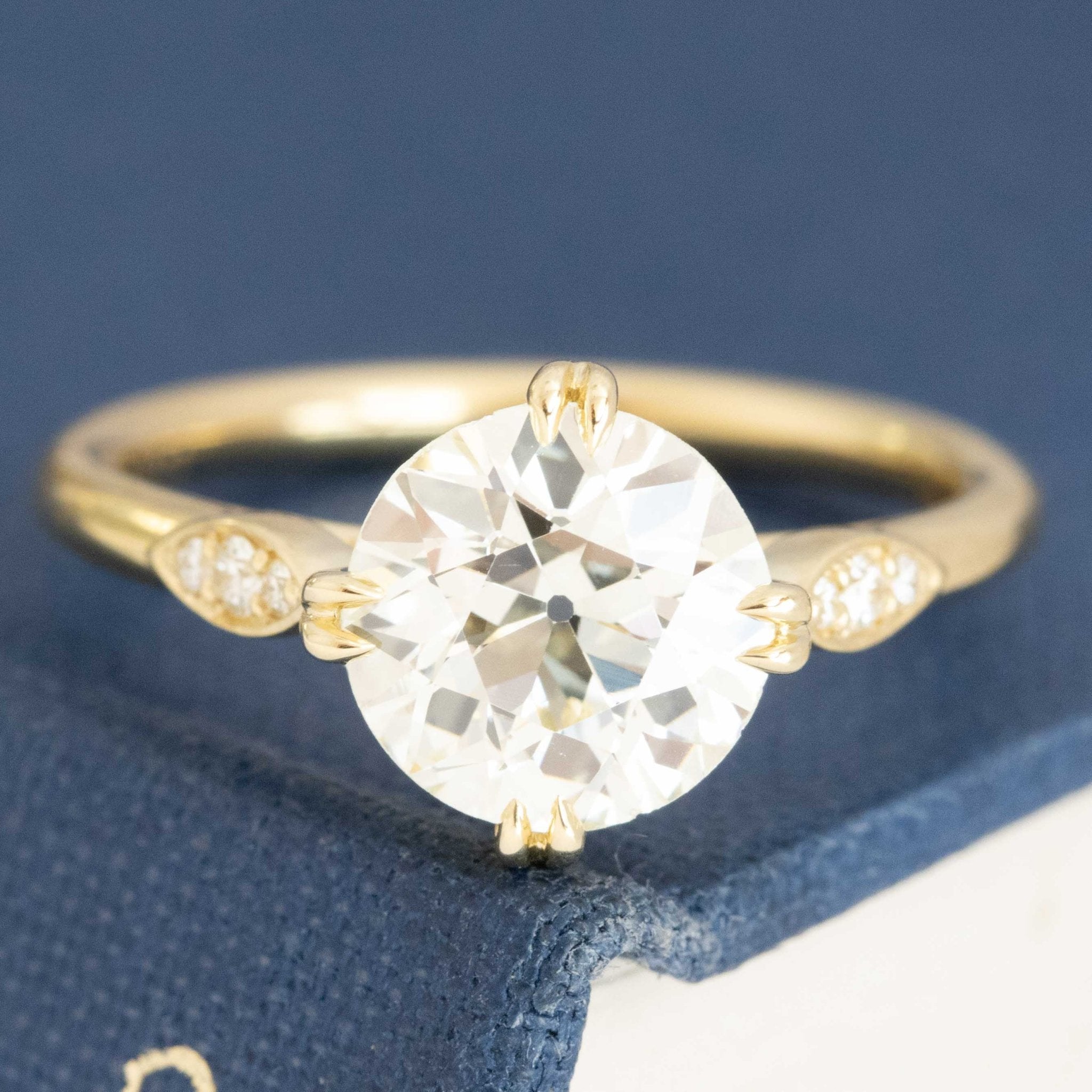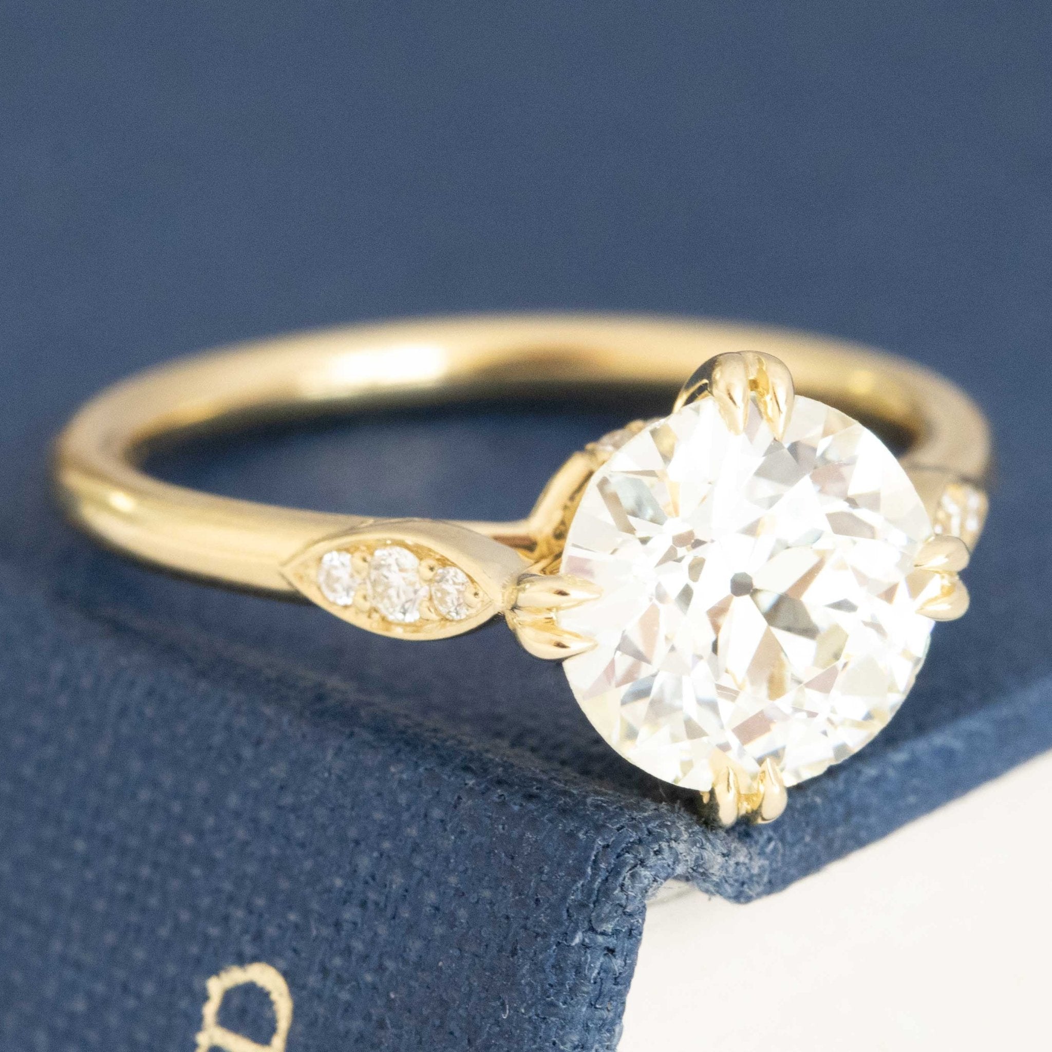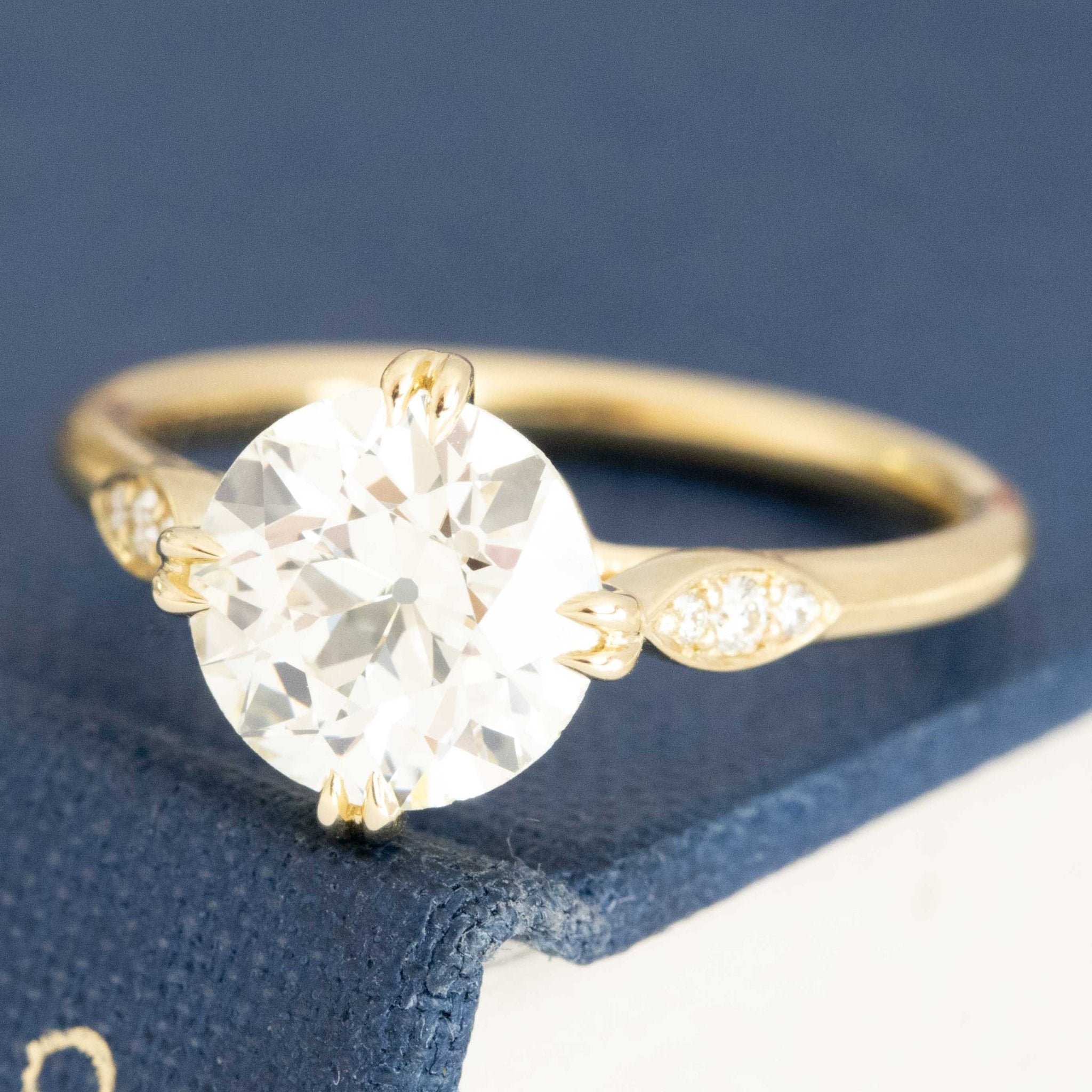 A charming antique Old European cut diamond sitting in an equally charming antique-inspired setting! This fiery 2ct has a beautiful warmth to it that doesn't express as yellow, but rather a cool ivory color. She's got double claw prongs at the NSEW points and trios of round cuts on the shoulders, sitting in a petal-like motif.