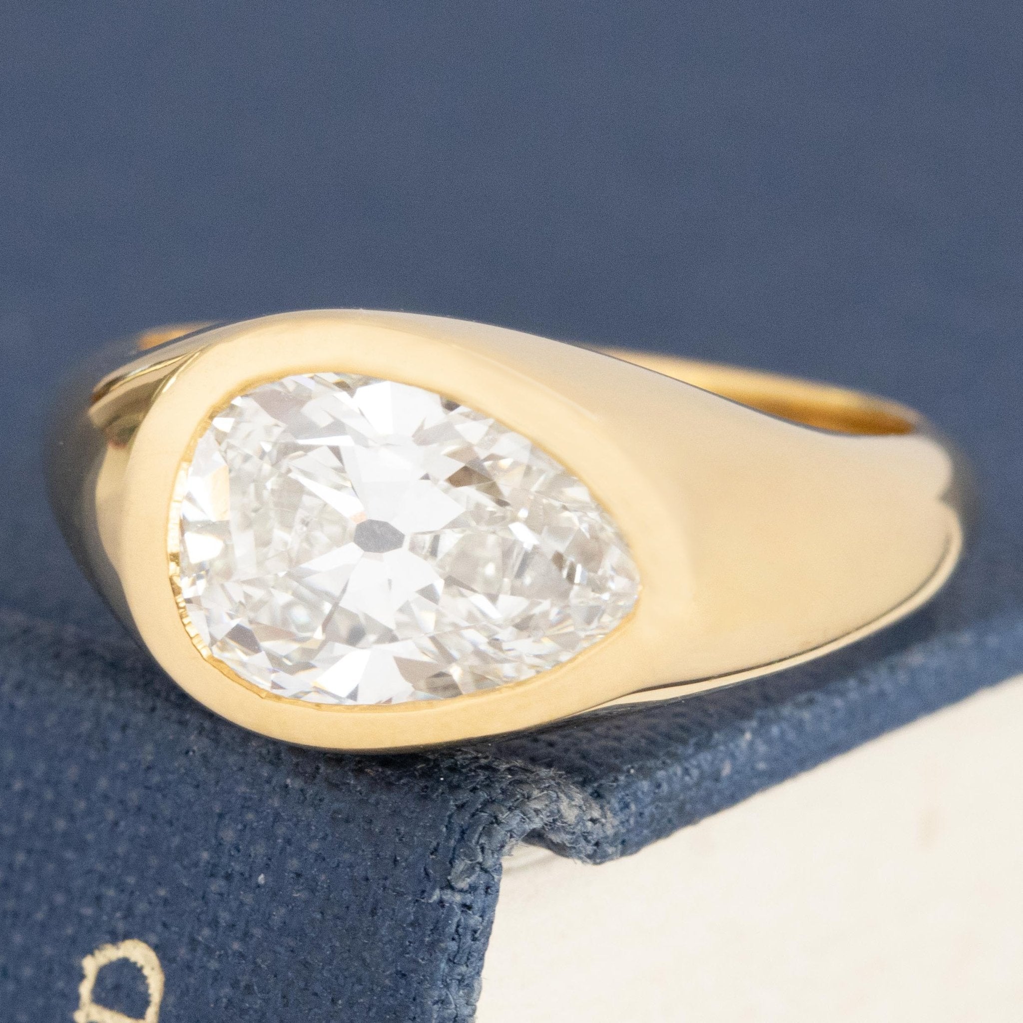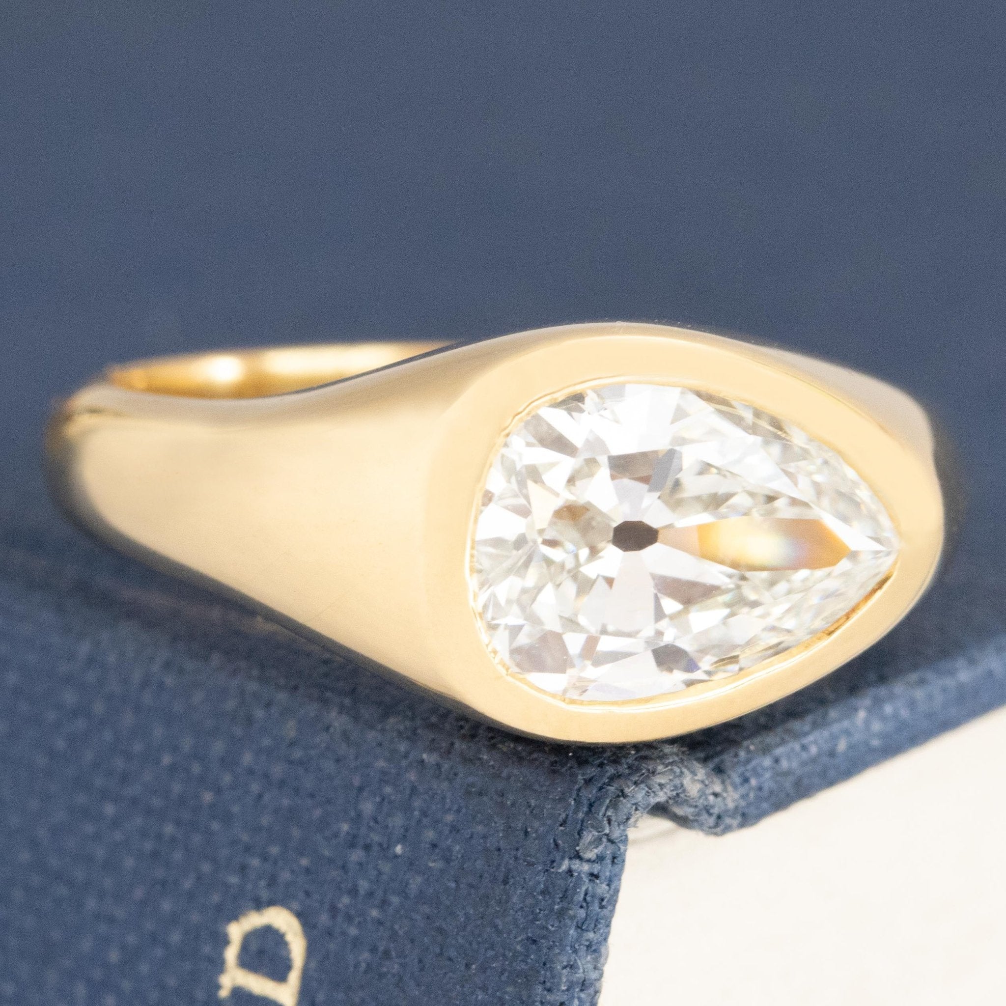 Pear cut diamonds are a favorite of ours - and while they are almost exclusively set in the North/South orientation, we love turning things on their head. Quite literally.