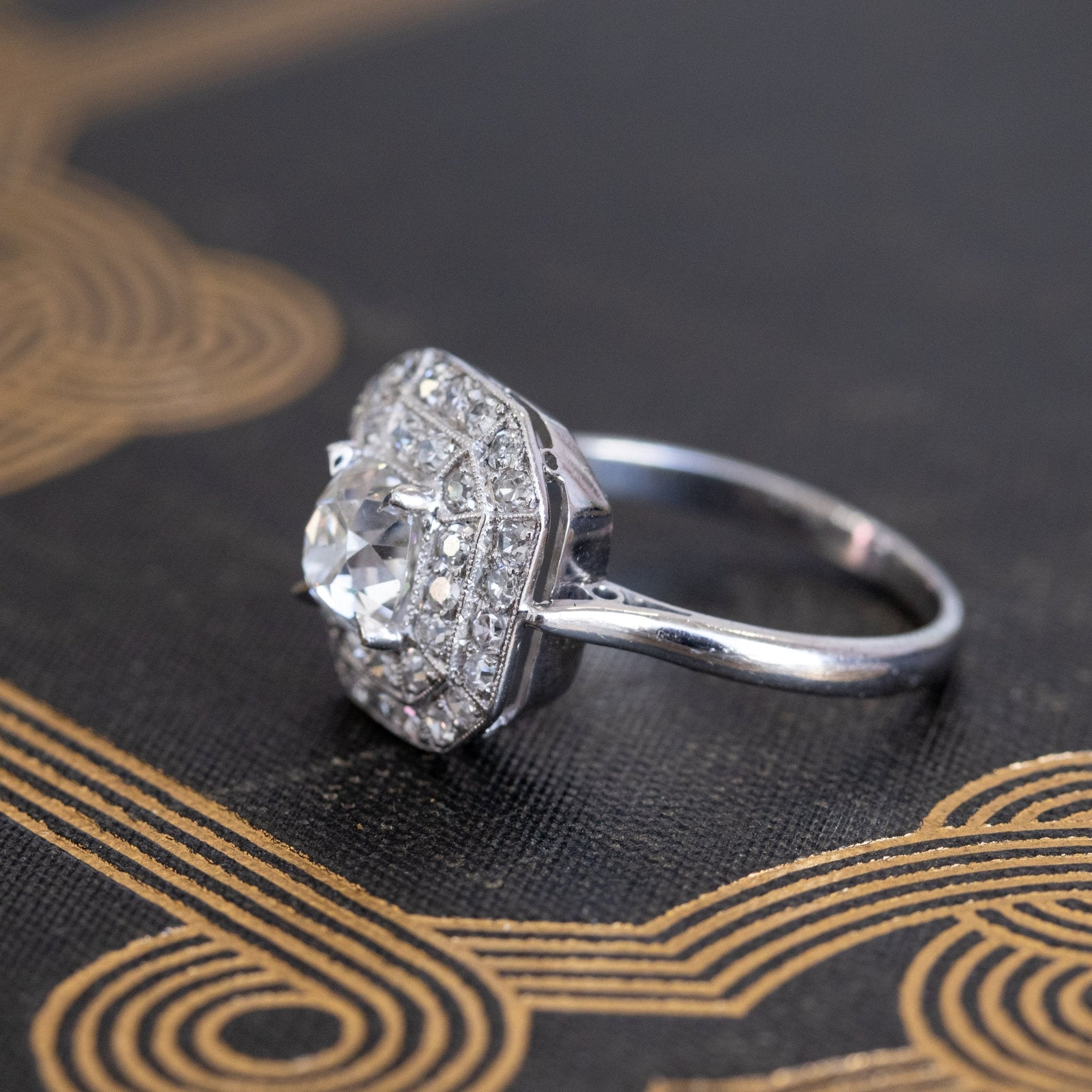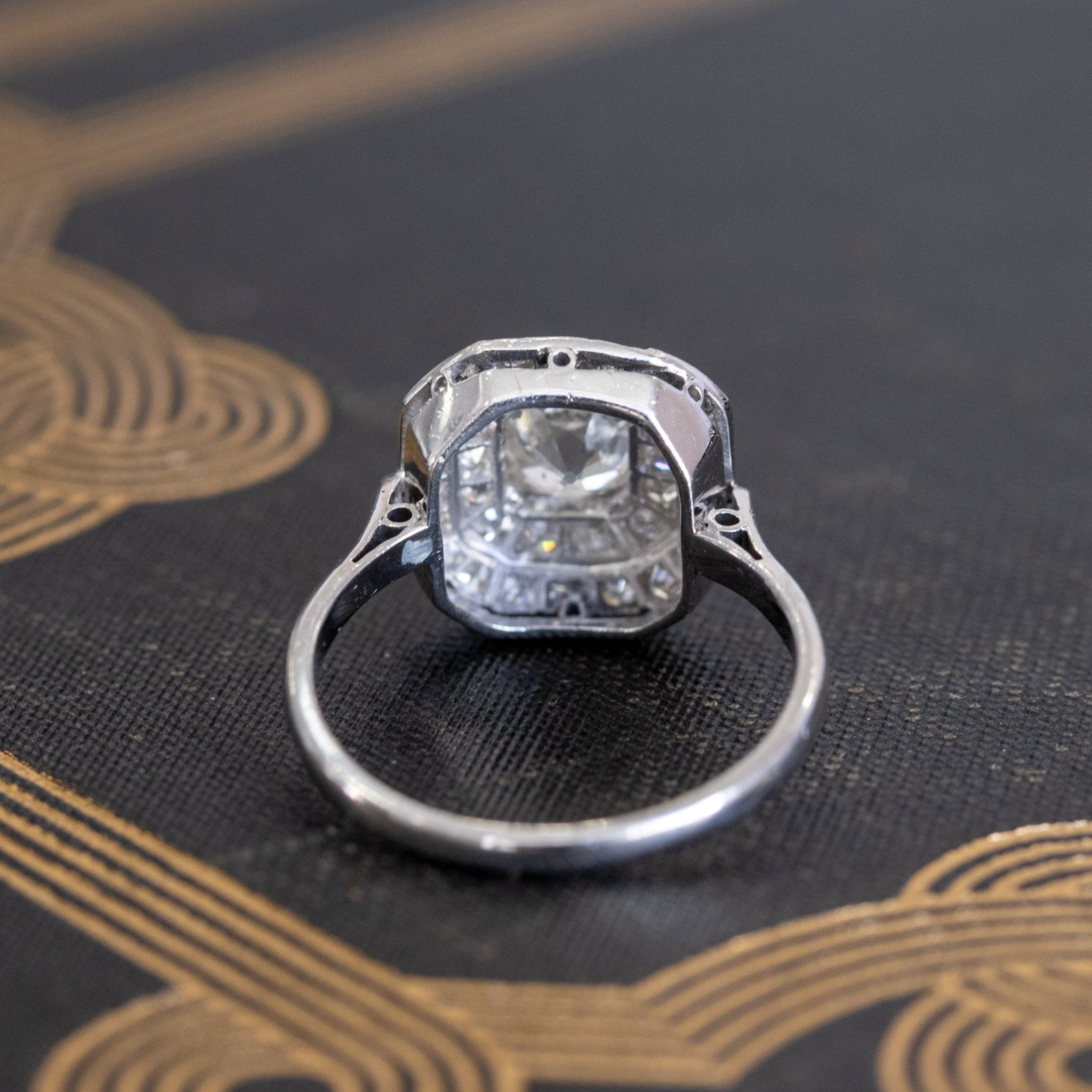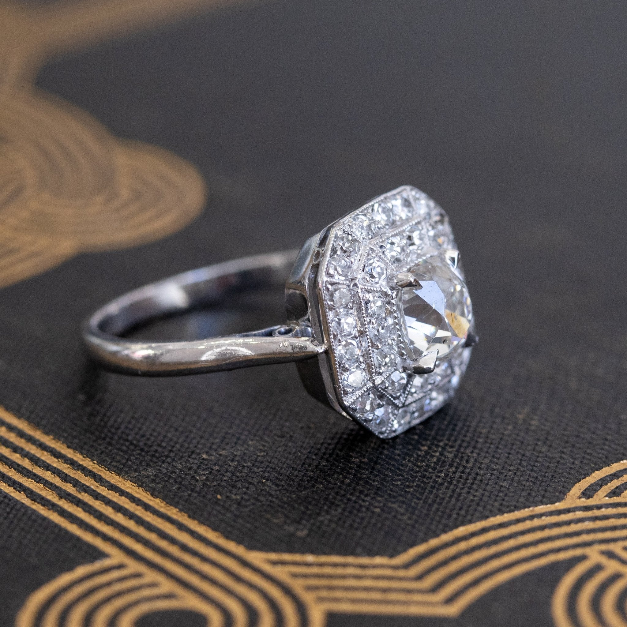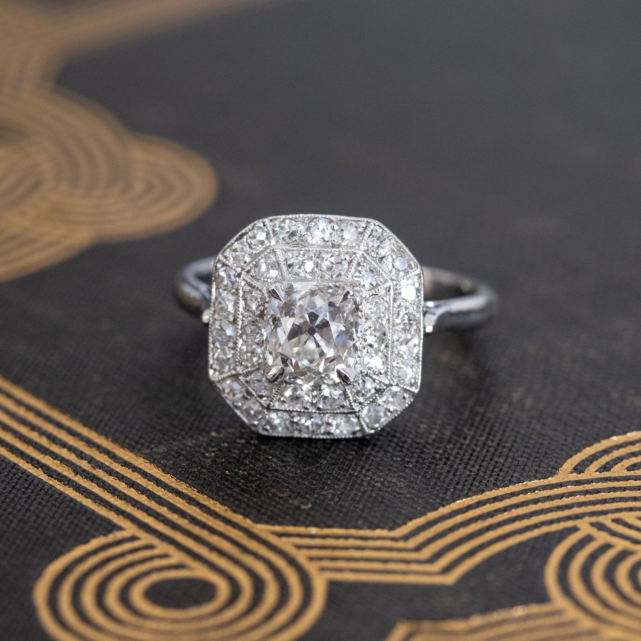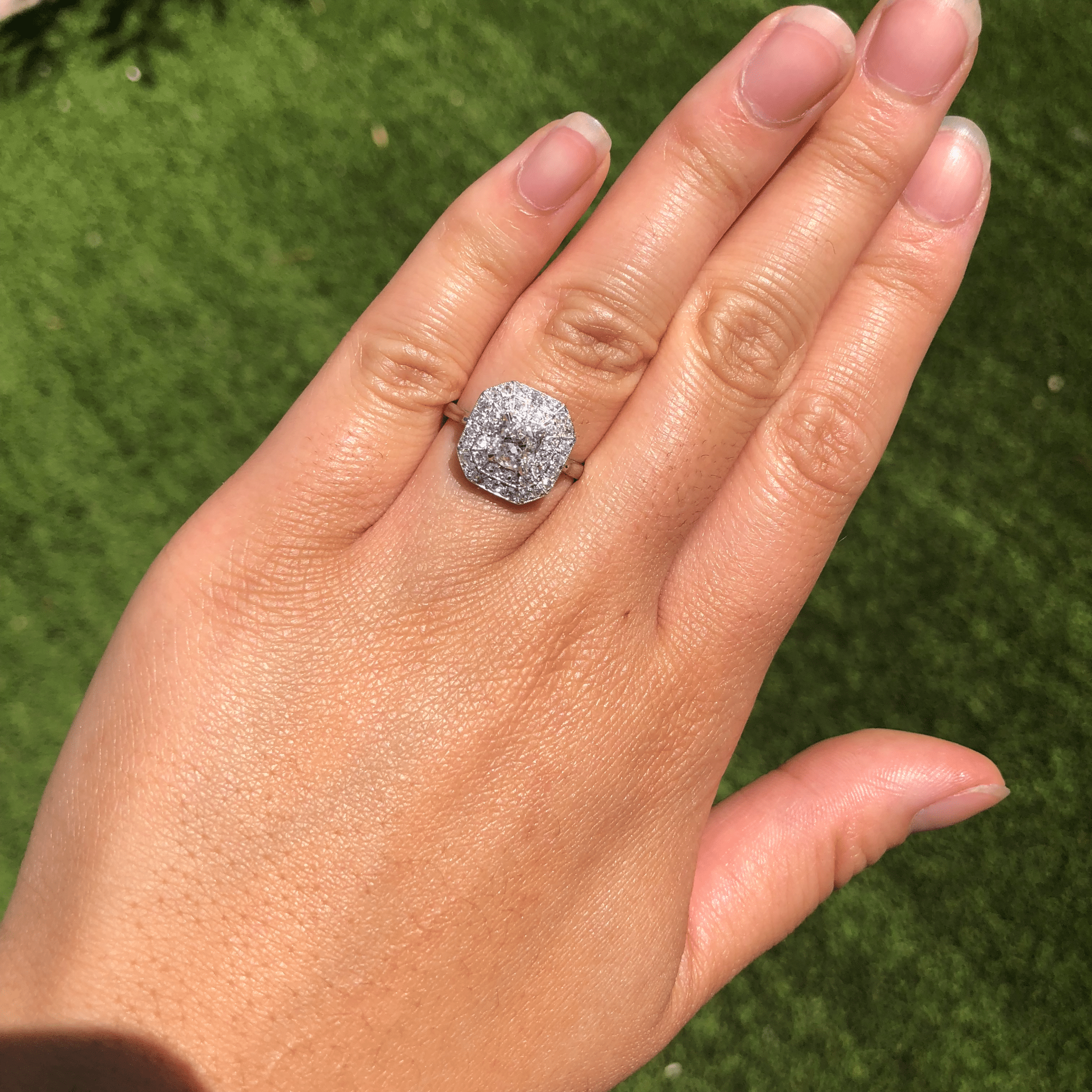 What a gorgeous ring this is! I just love everything about it - from the double frame of single cut diamonds which frame the center stone beautifully, to the geometric frame of the halo, to the chunky cushion cut diamond with so much personality and character. Center stone is GIA-certified to be J color, SI1 clarity. A ring which is both unmistakably antique yet contemporary at the same time.