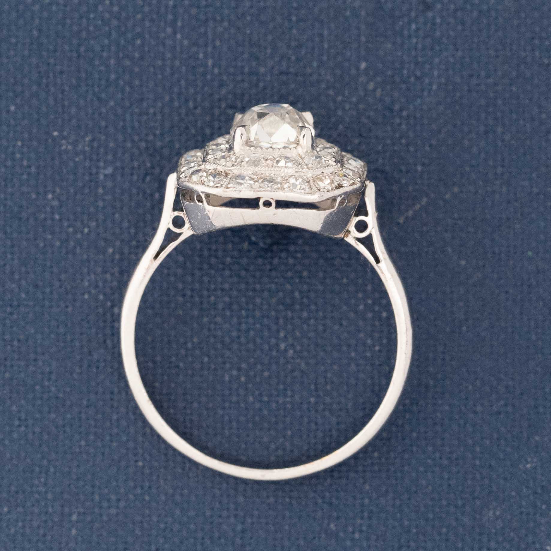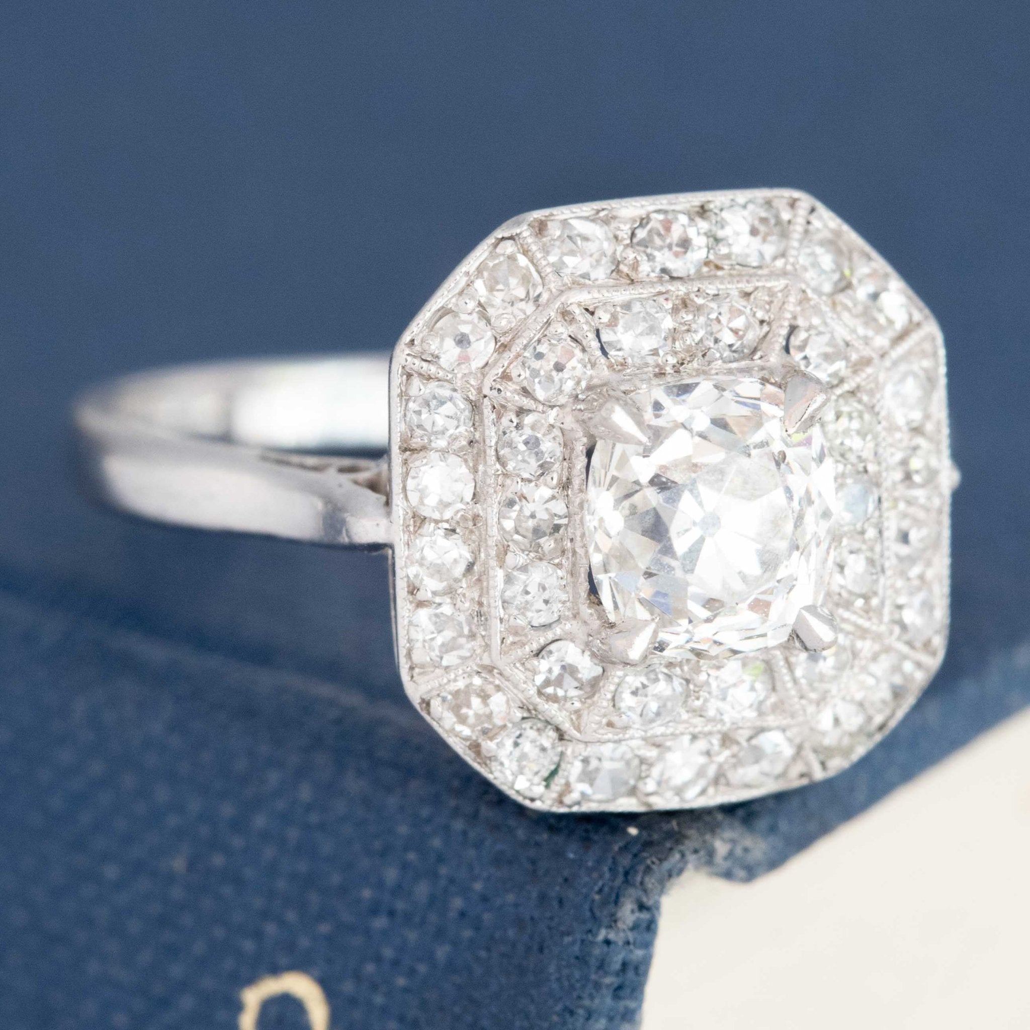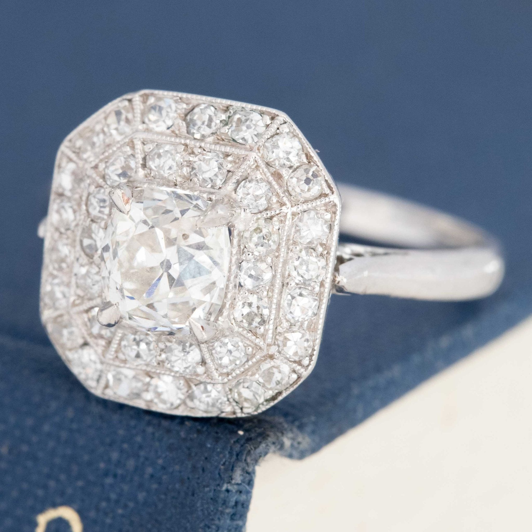 What a gorgeous ring this is! I just love everything about it - from the double frame of single cut diamonds which frame the center stone beautifully, to the geometric frame of the halo, to the chunky cushion cut diamond with so much personality and character. Center stone is GIA-certified to be J color, SI1 clarity. A ring which is both unmistakably antique yet contemporary at the same time.