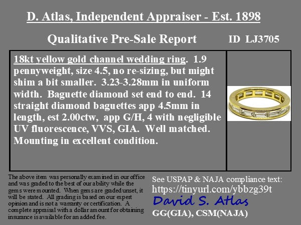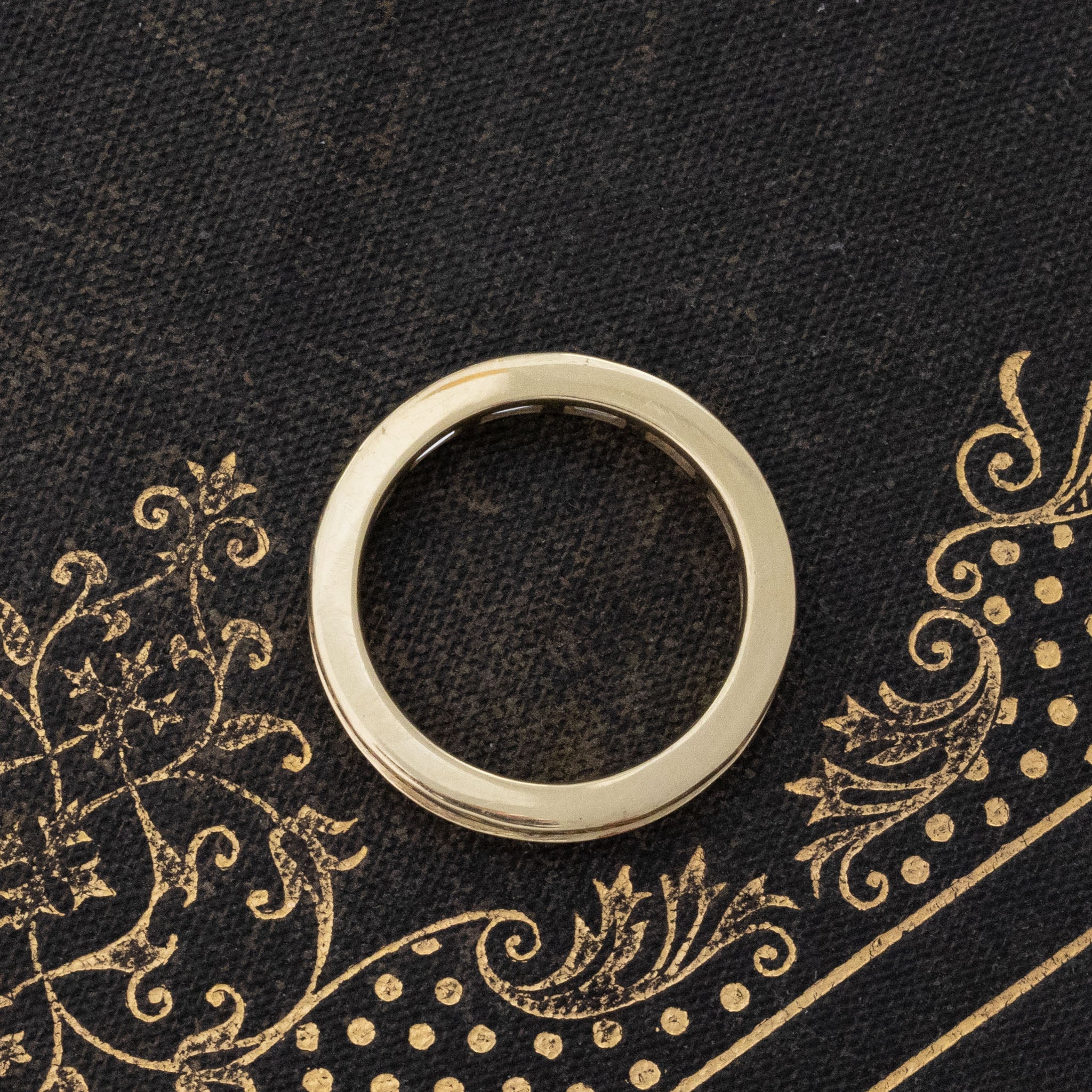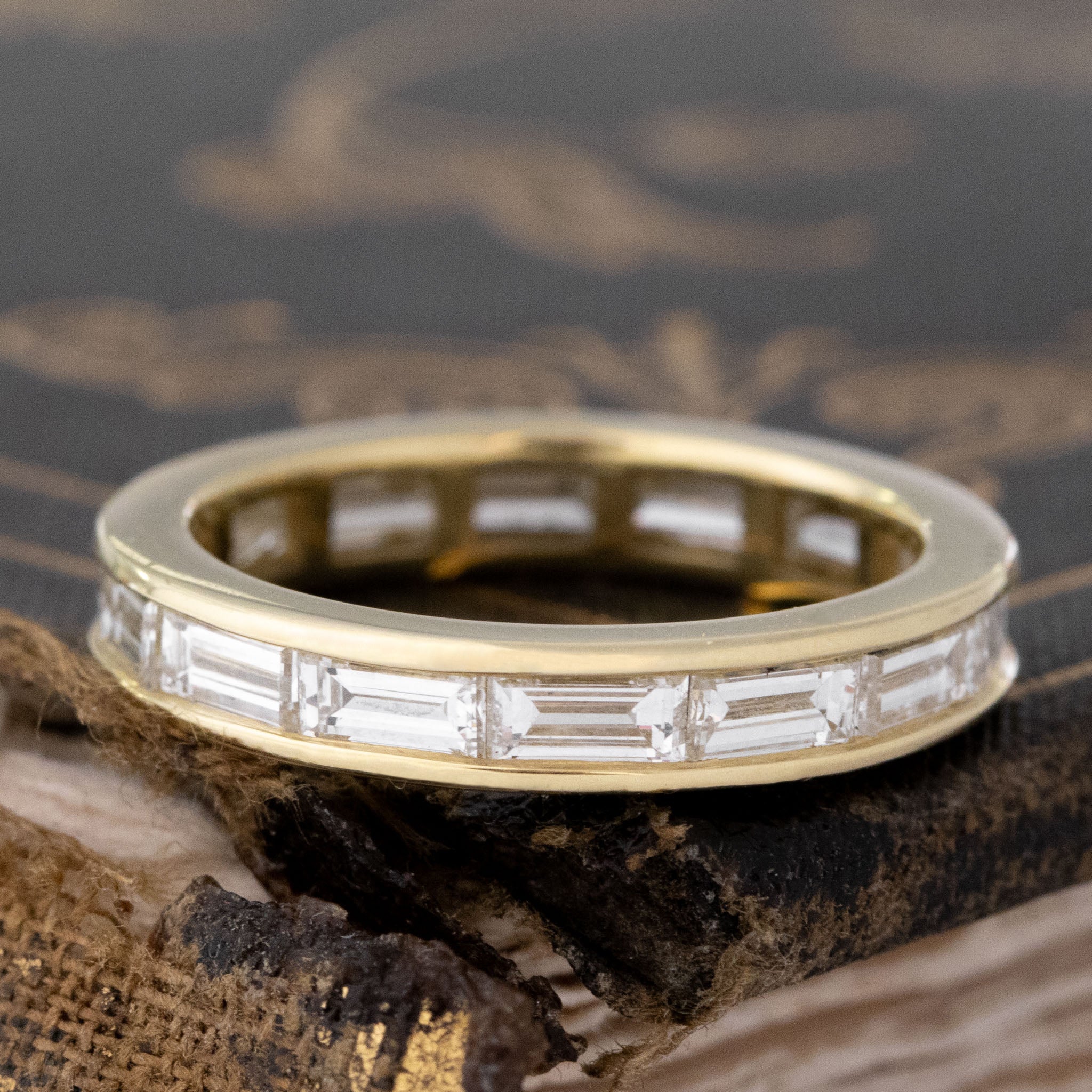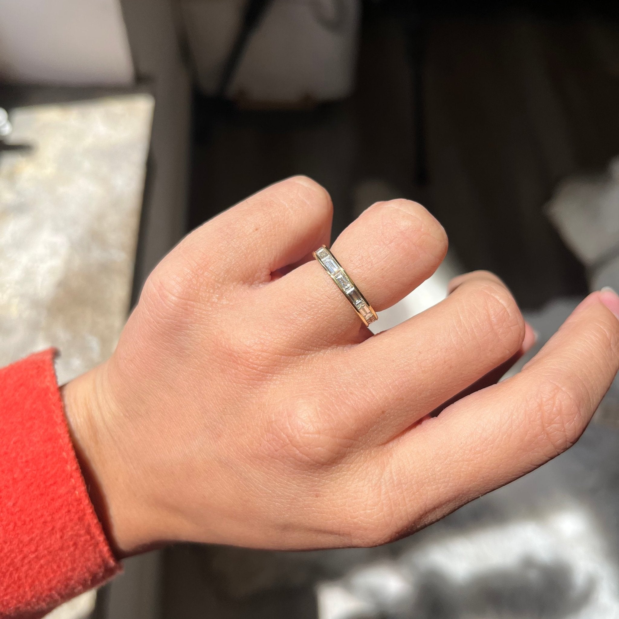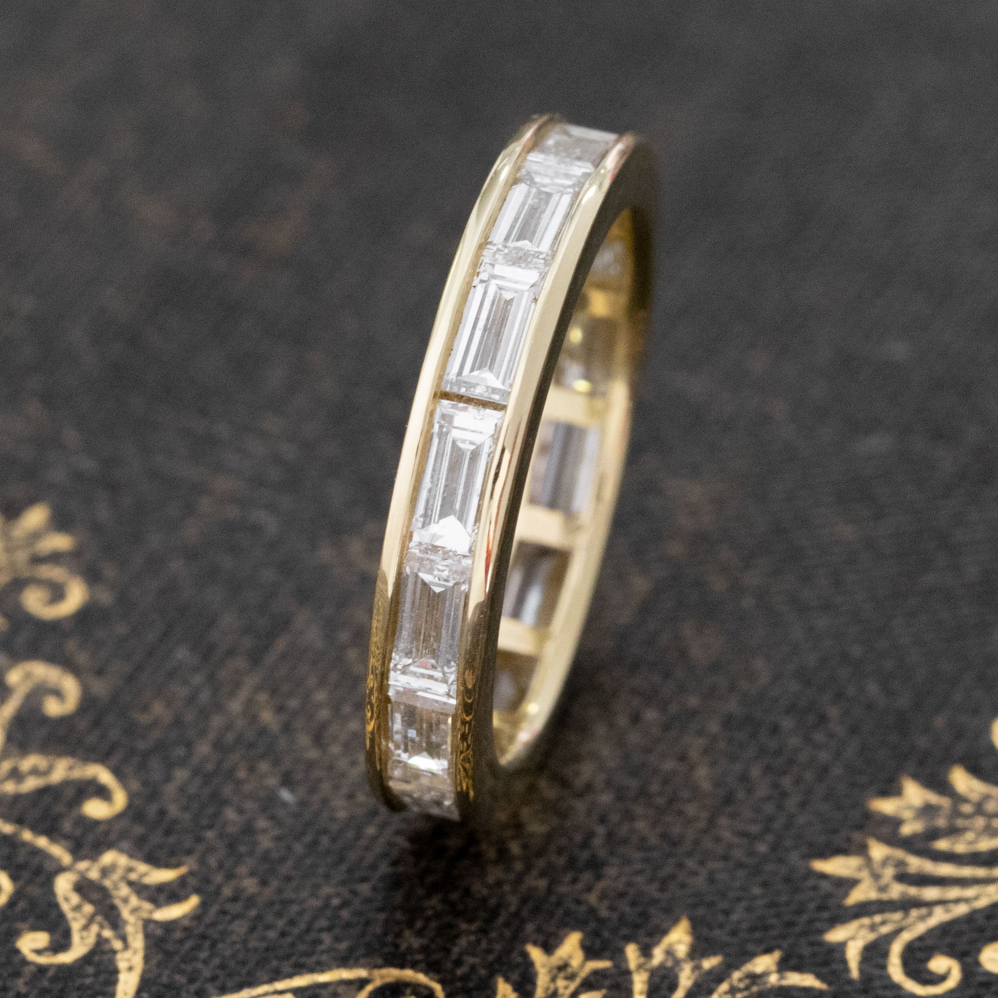 A simple and sleek diamond eternity band., using baguette cut diamonds set east-west! The perfect stacker with a subtle and sleek sparkle, set in yellow gold. The diamonds themselves are white, bright and prismatic - and contrasted against that yellow gold, we’re totally in love. Low-set and oh so comfortable on the finger.