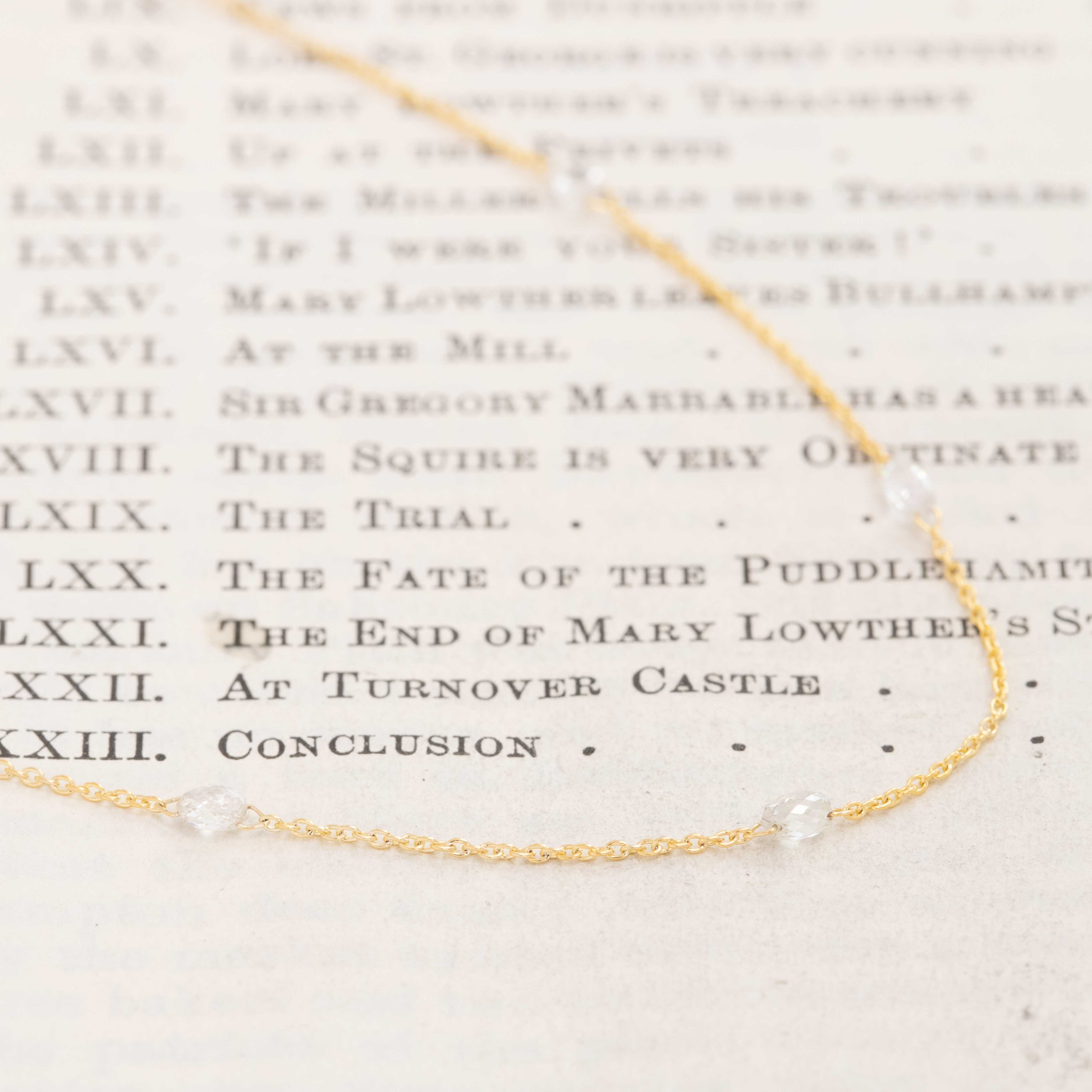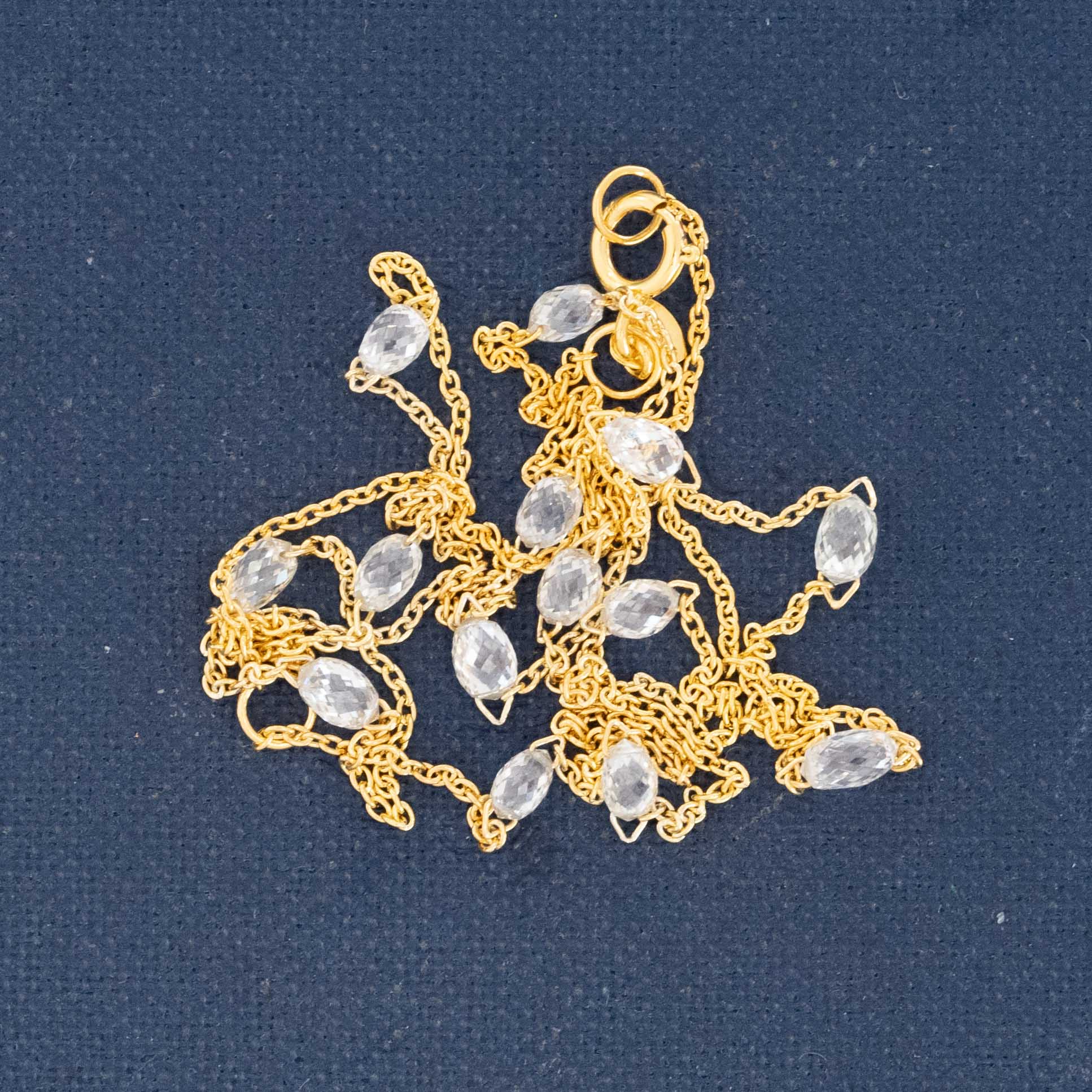 Another beautiful, romantic and understated station necklace set with diamond briolettes in 18kt yellow gold. The diamonds all shimmer softly with every movement, and you get full coverage as the diamonds are all spaced throughout the necklace. Perfect worn solo for just a little *bloop* of sparkle, or layered with other pieces.