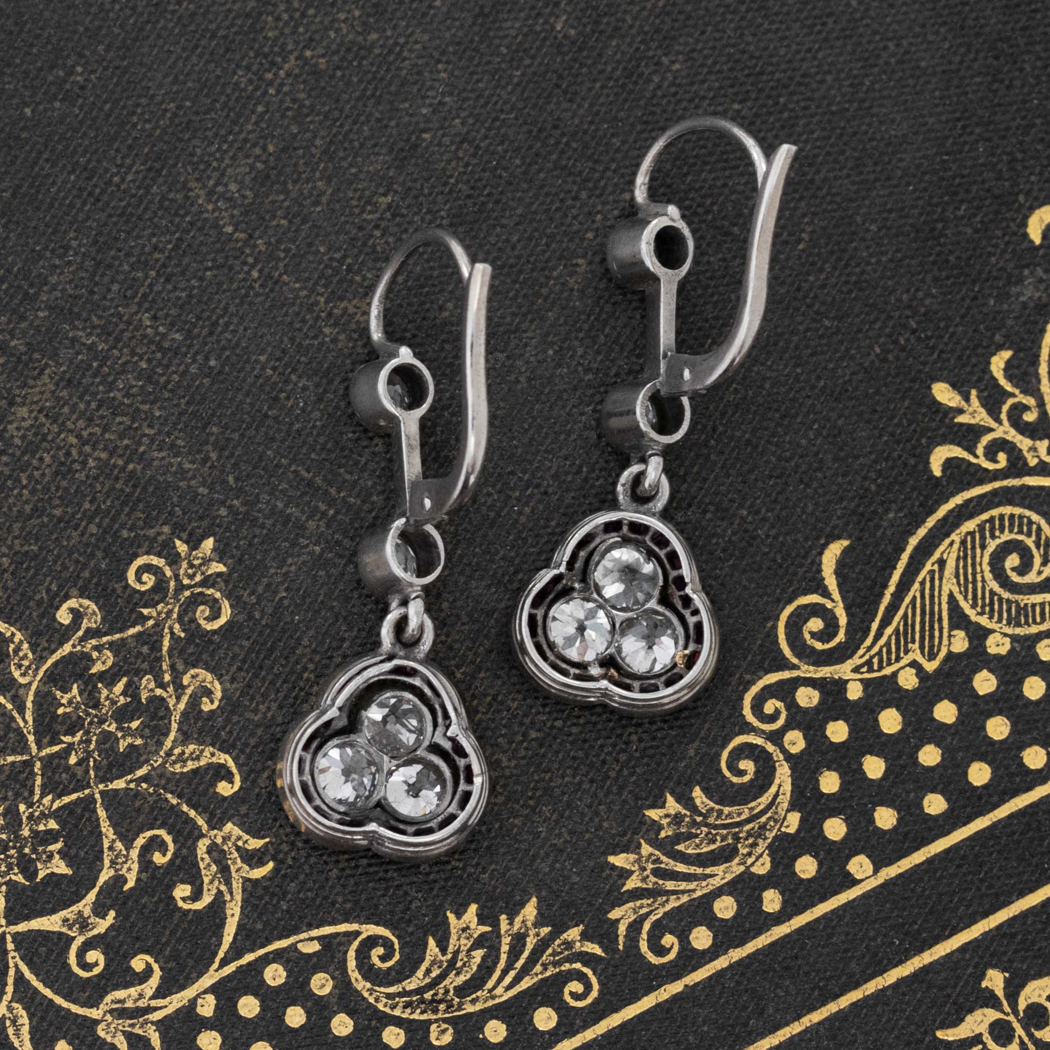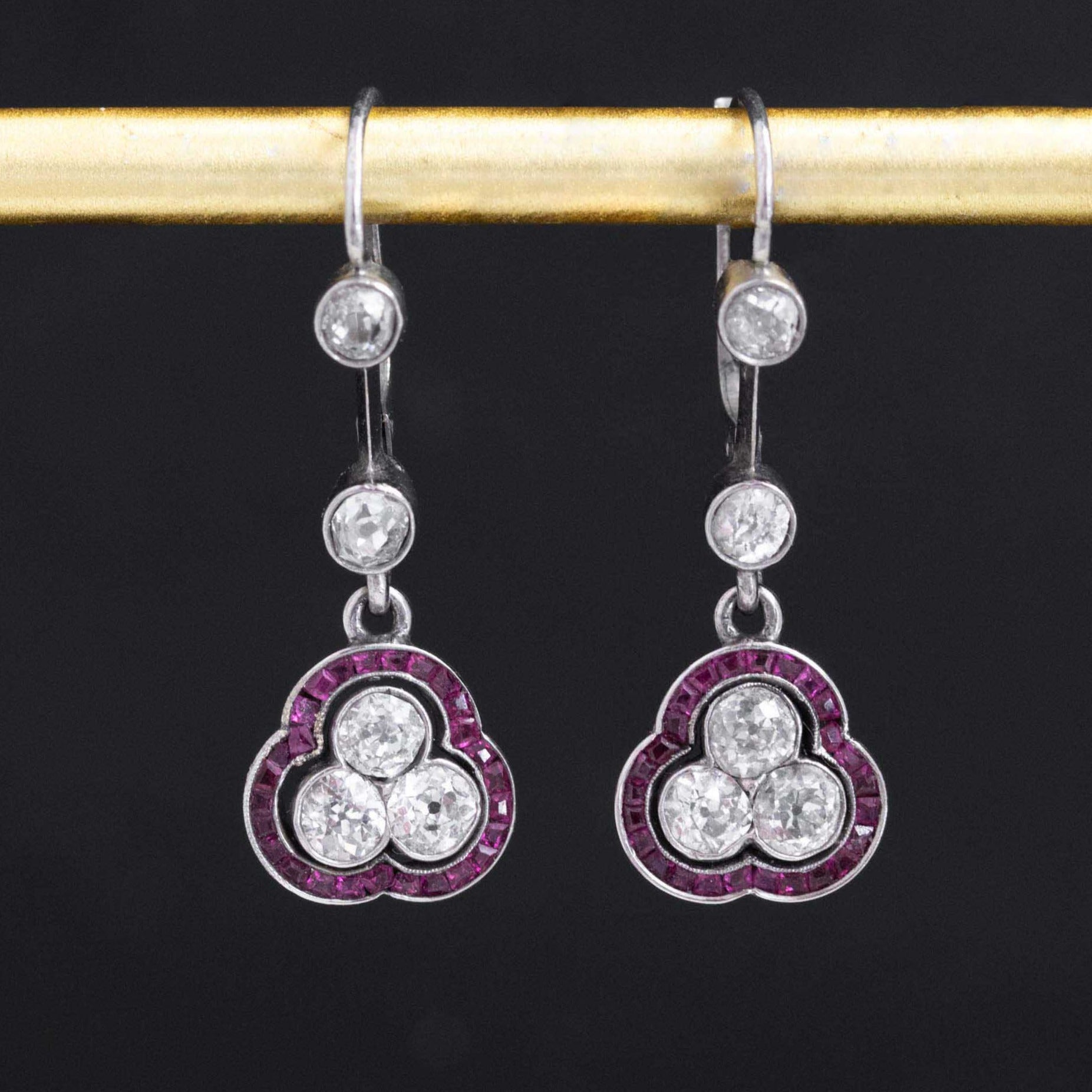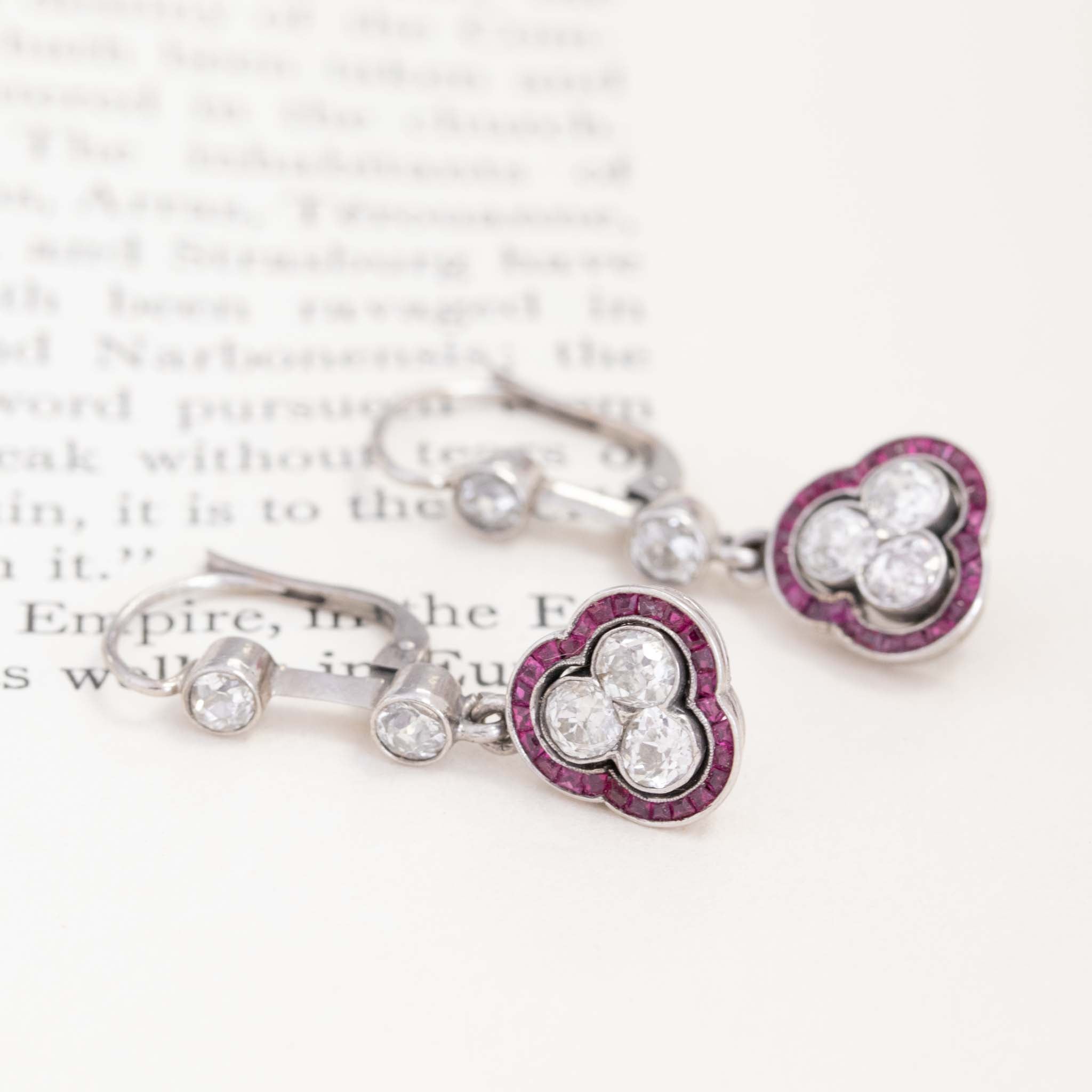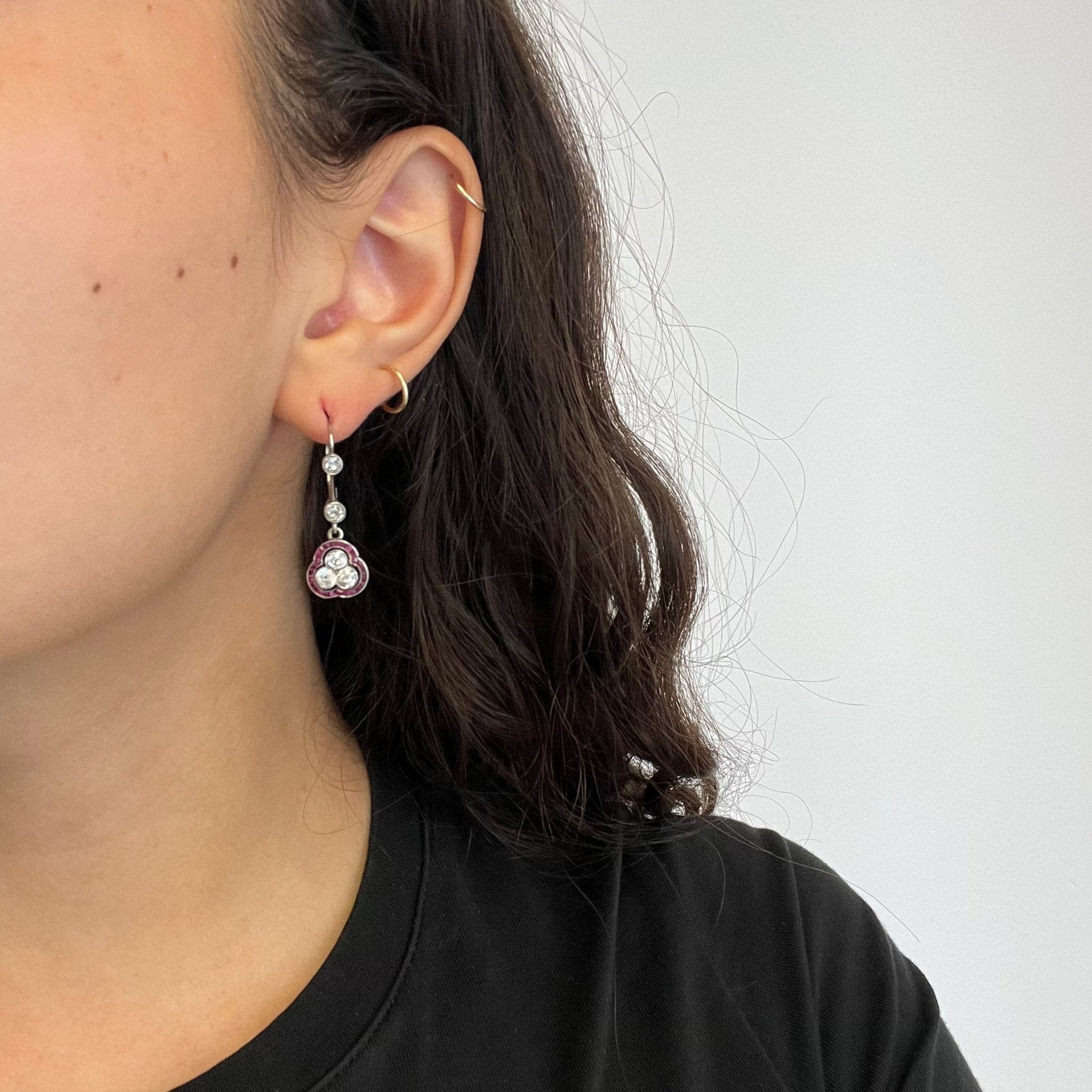 Such a sweet pair of vintage earrings - easy breezy for daily wear, while still packing quite the sparkly punch! Each drop components houses a trio of chunky and white old mine cuts, The trefoil motifs sit in bezels with a channel-set halo of rubies as the drop component, making for charming articulation and sparkle with each movement. Two more bezel set old mines are stations along the lever backs per earring, and we’re quite obsessed.