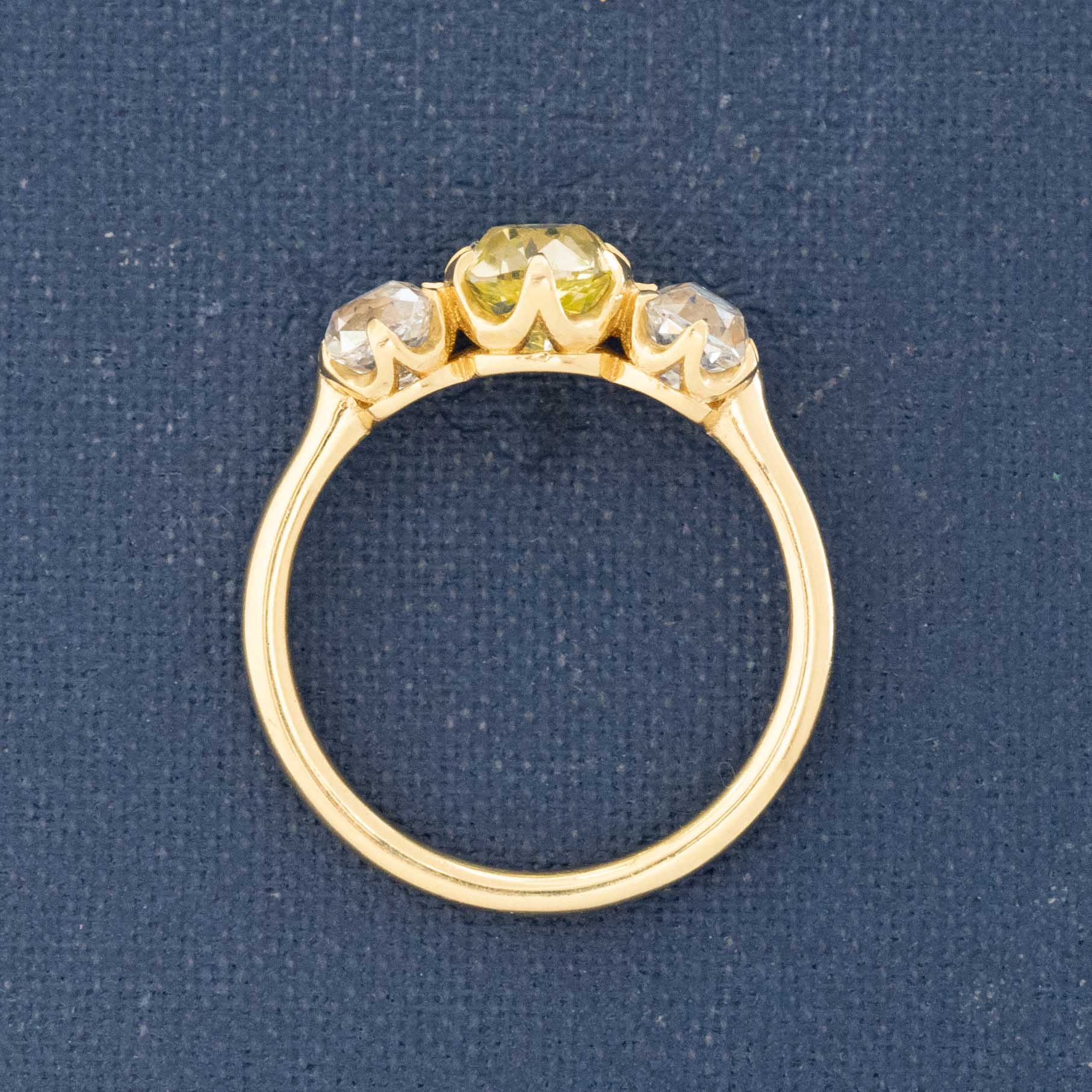One of the prettiest trilogy rings to ever come out of production! A 1.01ct fancy greenish yellow old mine cut is flanked by 2 icy-white stones, perfectly proportioned. The end result is a ring that is unique and ultra flattering on the finger to boot. The center diamond has the brightest, richest yellow color - on the finger, its like wearing sunshine, a sparkle bomb!