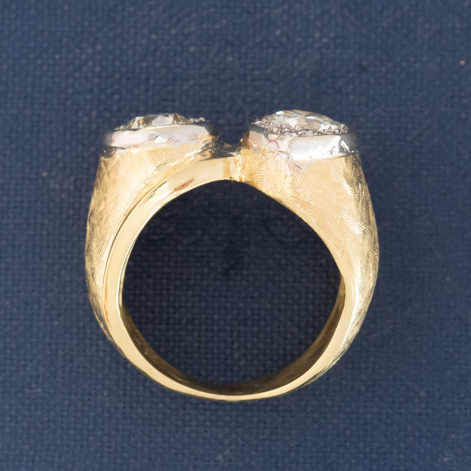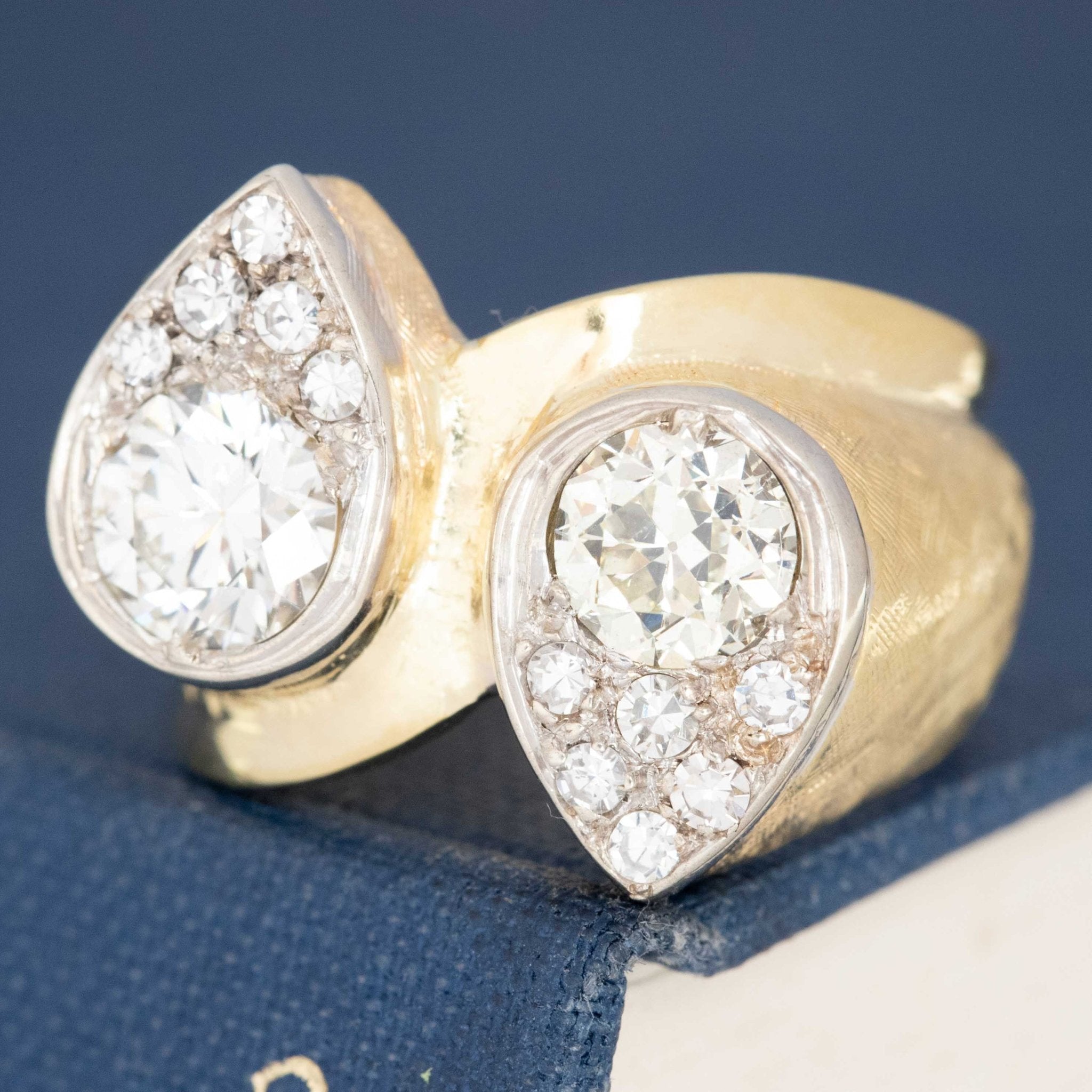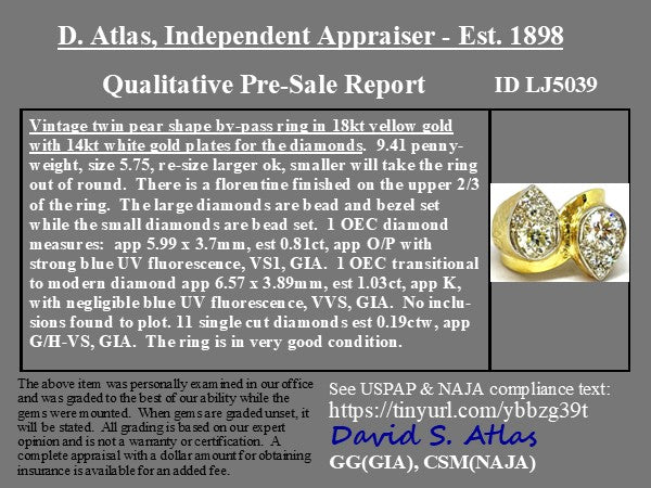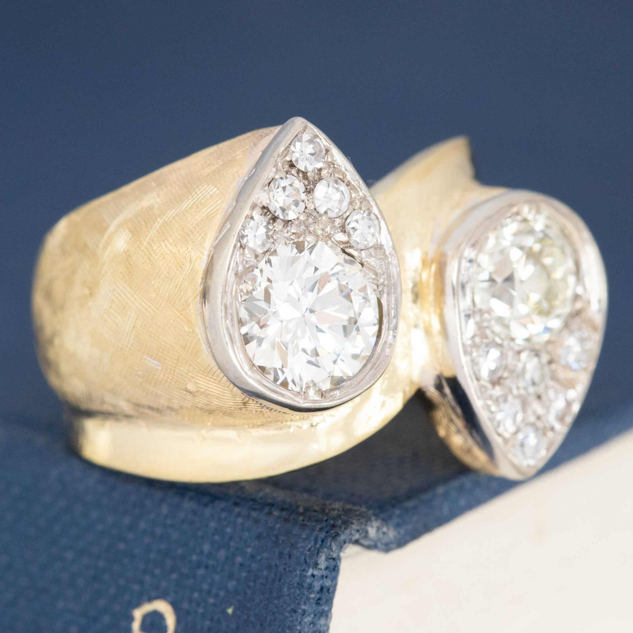A chunky vintage bypass ring with two pear-shaped components sitting front and center! Each one contains a fiery OEC diamond accented by five baby single cuts. One of the most unique and super interesting rings we currently have in our collection, and a most charming ring for those who need both sparkle and presence! We love how powerful this ring feels on the finger.