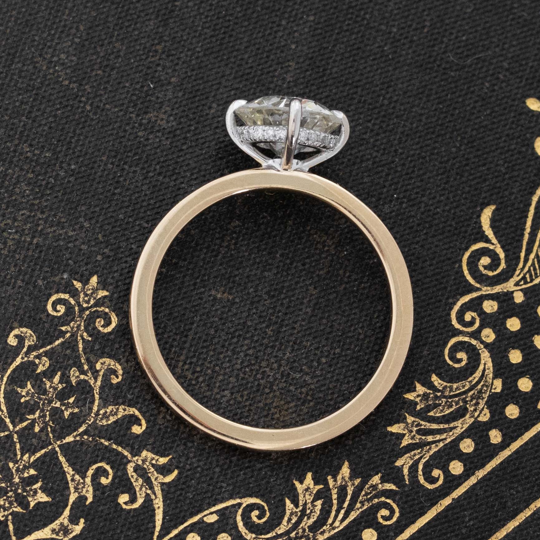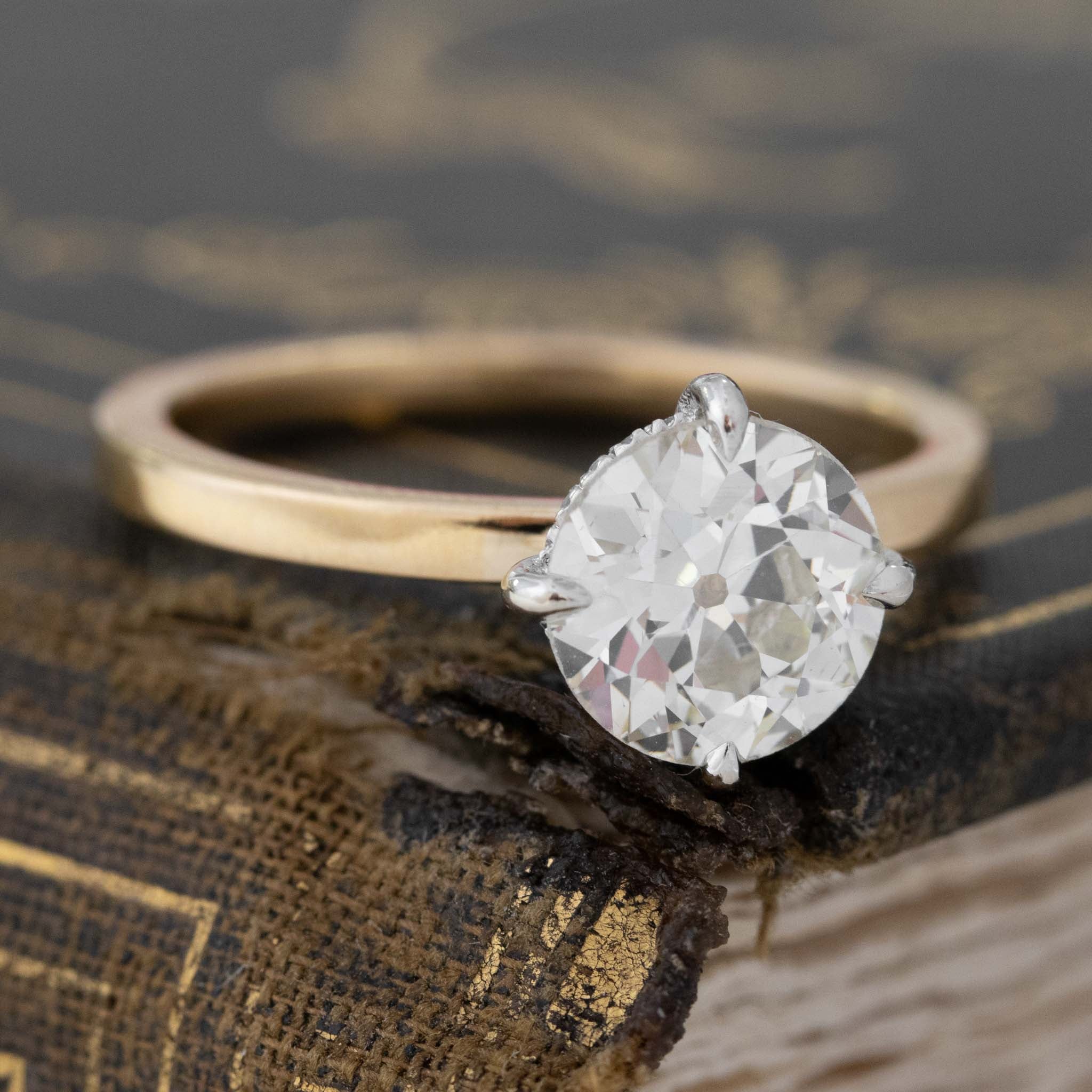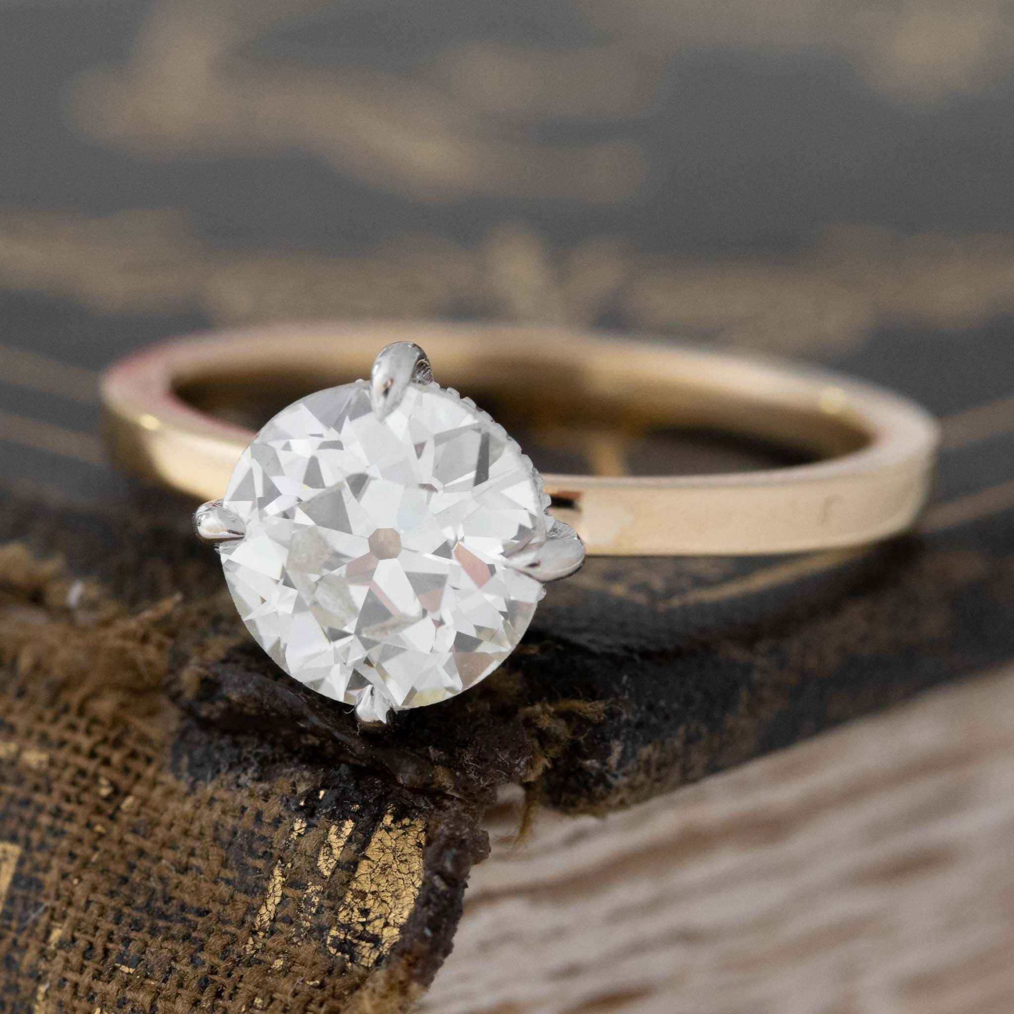 A beautiful Old Euro solitaire with classic details! A two-tone mounting in 18kt gold with a hidden halo along with the gallery and claw prongs at the NSEW points. The diamond itself has a cool, ivory face up color that is brightened by its’ white gold gallery, and extra sparkle coming in from the hidden halo!
