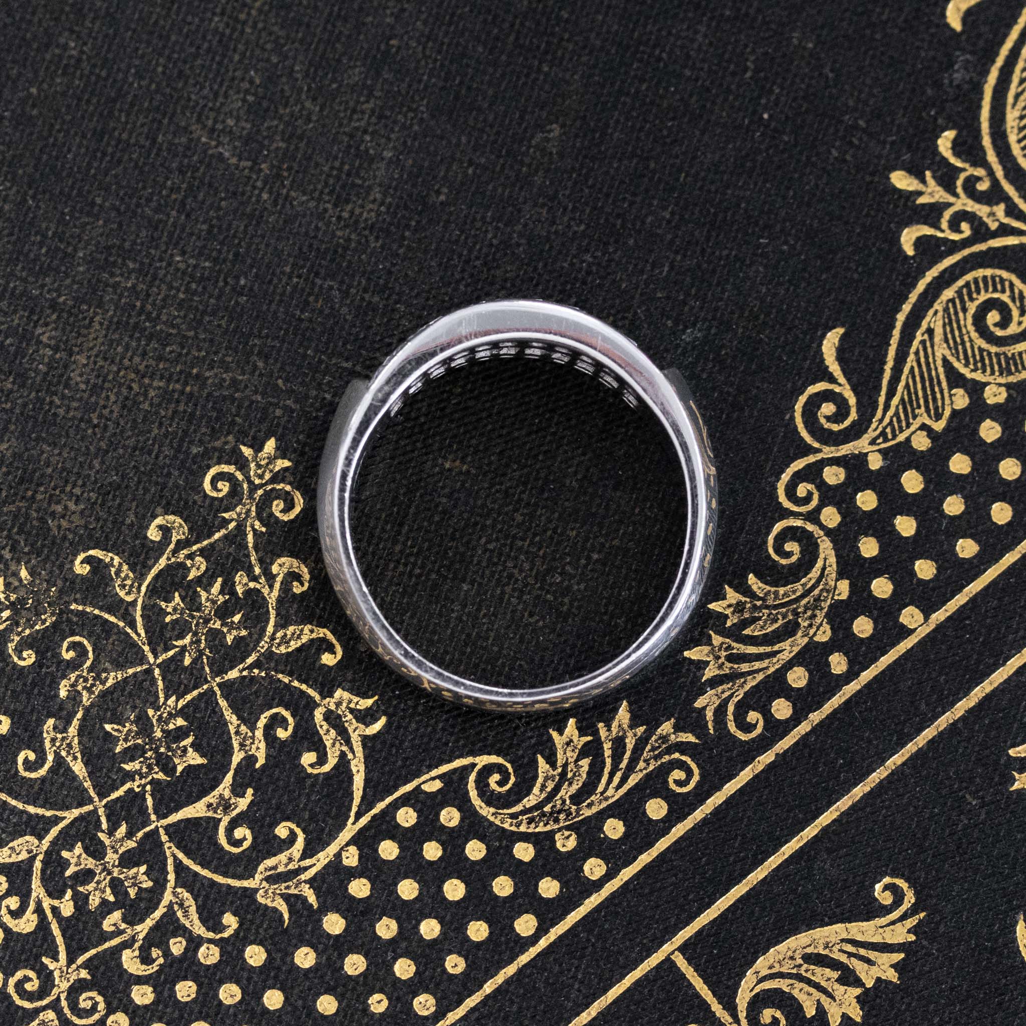 A wide band with 3 rows of diamonds - what more can one ask for? A row of baguette diamonds are set in between 2 rows of princess cuts, all adding to nonstop sparkle. Perfect for that finger looking for big sparkles!