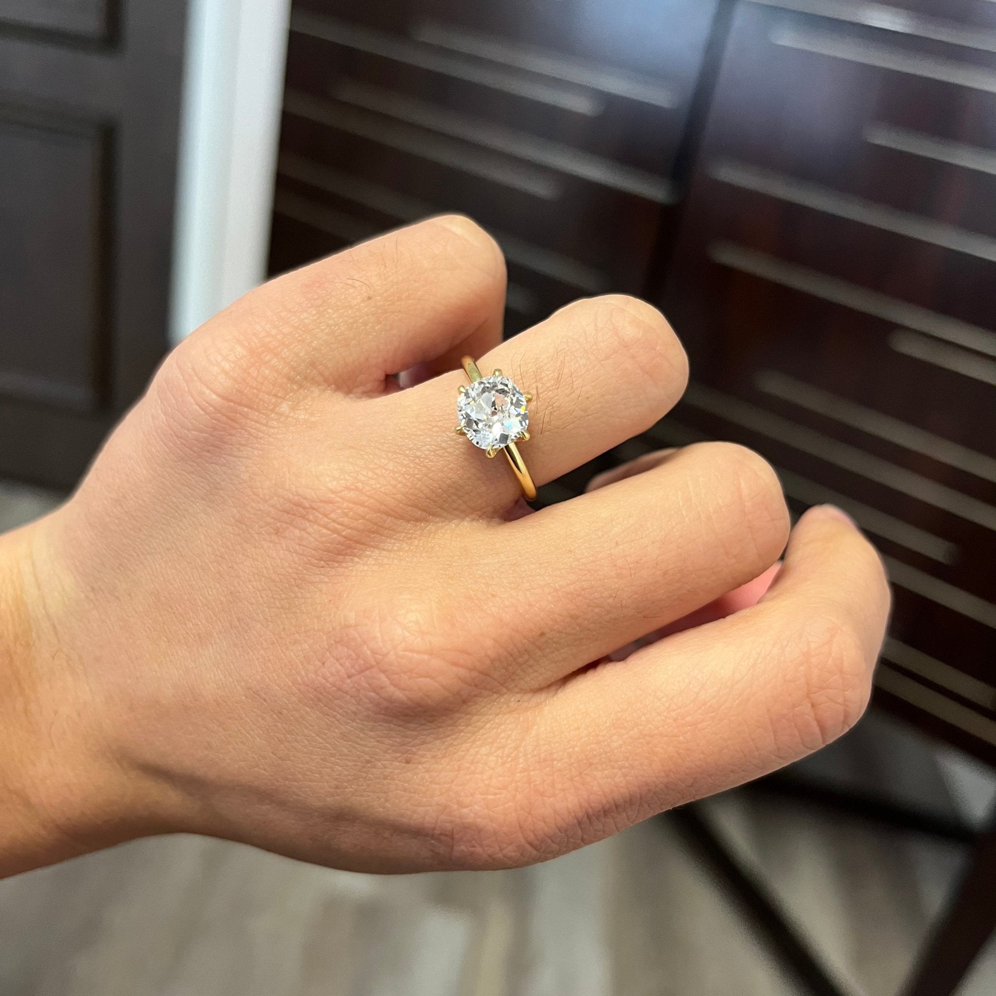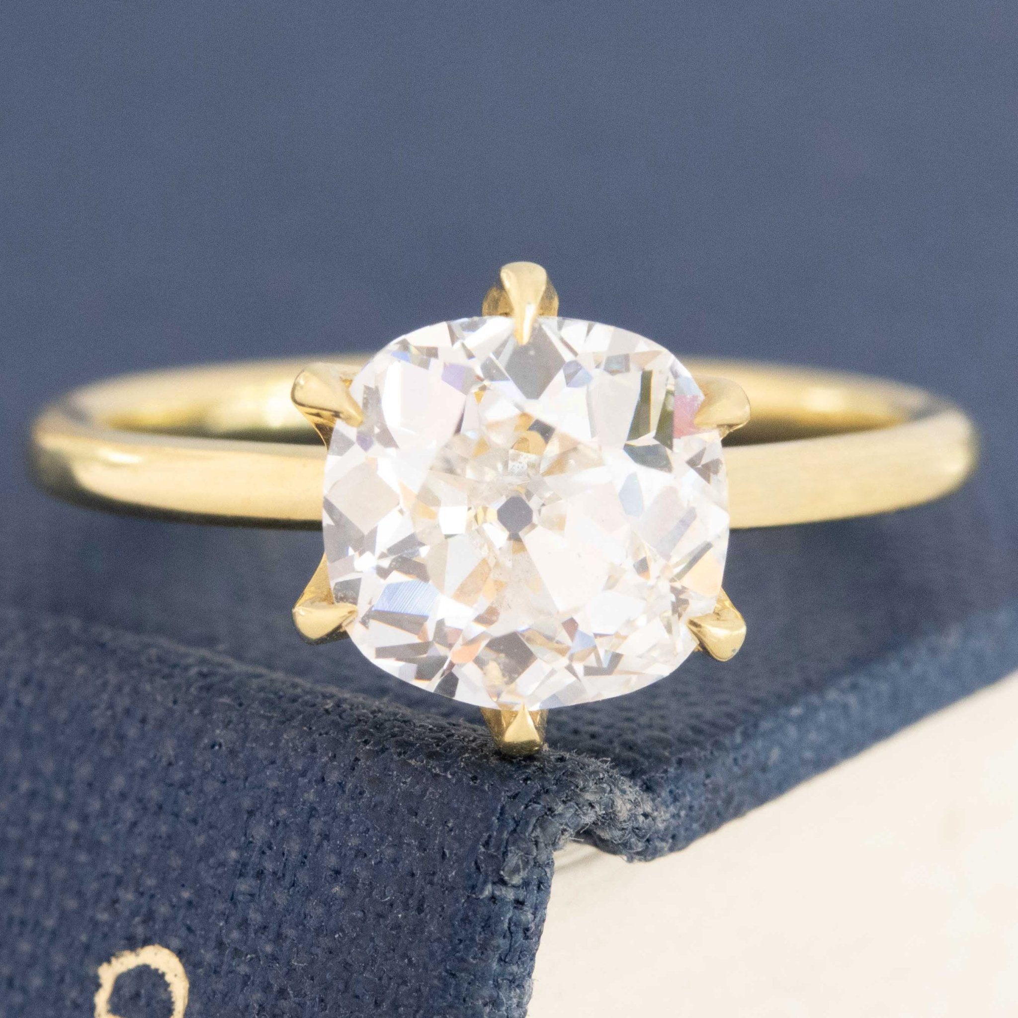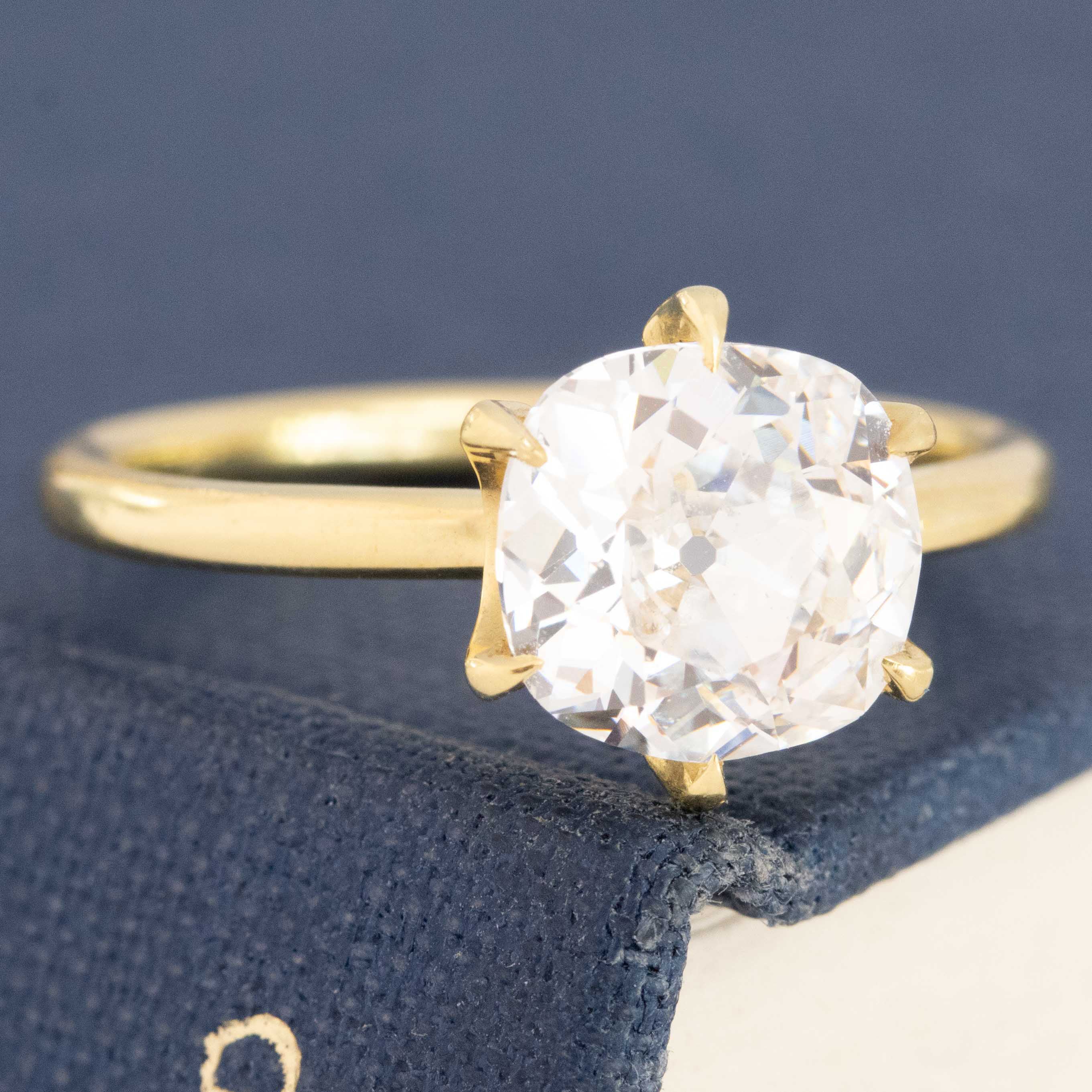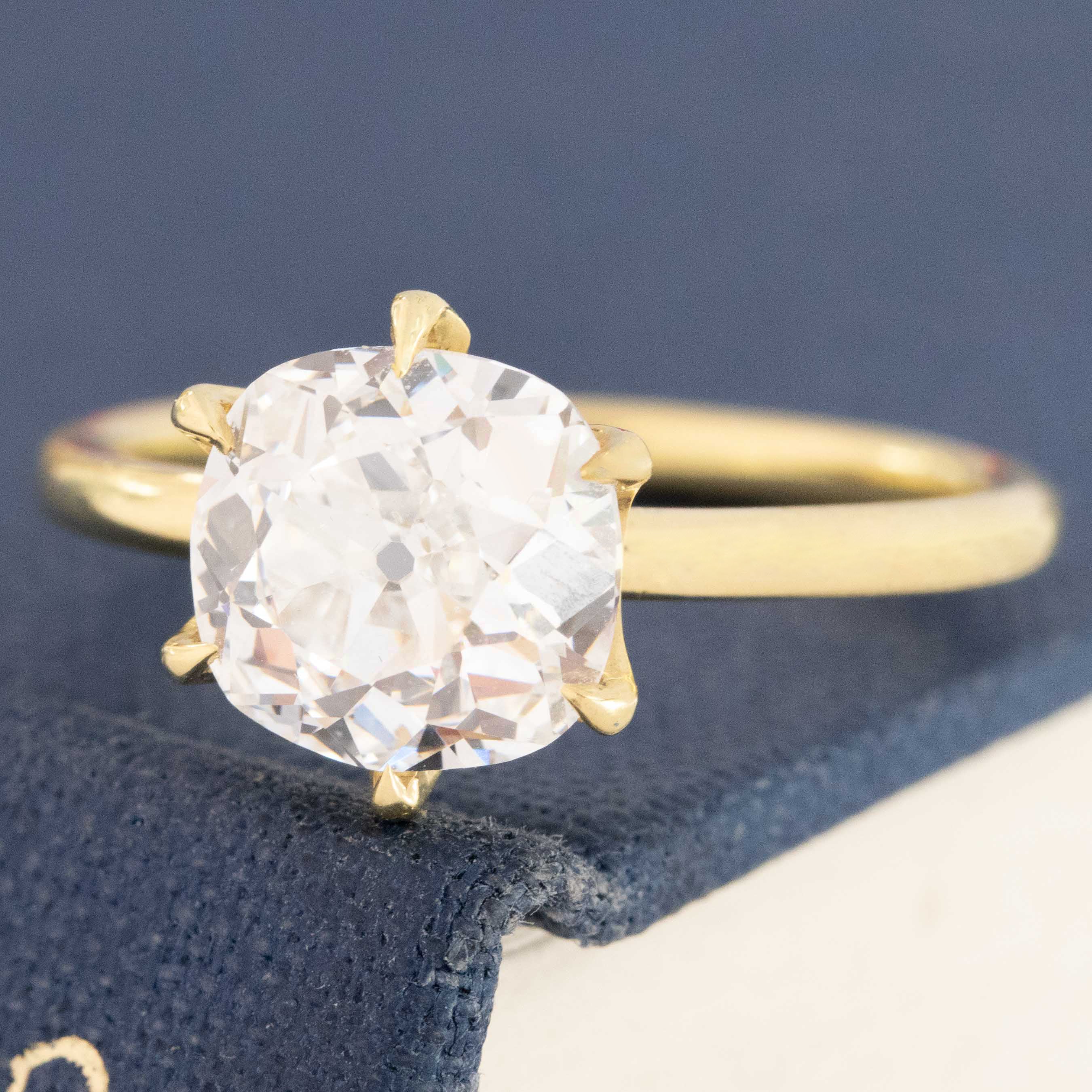 Its pretty hard to get any more special than this stunning solitaire! A rare, high color old mine cushion is clearly the focal point, with its icy-white face up picking up colors of the rainbow from its surroundings and throwing it back to the wearer. Classic cushion-y shape diamond - unbelievably beautiful on the finger! And will stack beautifully with a wedding band as well. Set in a timeless 6-prong solitaire with claw prongs and a low, swoopy gallery.