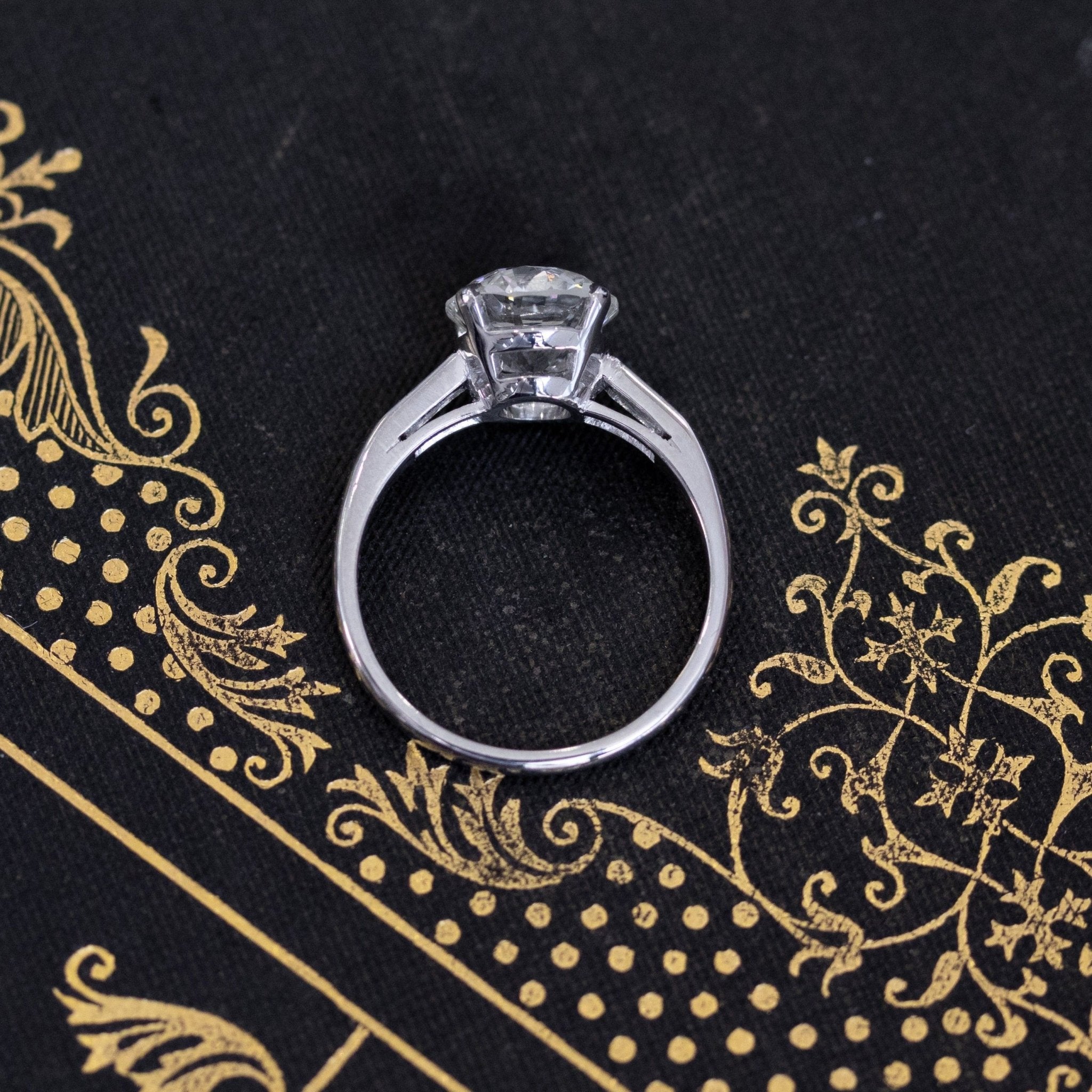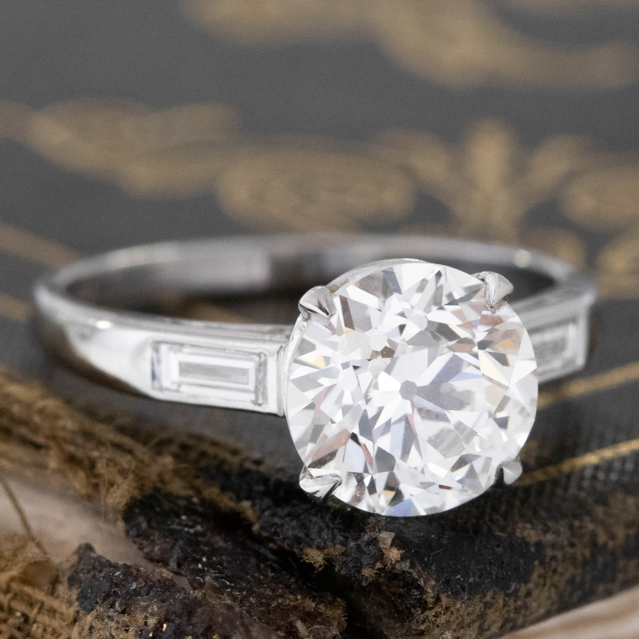 One of the most timeless and elegant solitaire styles - a simple and clean-lined style with tapered baguettes on the shoulders, allowing the central diamond to remain the main attraction. This ring showcases a stunningly and perfectly faceted old European cut diamond with that much desired flowery facet pattern under the table, twinkling softly with each movement. Sharp contrast zones which appears to be twinkling on and off with each movement, and a great higher color and clarity combo to bot! A gorgeous ring with which a band will sit flush against.