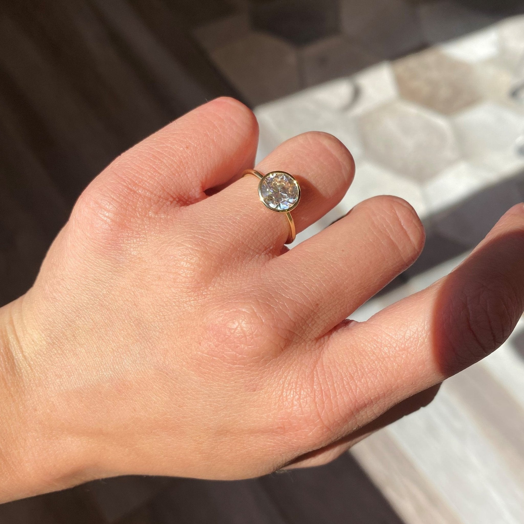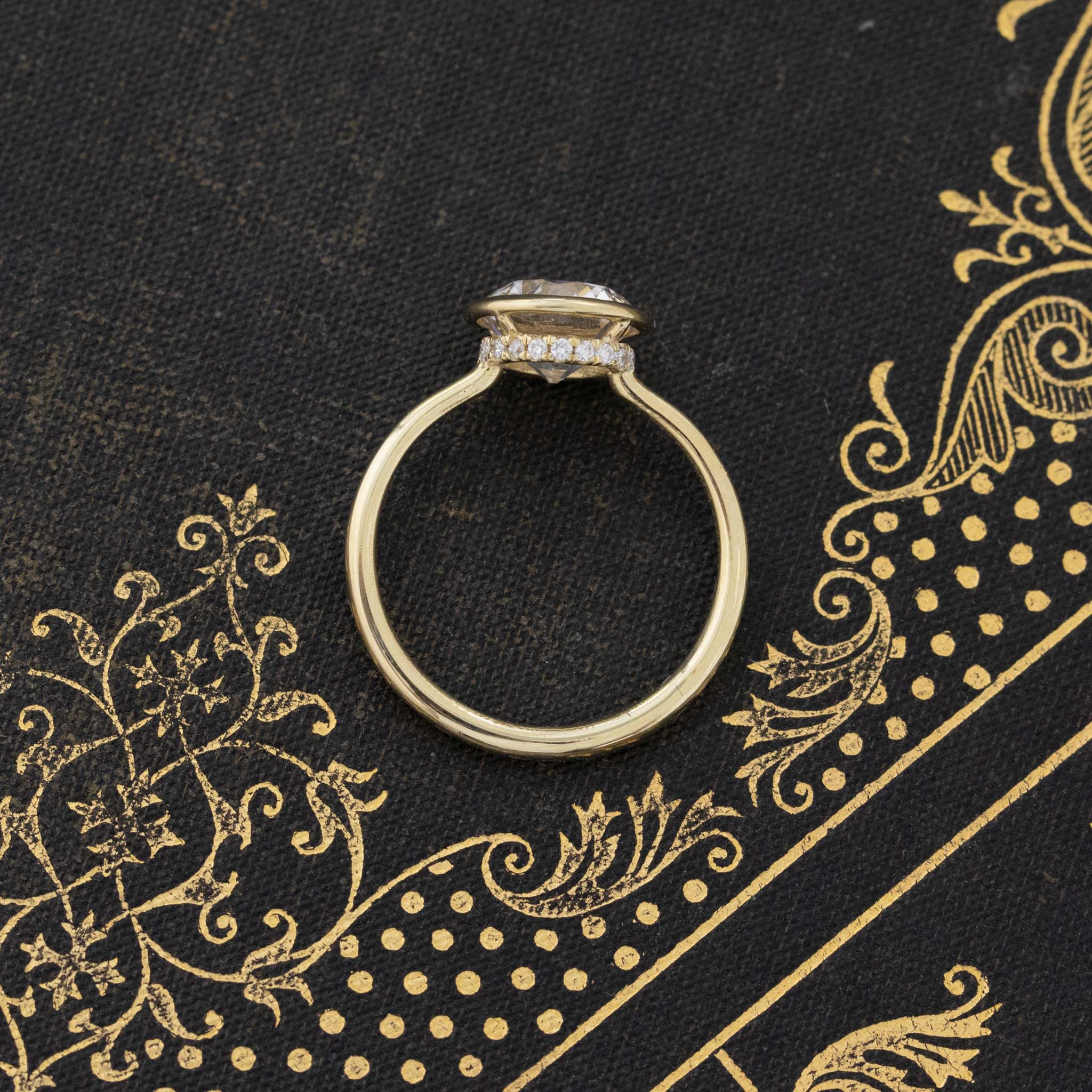 Timeless, but with a modern vibe! We took this gorgeous old European cut diamond and set her in our popular sleek bezel setting, adding a hidden halo of pave diamonds along the collar (because who doesn't wanna see extra sparkle from the profile?). The diamond has a gorgeous make, with the facets twinkling on and off with every movement - super bright and lively diamond!
