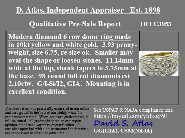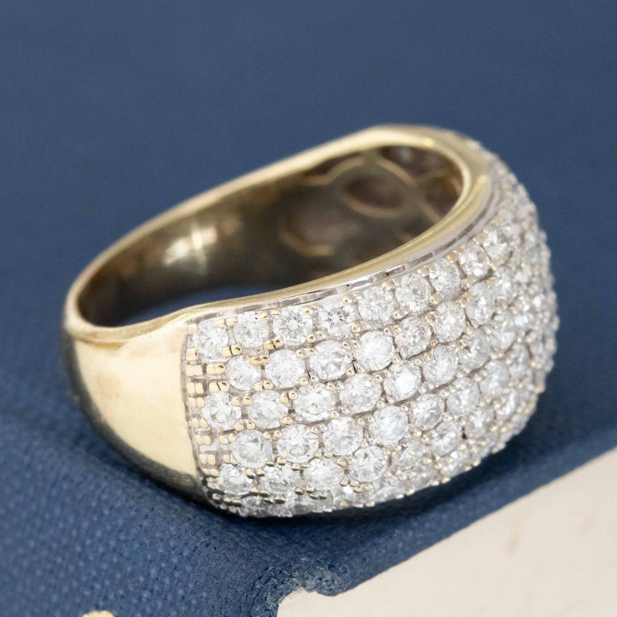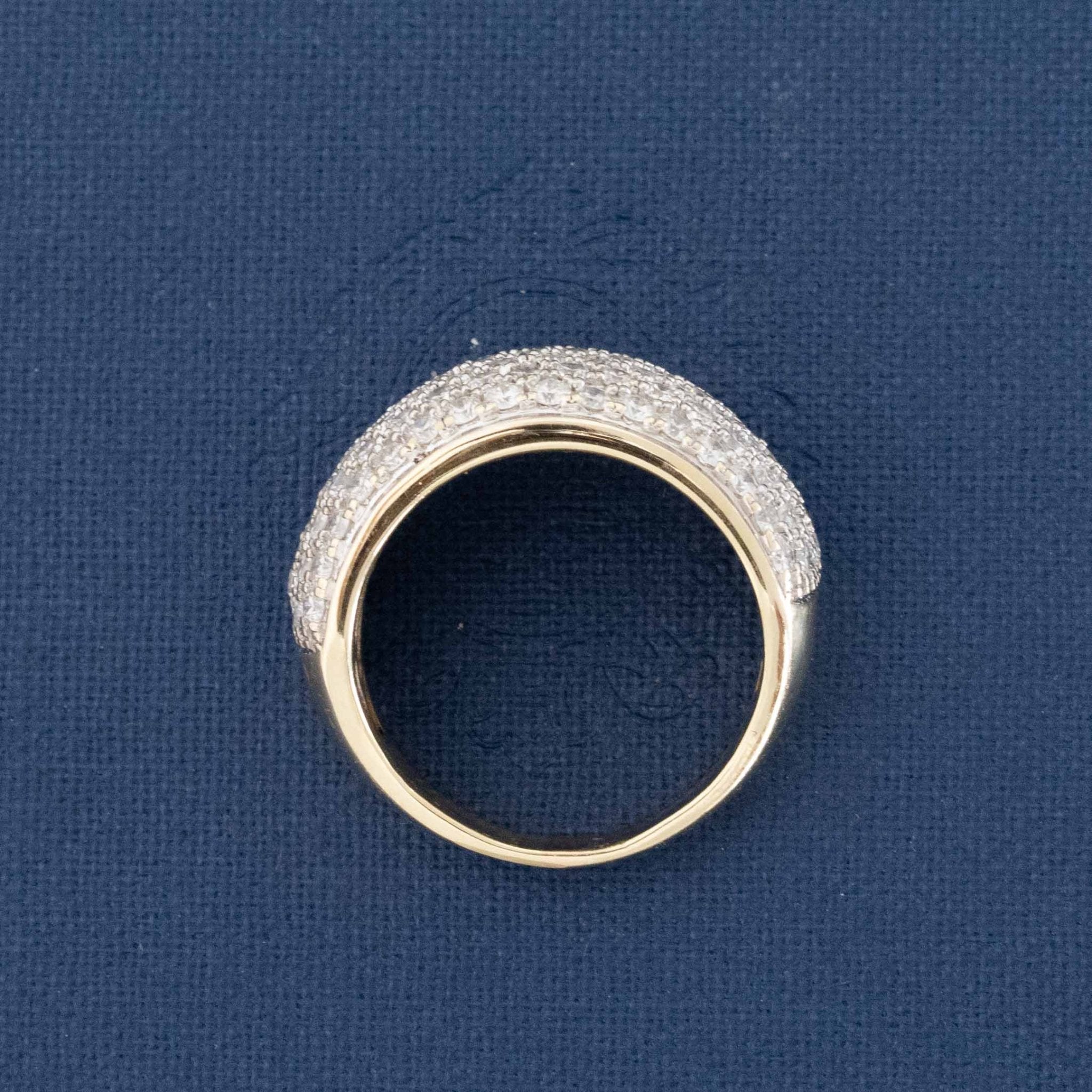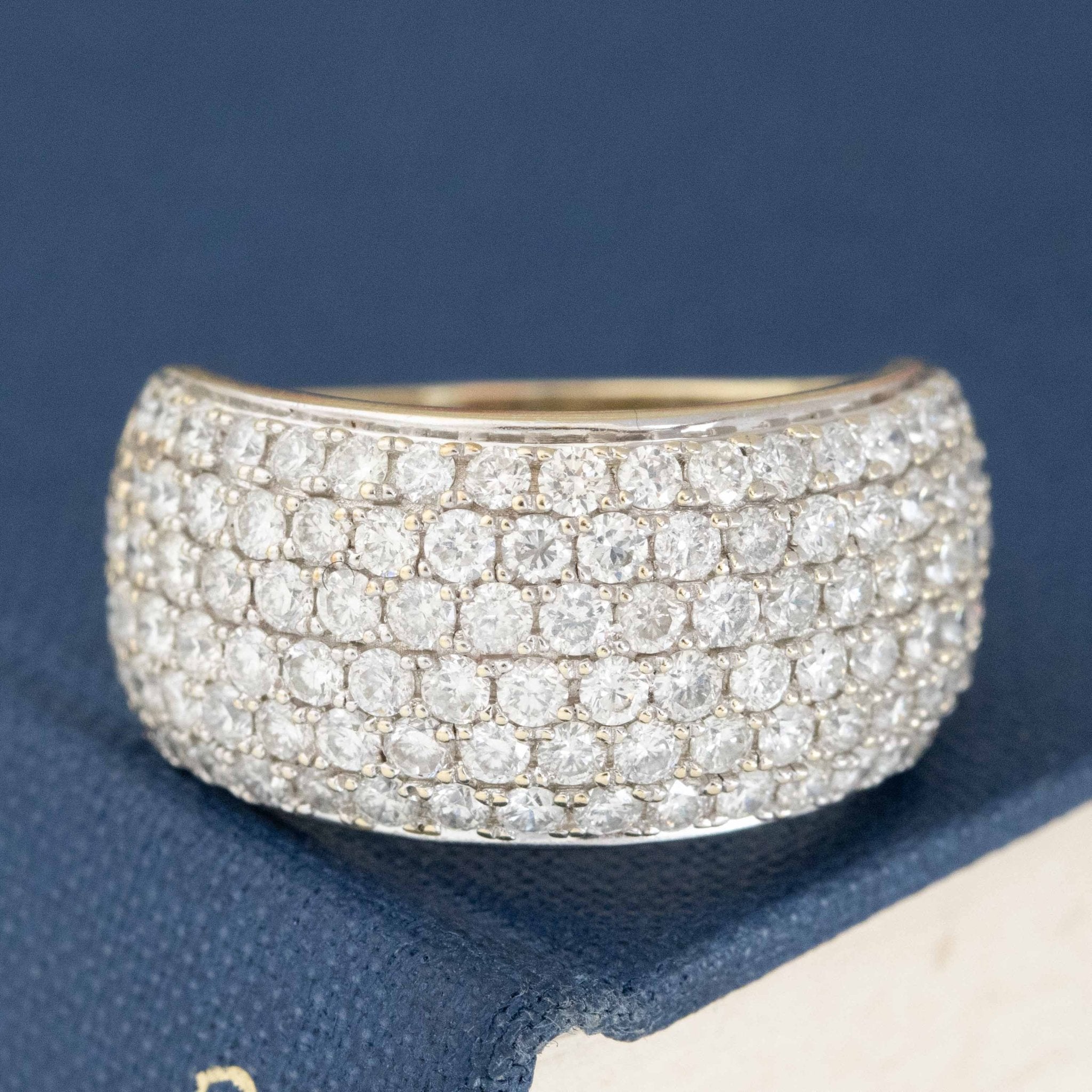 A pave diamond dome band, perfect for those looking for a big, diamond-heavy look on the hands! The two-tone gold adds a nice touch of visual contrast on top of the uber-sparkly diamods - comfortable to wear and a great propotion on the fingers. Such a fab look on the finger.