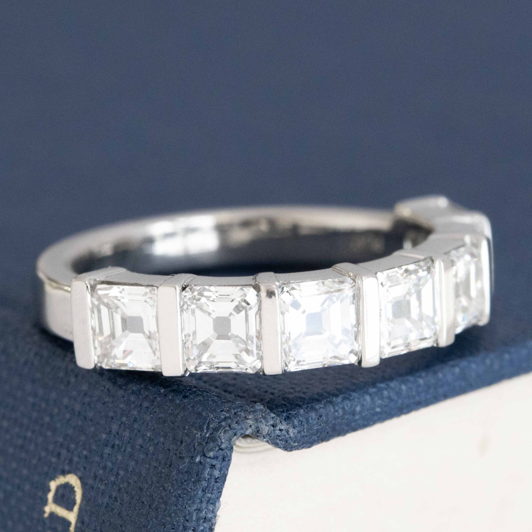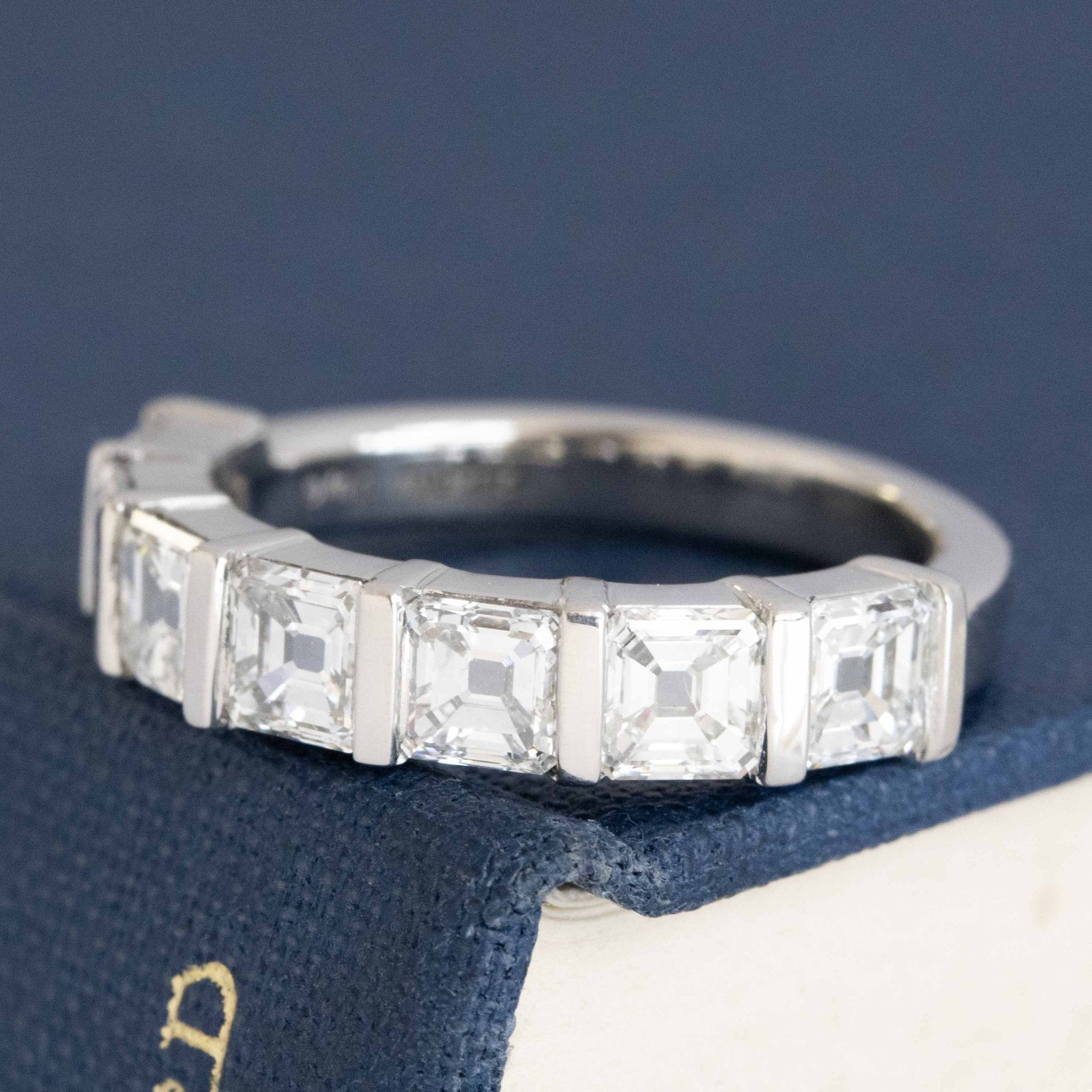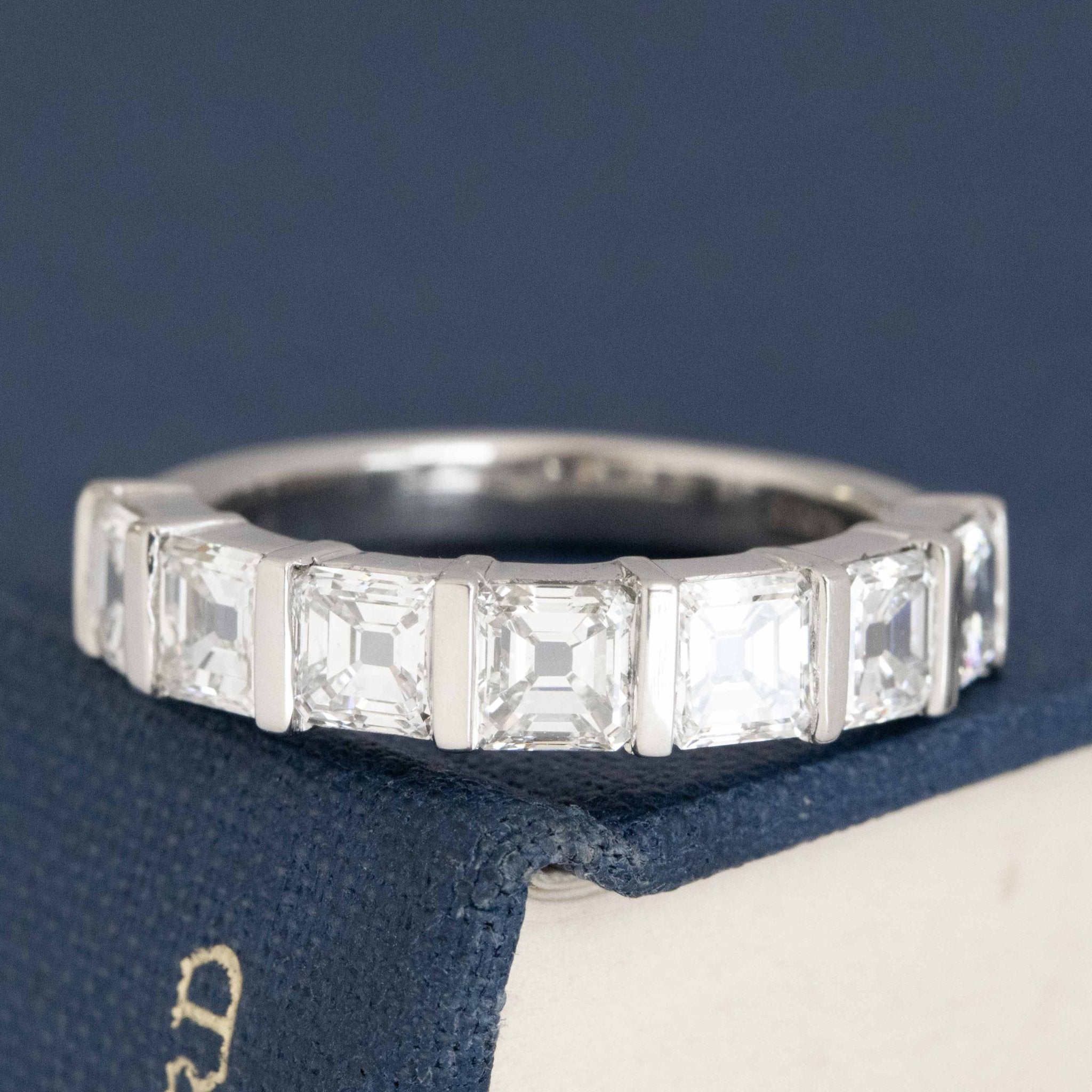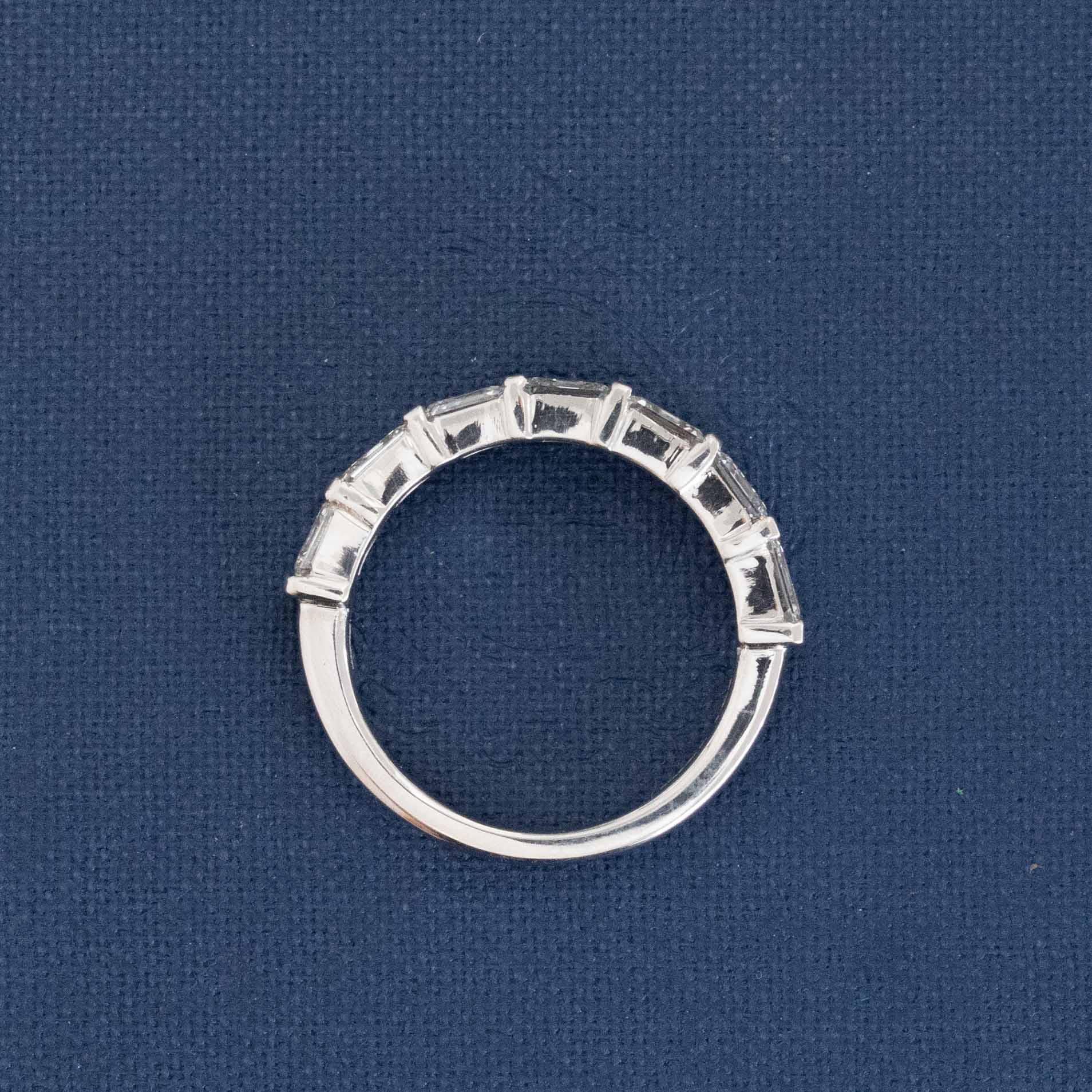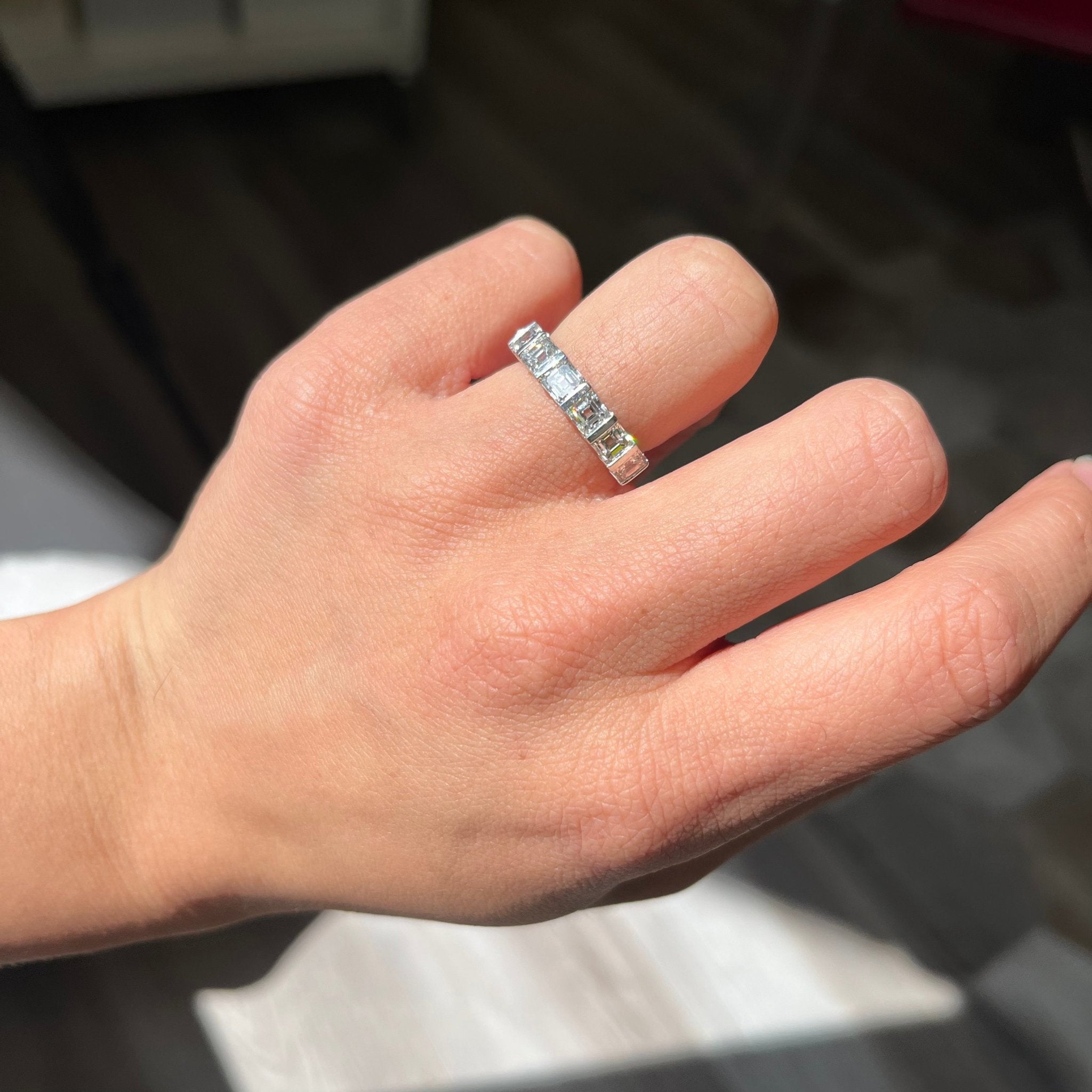 The diamonds sit side by side with shared bar prongs holding them down, allowing for a diamond-heavy look and a perfect row of step cut goodness on the hands. This one is set in platinum, adding a bright and icy white diamond moment to your stack.
