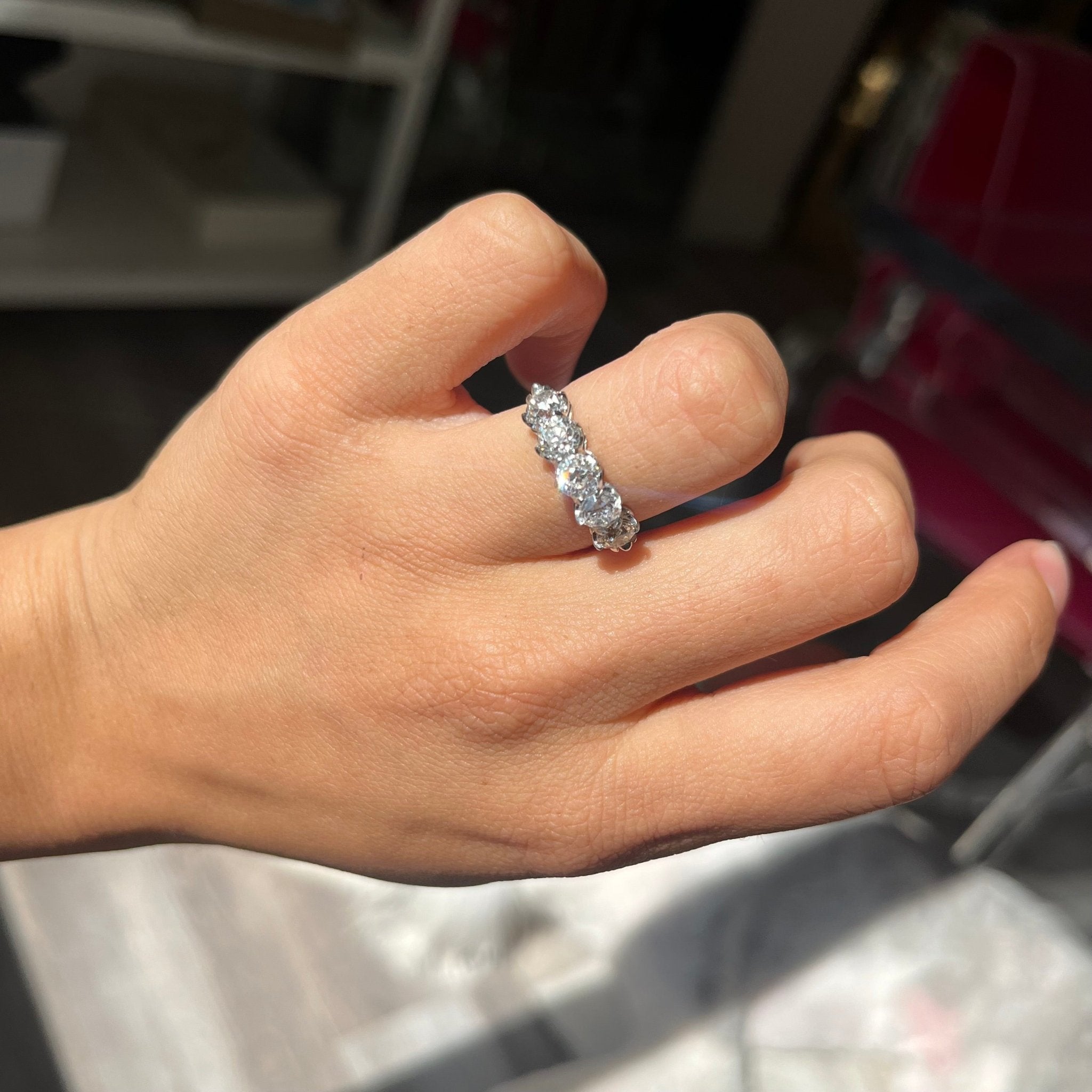 We recently acquired a big parcel of re-purposed (and beautiful!) Old European cut diamonds, and we are beyond thrilled to be making jewels with them! Modeled after antique diamond bands from the Georgian and Victorian eras, this 5-stone band is set with chunky and charming Old Euro cut diamonds in icy white platinum. The diamonds are bright, sparkly and just looks so beautiful and elegant on the finger.