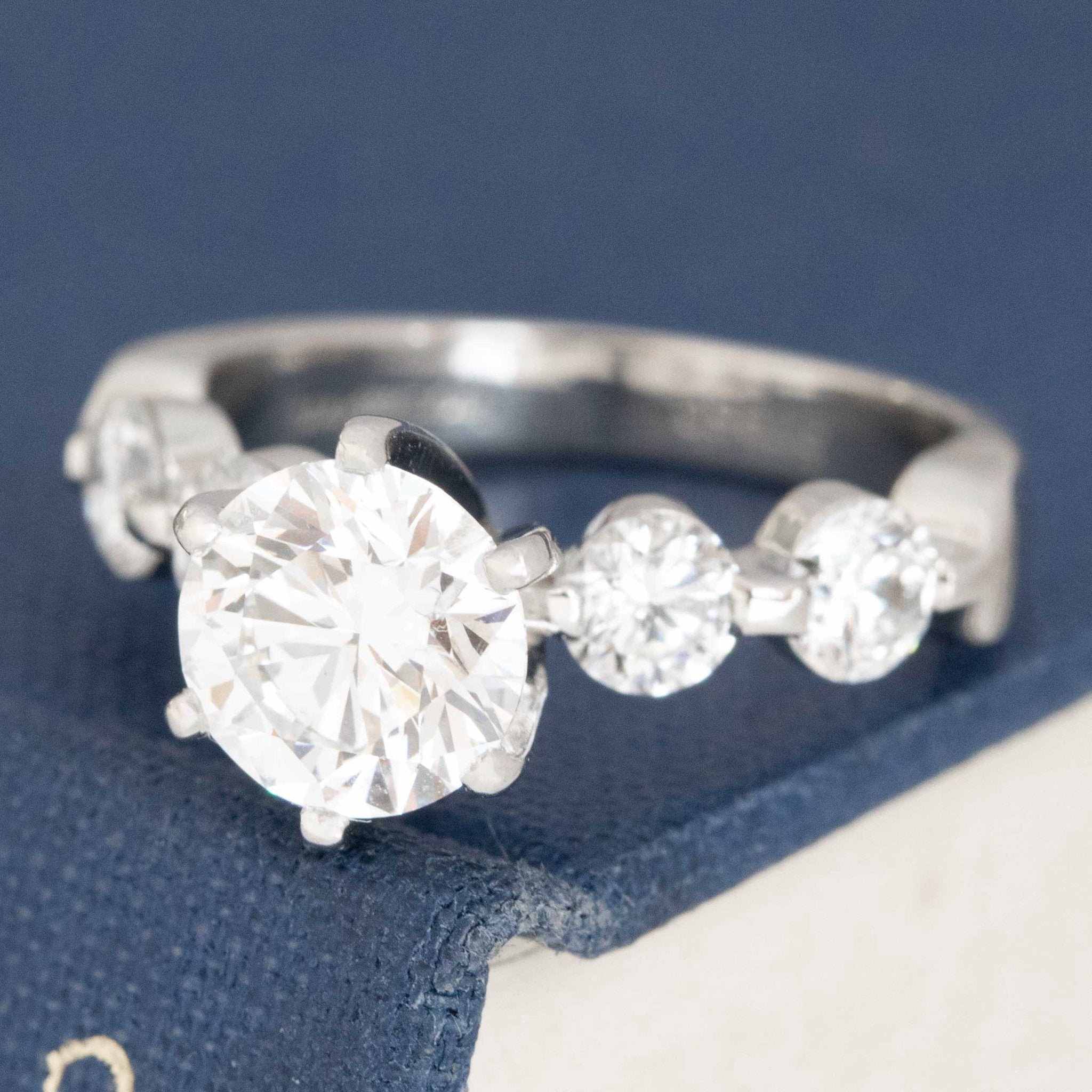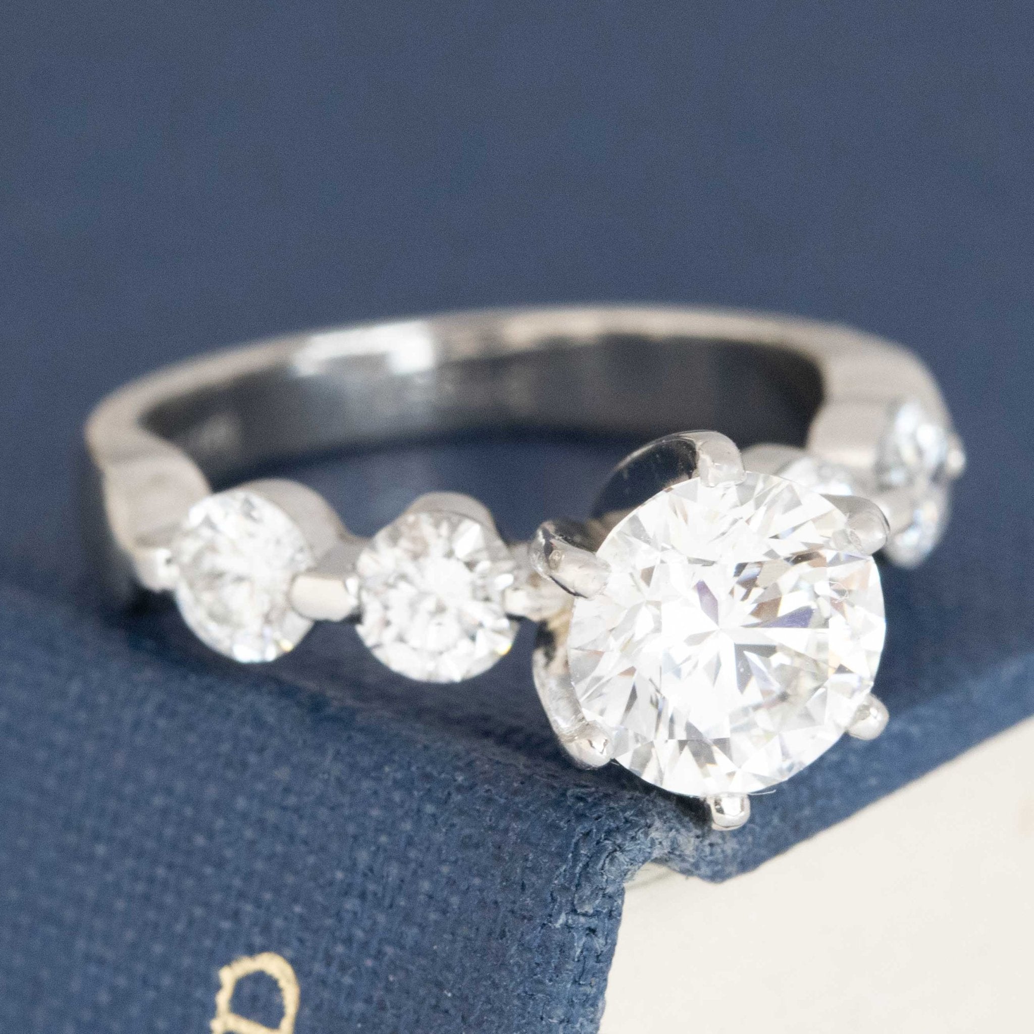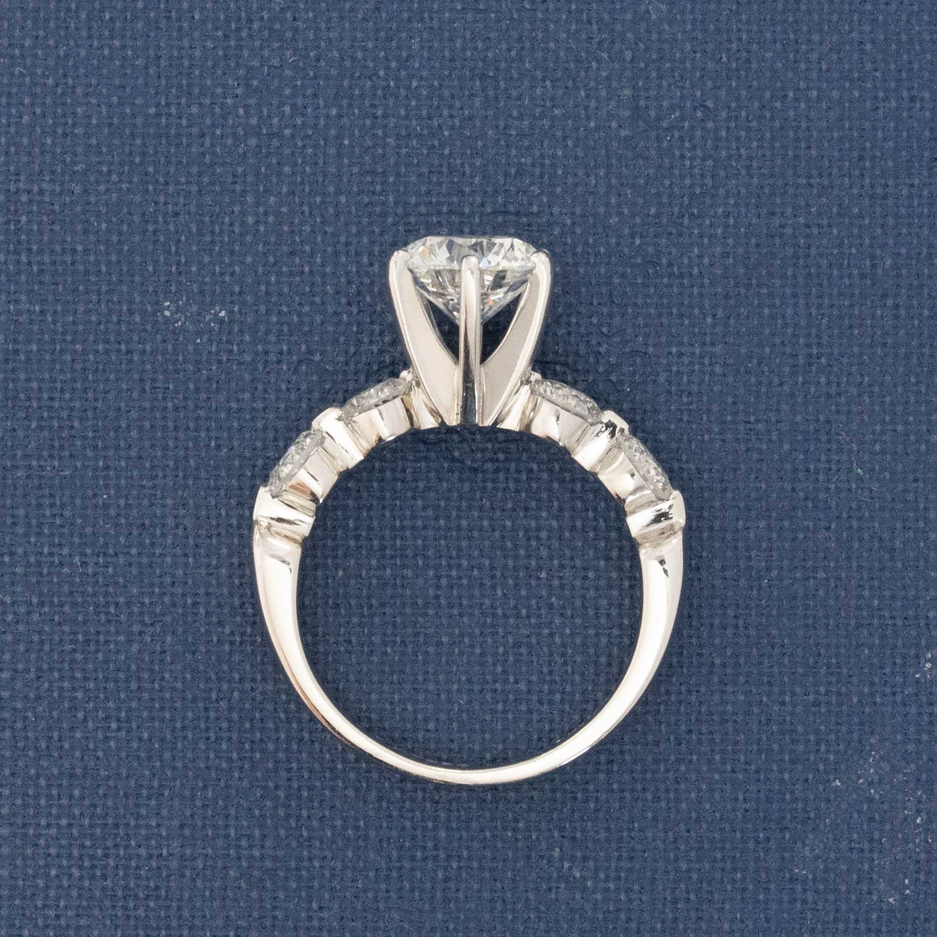A modern round brilliant cut diamond engagement with so much sparkle and charm! A 1.40ct sits in the center with tons of light play - the diamonds which adorn the shoulders add even more spread across the top of one's finger.