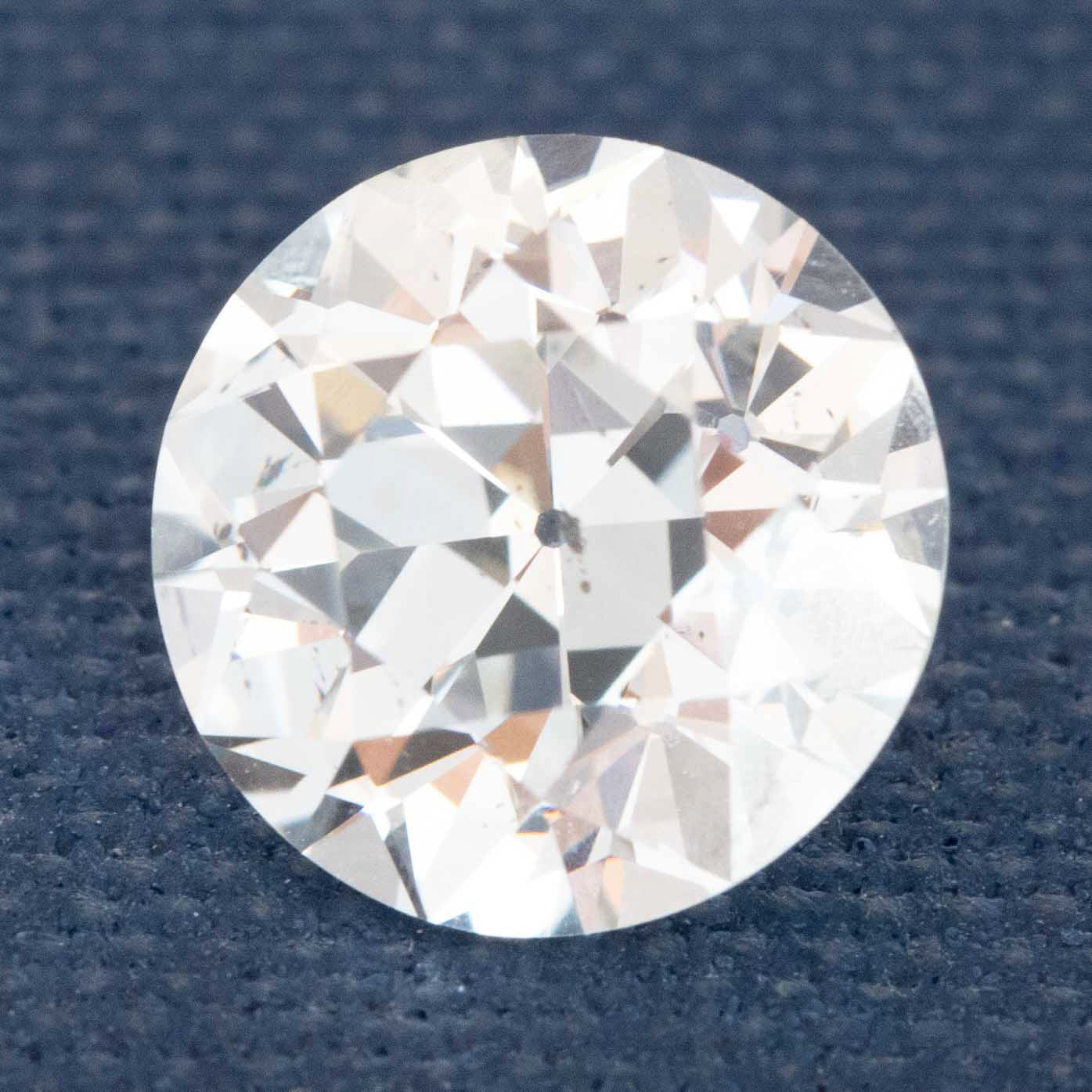 A perfectly faceted, classic old European cut diamond "flavor" - gorgeous make, with the flowery facet pattern under the table, very prismatic and just bright and lively! There is one teeny tiny pinpoint off the edge of the table that is visible under the loupe, but otherwise eye-clean. Just a beautiful example of the cut!