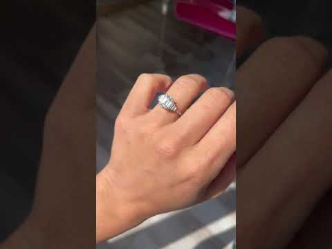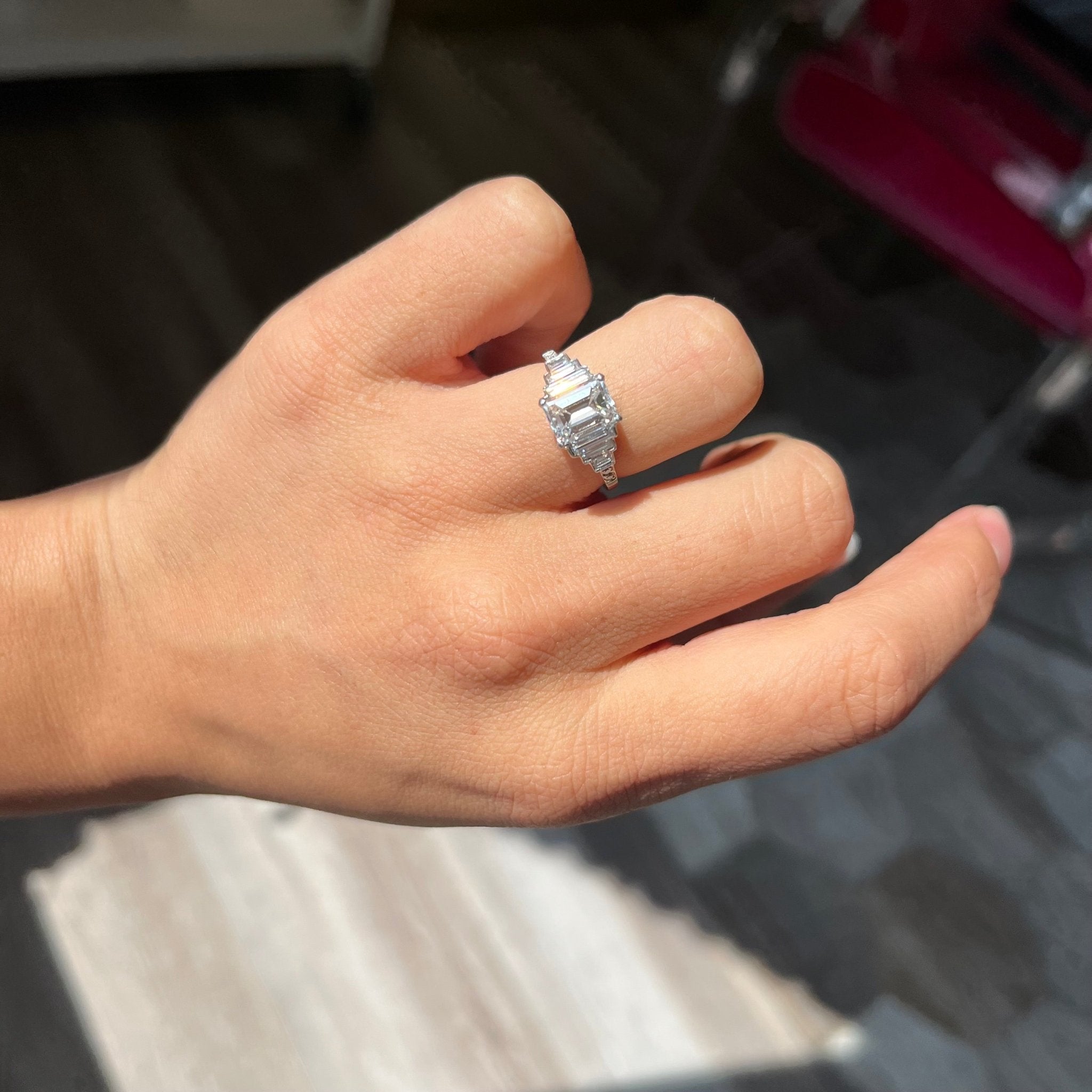Such a gorgeous stone set in a beautiful, Art-Deco inspired setting! We adore emerald cuts, and this one specifically has a stunning make to her, and is icy-white and bright. We love how it plays in the light with the descending baguettes adorning the shoulders, which is classic Art Deco vibes! With clean, minimal lines, this ring is incredibly elegant on the finger. Not too big, but definitely bold.