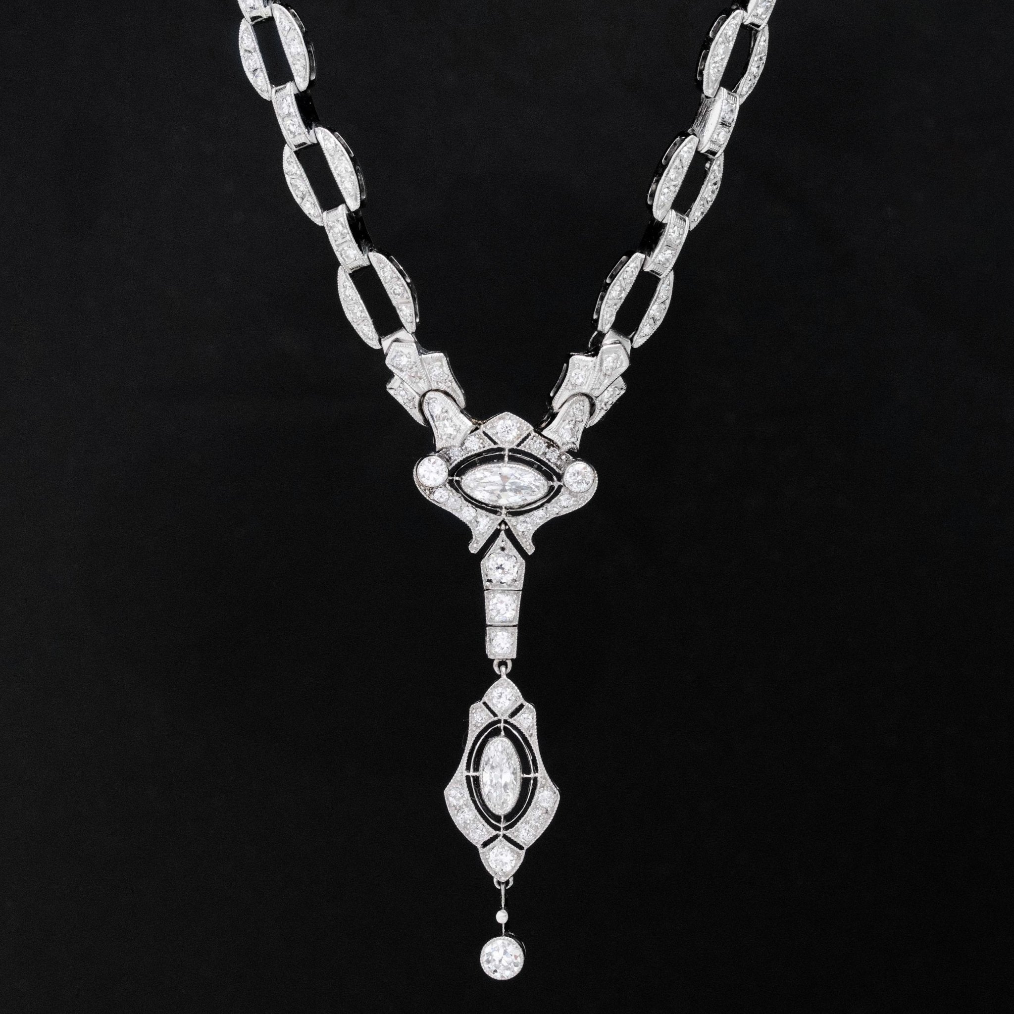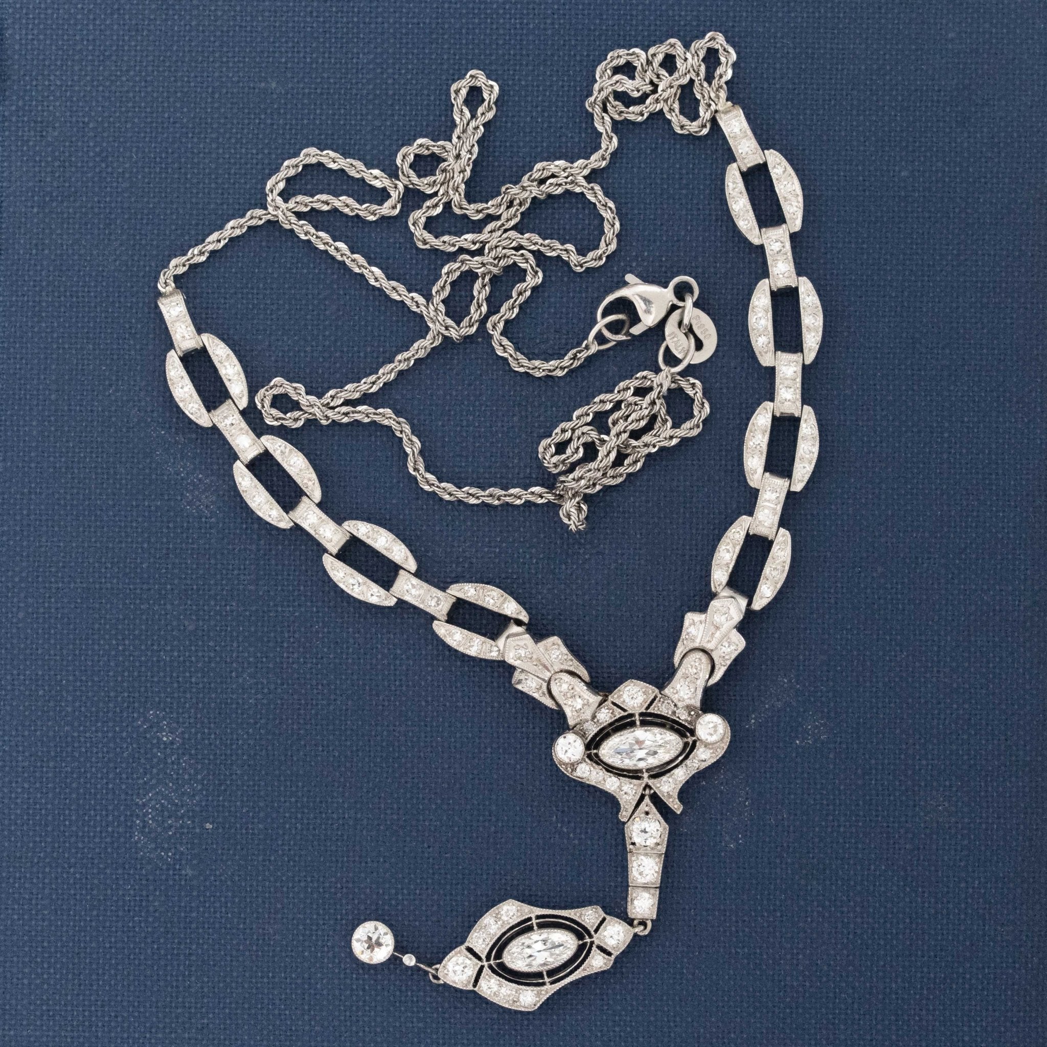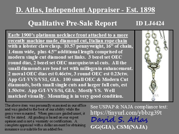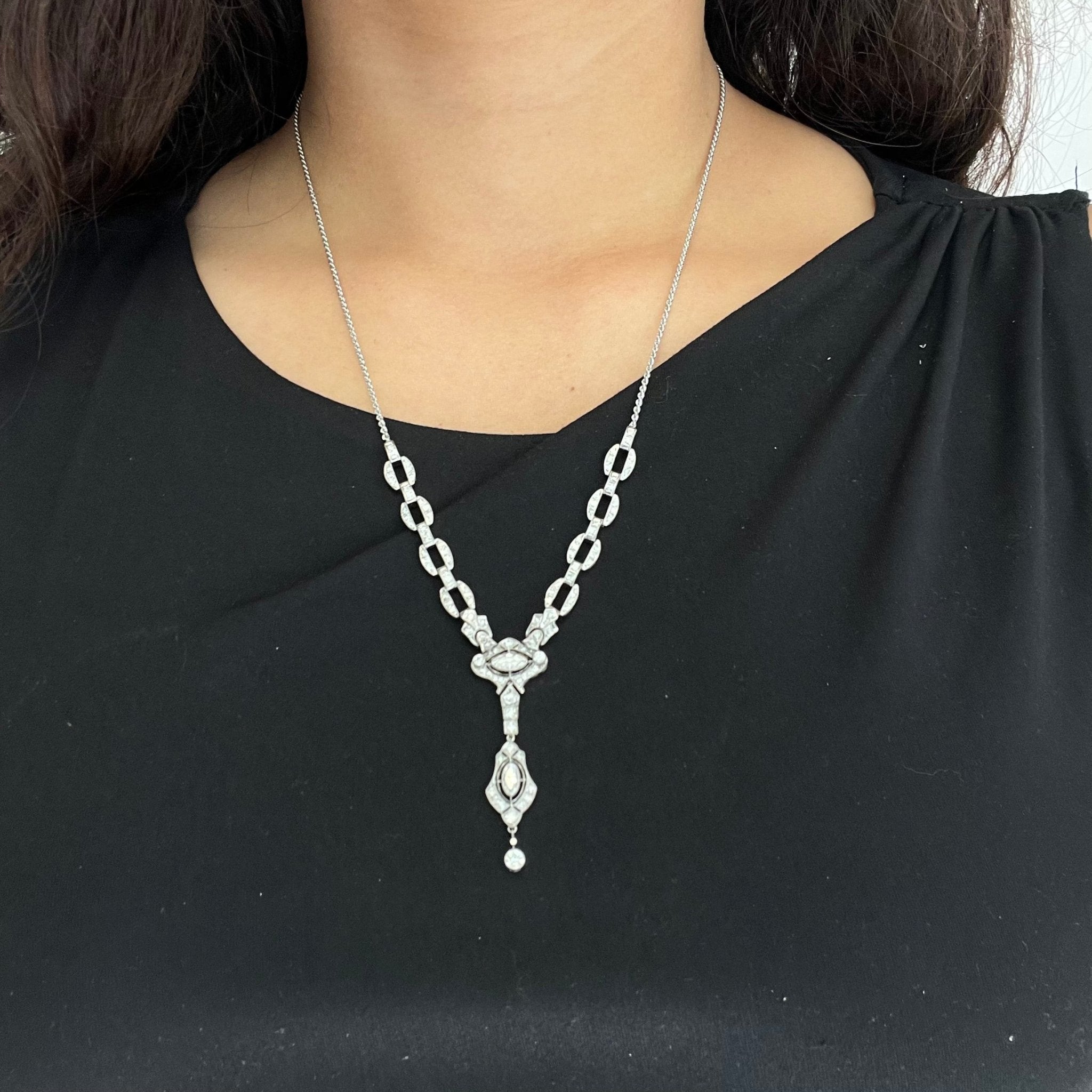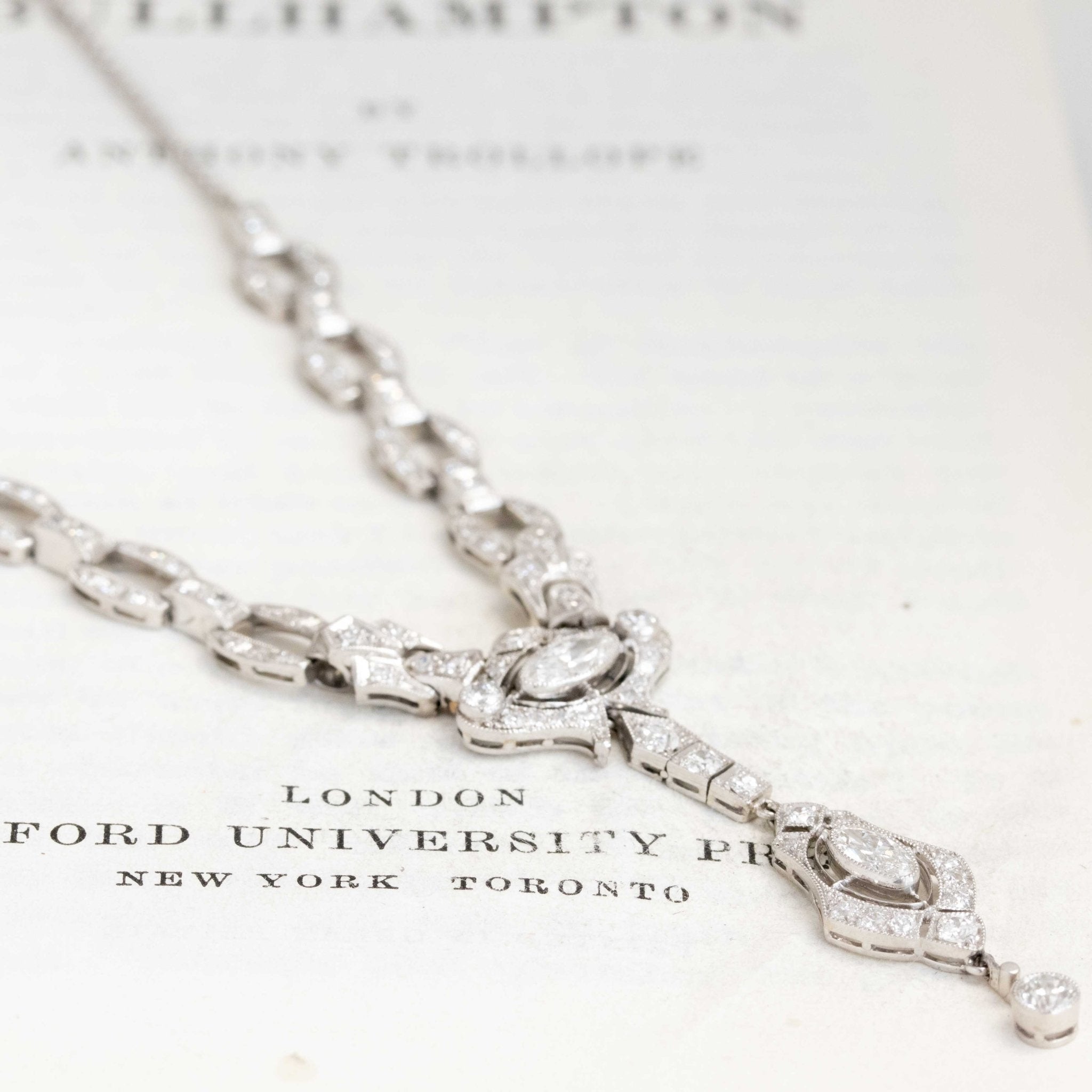 Romantic, feminine and simply perfect. A classic Edwardian-era piece in platinum, this necklace designs typically features a delicate chain with a pendant, often adorned with intricate filigree work and set with sparkling diamonds. The designs are usually light and airy, reflecting the Edwardian preference for intricate craftsmanship and feminine details. The old cut diamonds are bright and sparkly, and simply too charming for words!