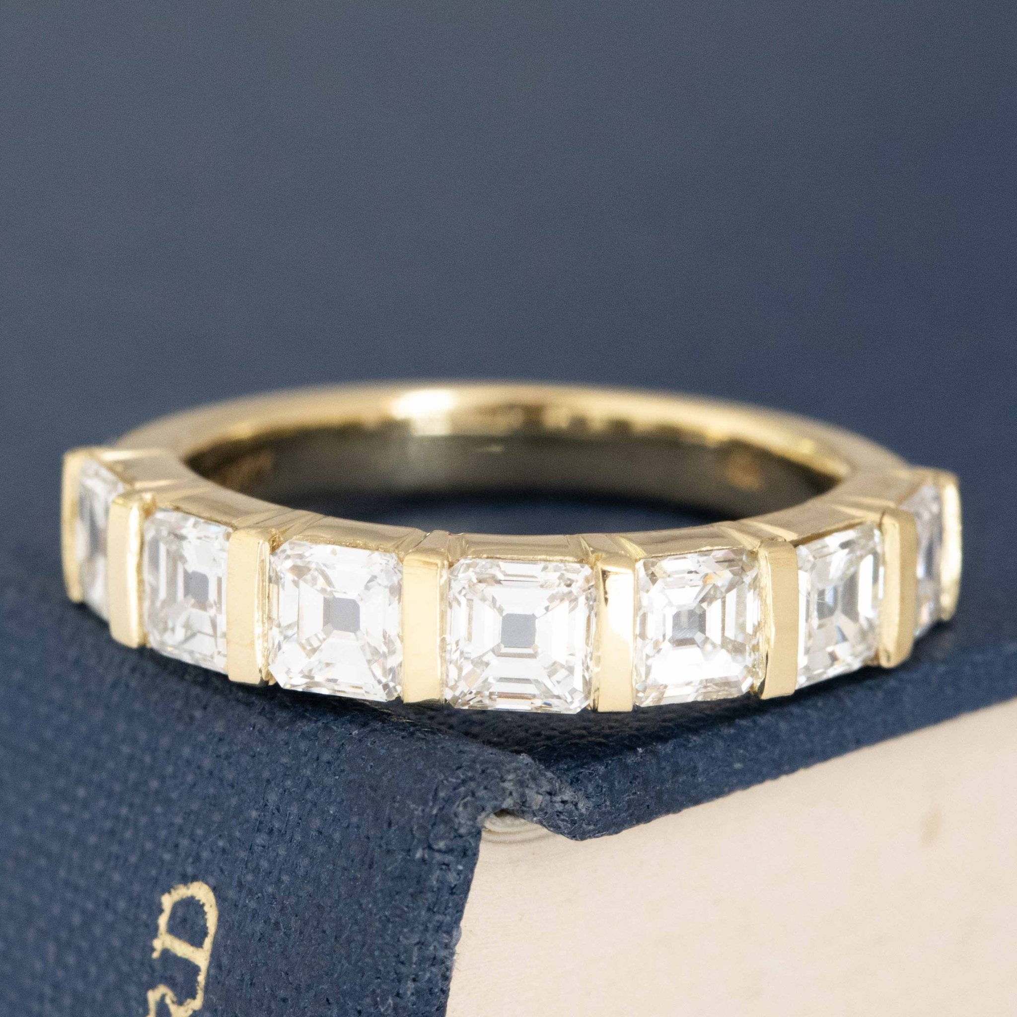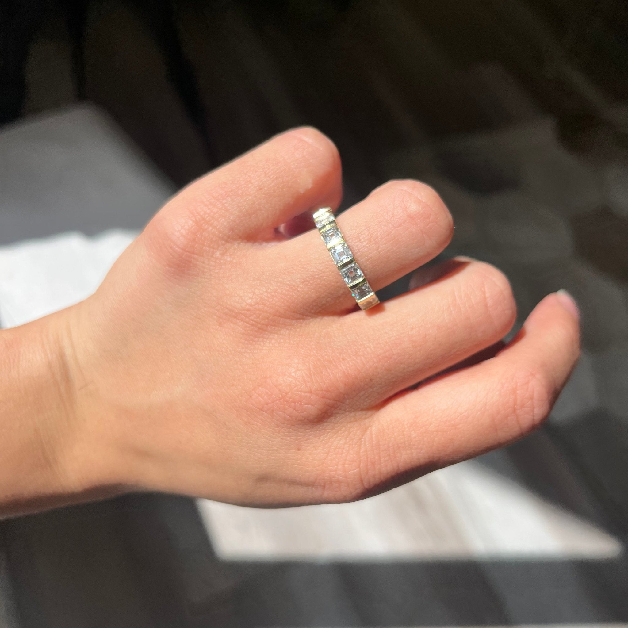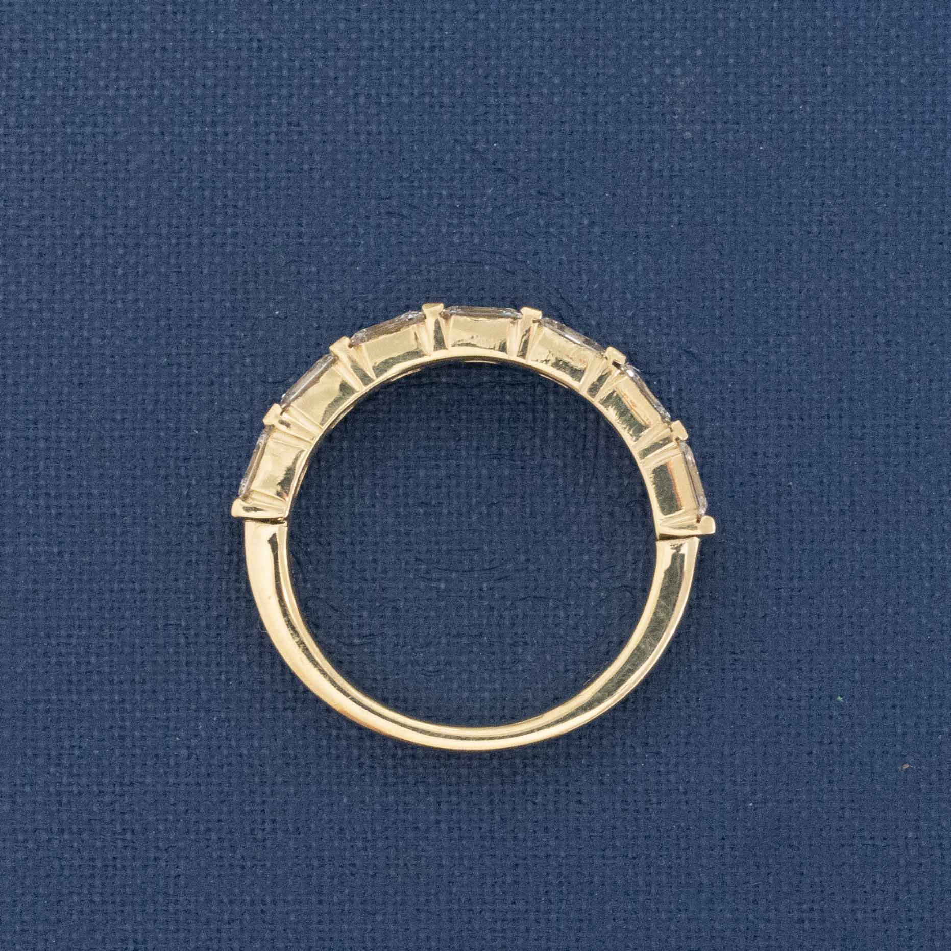 The diamonds sit side by side with shared bar prongs holding them down, allowing for a diamond-heavy look and a perfect row of step cut goodness on the hands. This one is set in yellow gold, adding a bright and sparkly diamond moment to your stack.