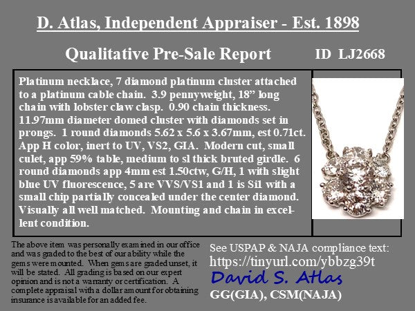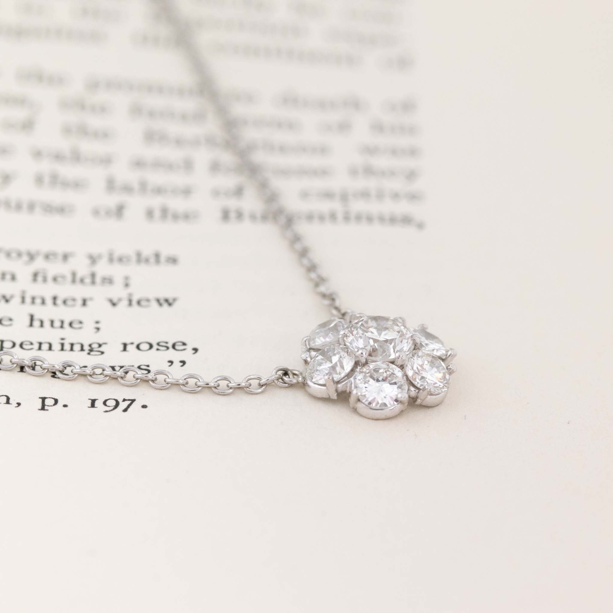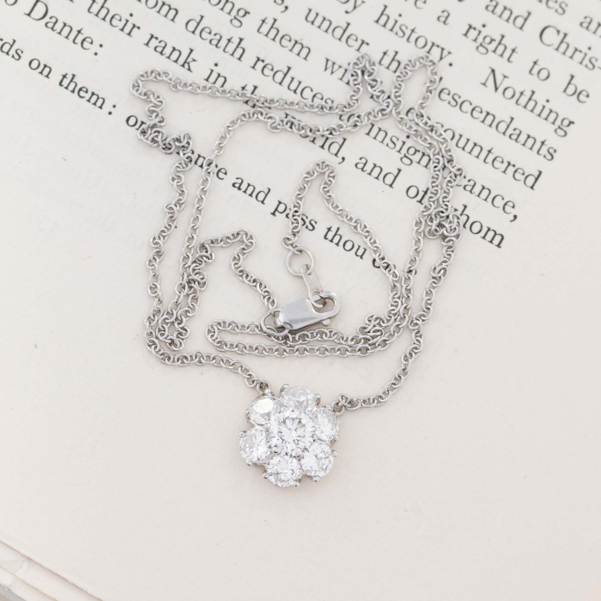 This charming cluster pendant has six round brilliant diamonds surrounding an approximate .71ct center. Each stone is incredibly bright and prismatic, looking especially icy in its’ platinum setting and chain. She’s perfect for everyday wear, and is sure to bring big sparkle to your collection of jewelry.