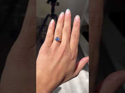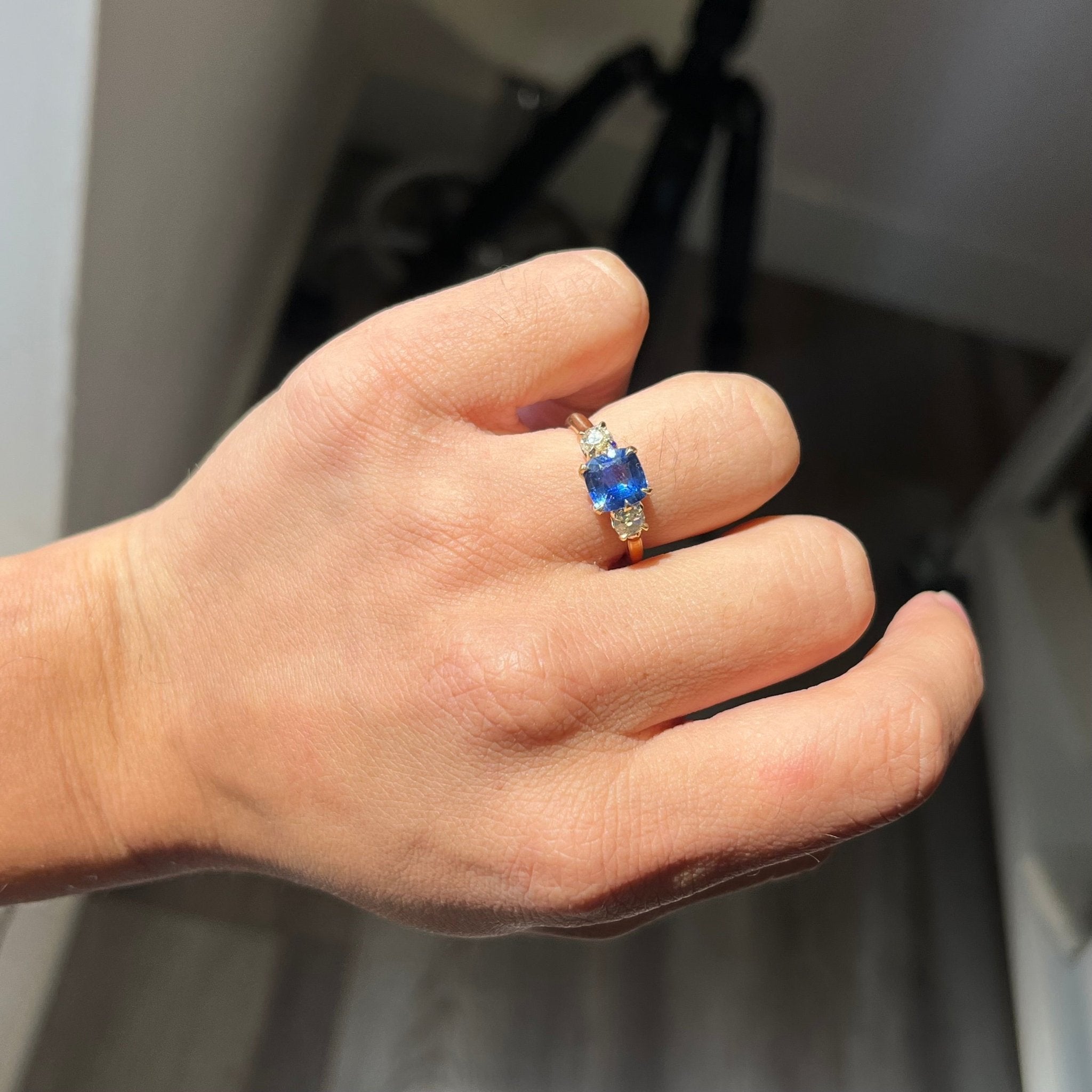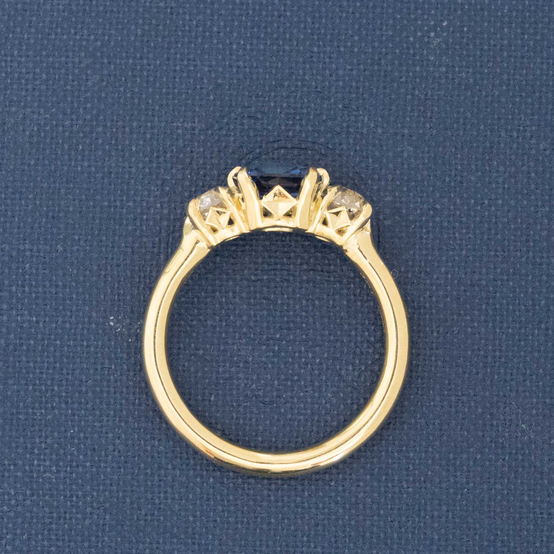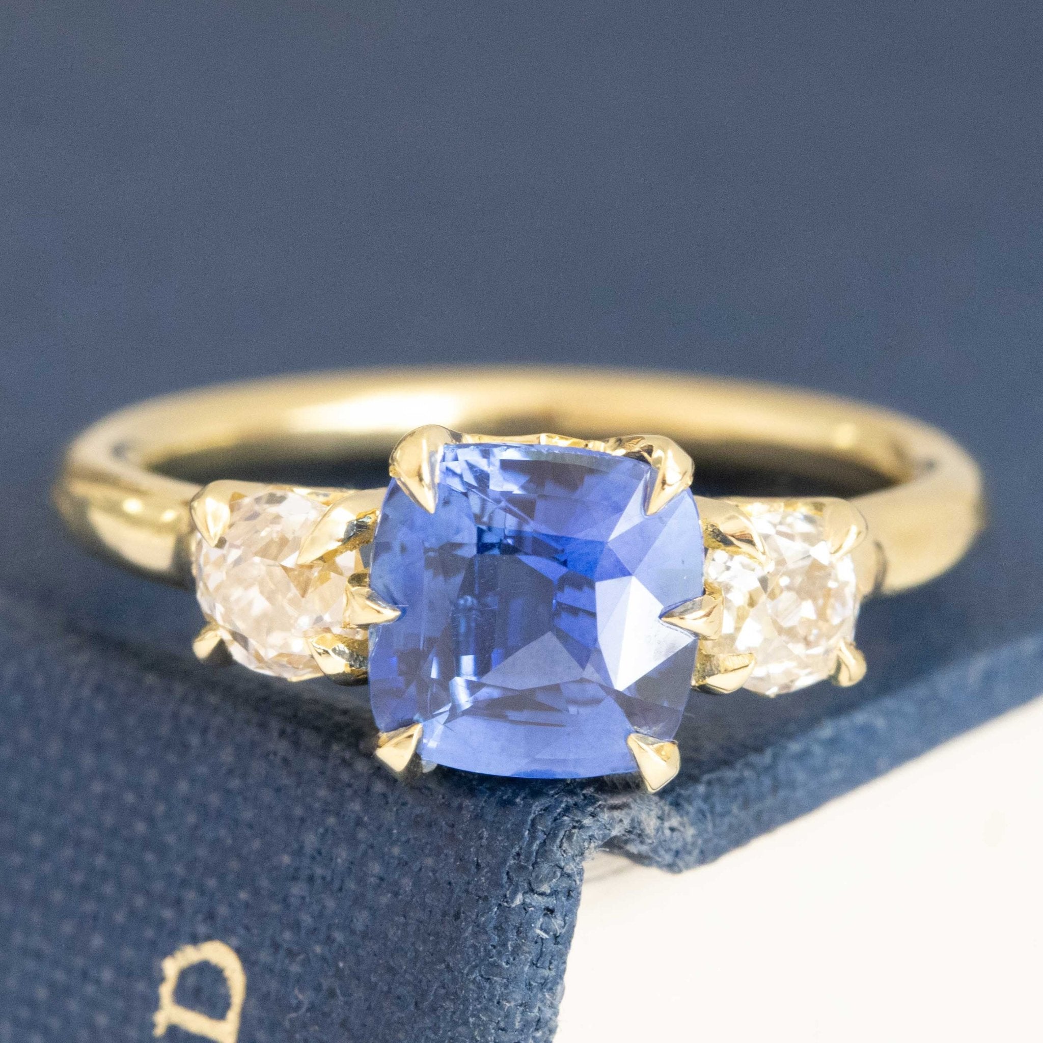 A sapphire trilogy ring with plenty of color, sparkle and charm to go around. That cushion center has a beautiful, deeply blue hue that sits well in yellow gold. The old mine cut diamond shoulders add a great amount of diamond fire, while also offering up extra diamond coverage along the shoulders.
