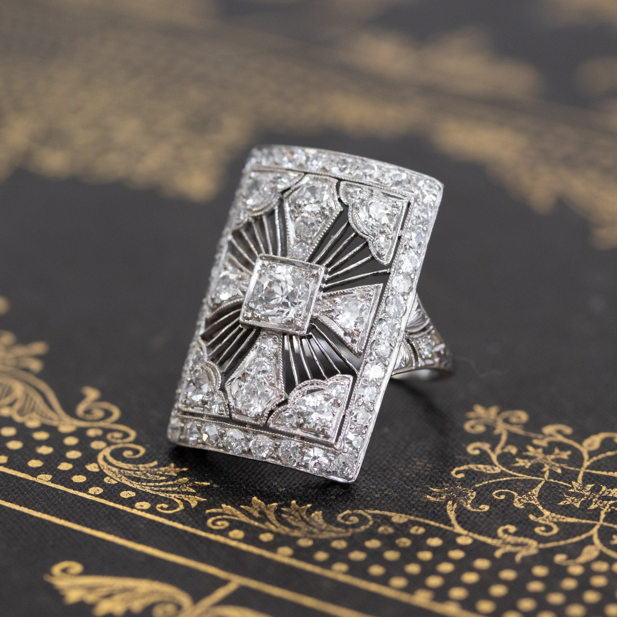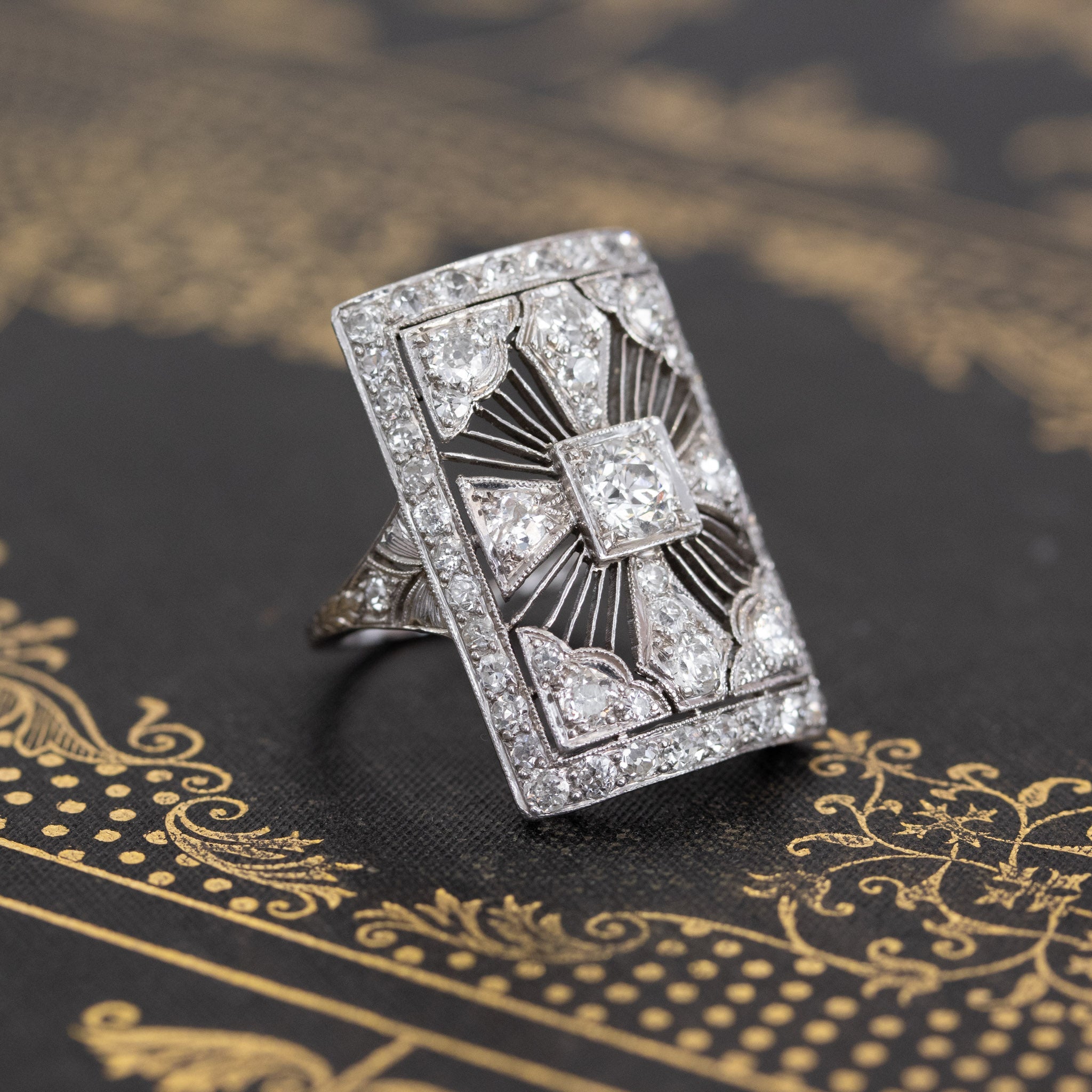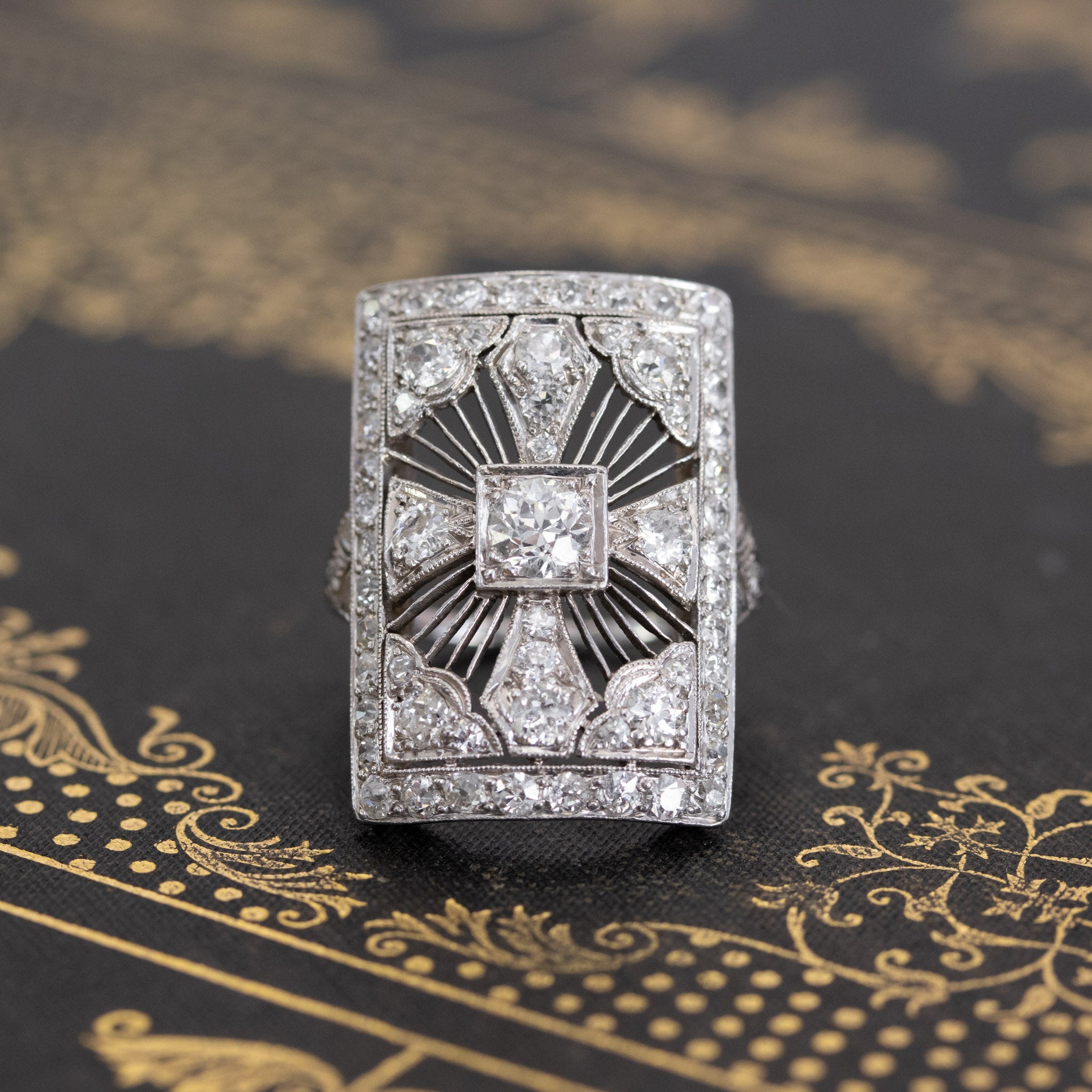 Classically Edwardian and absolutely lovely! This dinner ring featuring the cruciform motif is a blissfully bold piece, featuring about 60 Old European Cut Diamonds throughout. The filigree and metal piecework is in impeccable condition, and the scrolls on the plaque are beautiful.
