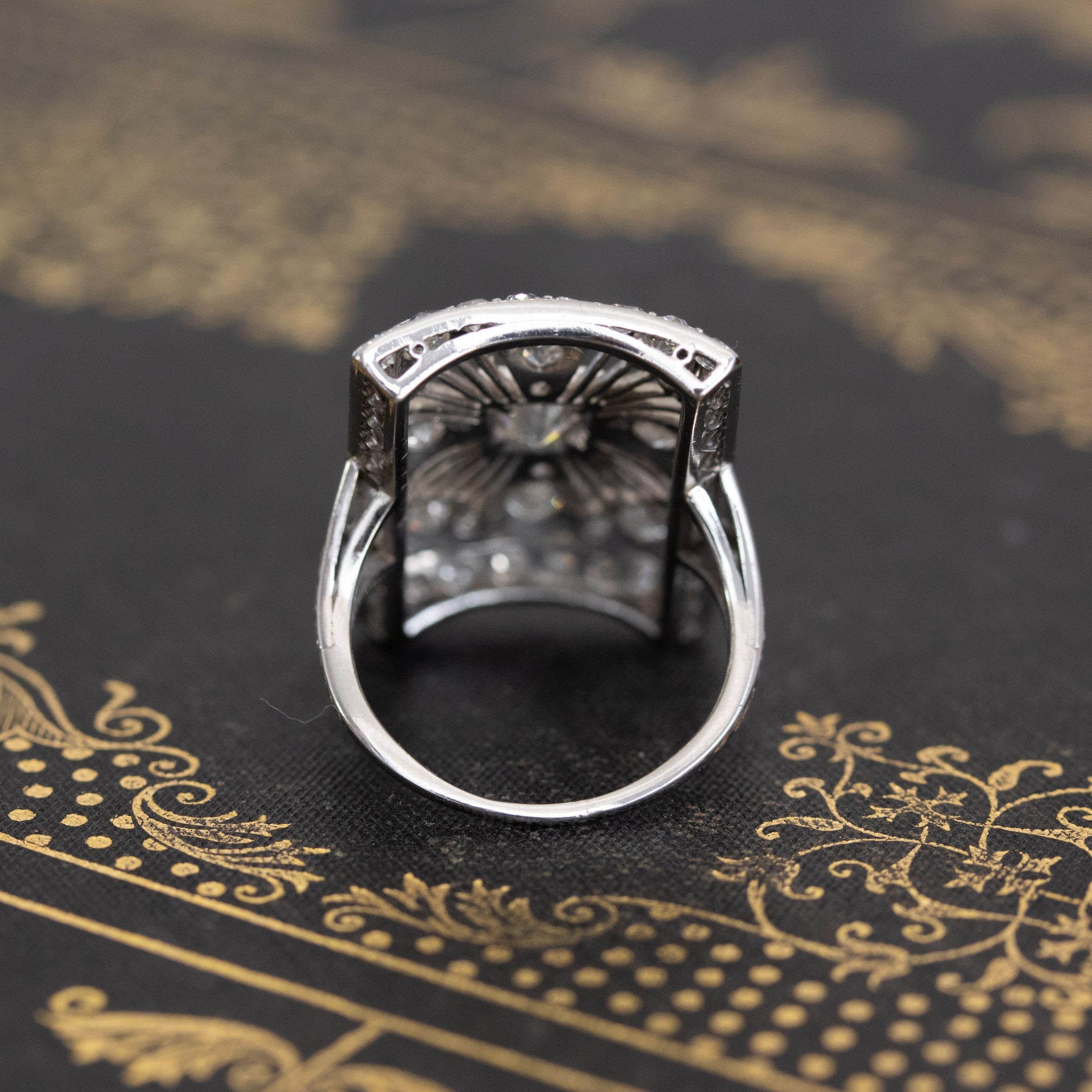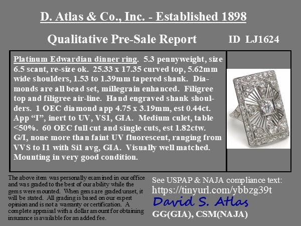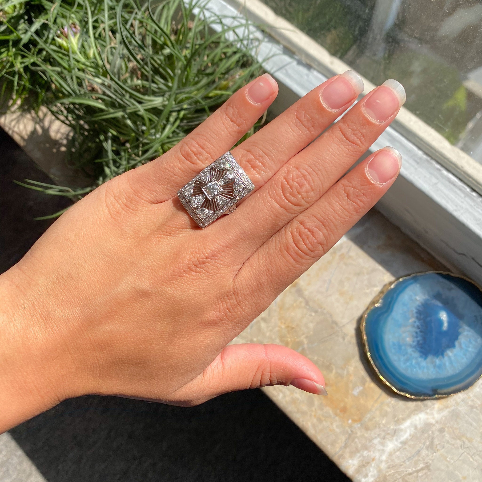 Classically Edwardian and absolutely lovely! This dinner ring featuring the cruciform motif is a blissfully bold piece, featuring about 60 Old European Cut Diamonds throughout. The filigree and metal piecework is in impeccable condition, and the scrolls on the plaque are beautiful.