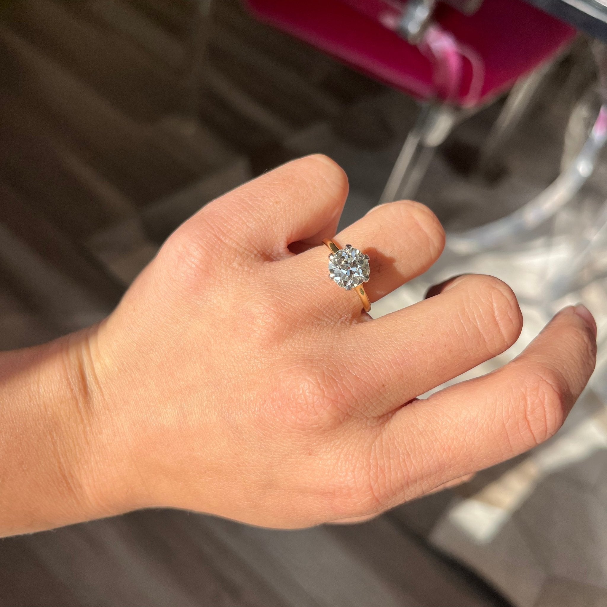As classic and timeless as they come! We took this slightly elongated old mine cut diamond and set her in a platinum basket and yellow gold shank. She floats like a dream on the finger, full of fire and life as light hits her. Will stack beautifully with a wedding band as well!