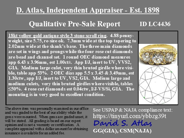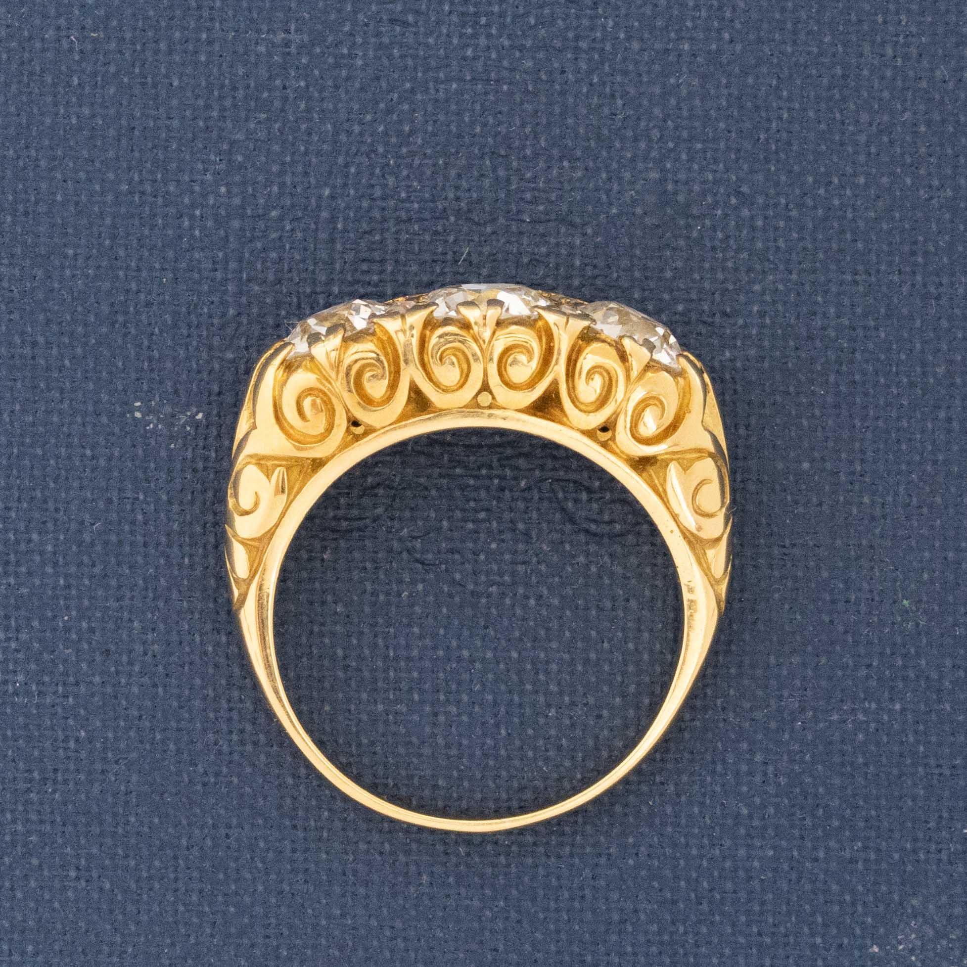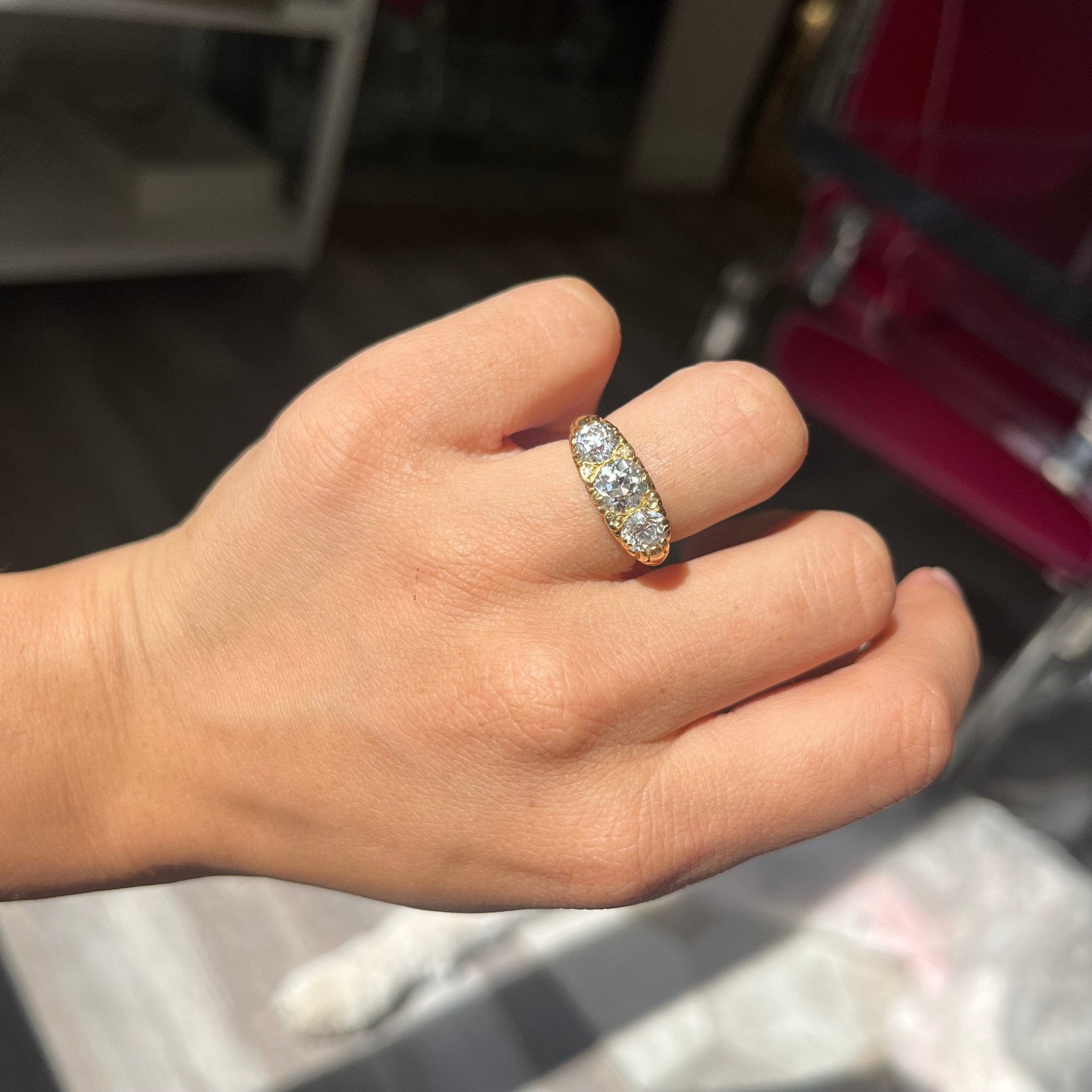 Beautifully crafted Victorian revival ring with truly gorgeous scroll details along the gallery and shank. Set with 3 perfectly matched OECs, which psrakle beautifully in this rich yellow gold setting. Low set and so elegant on the finger!