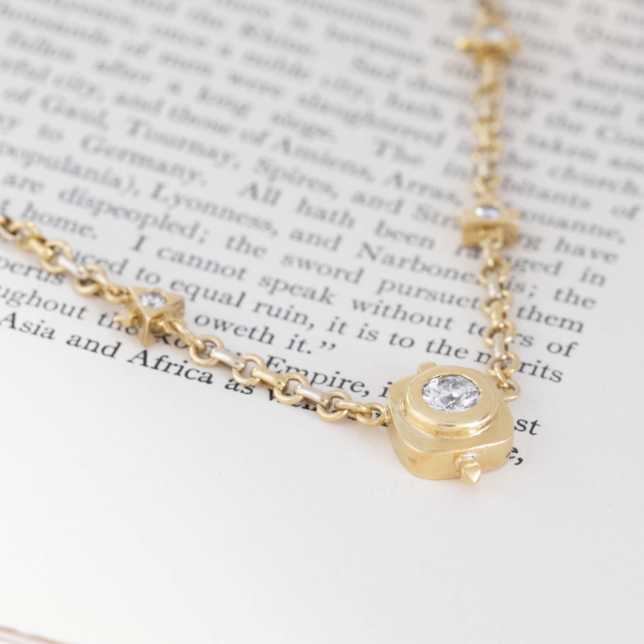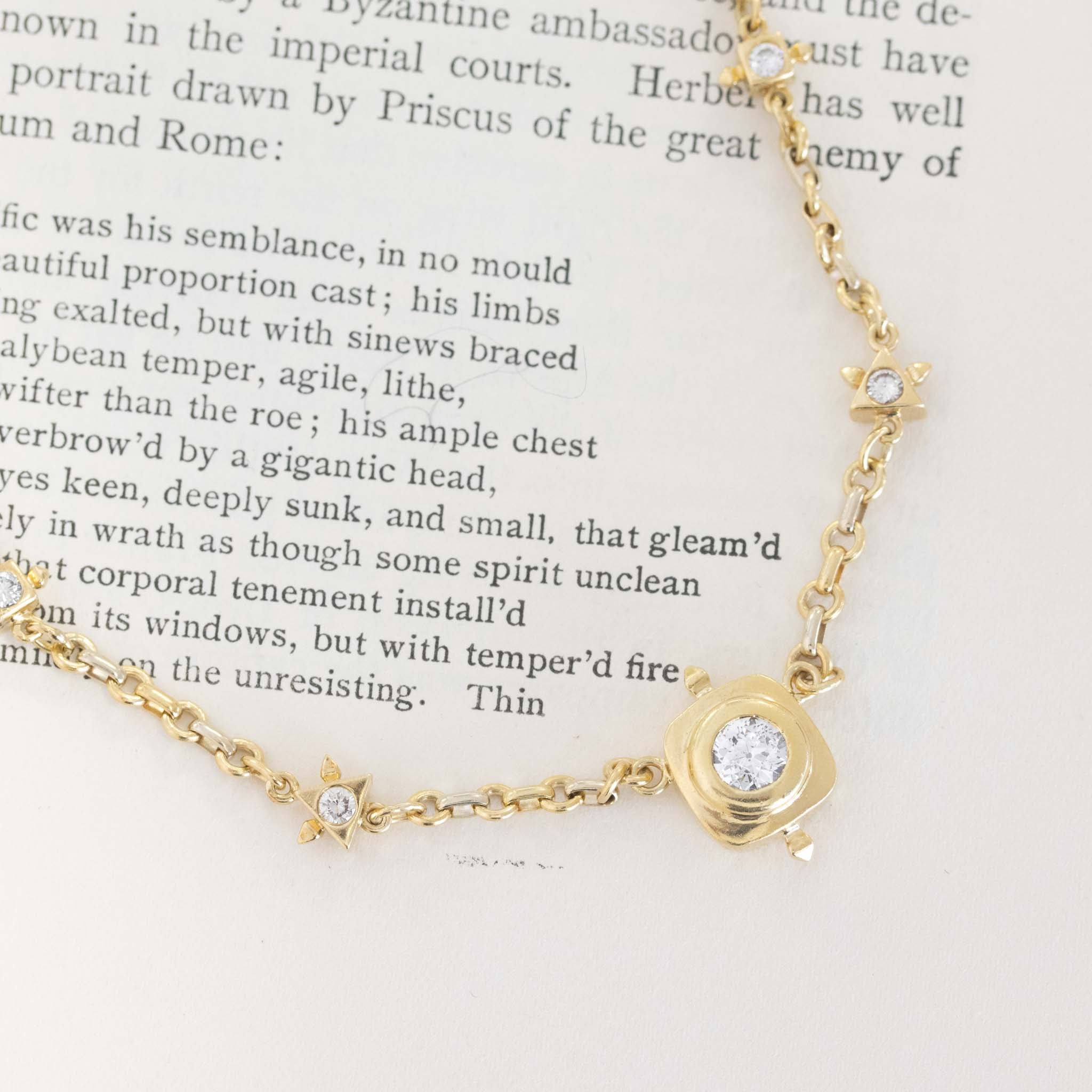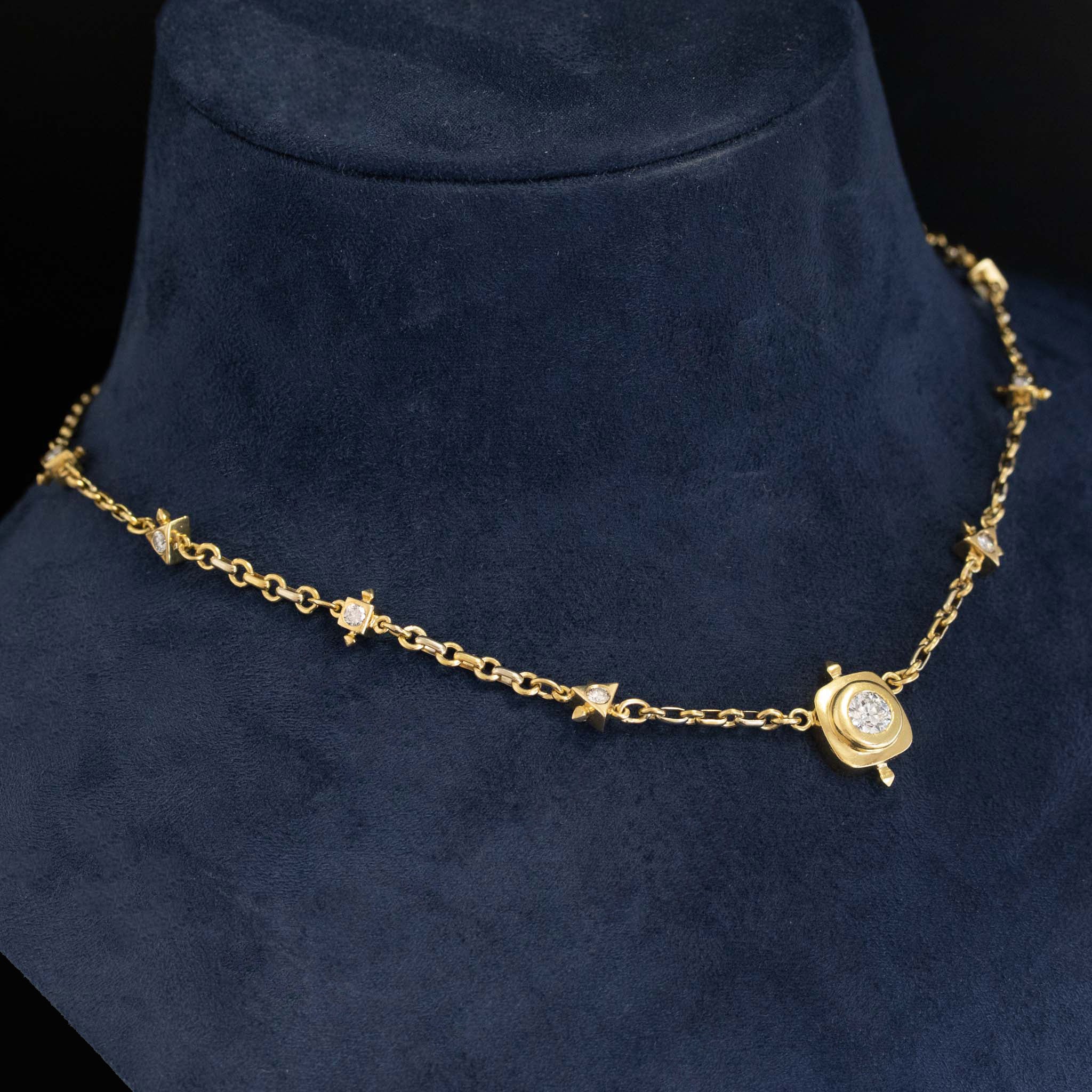 Big presence with this old Euro bezel necklace is so incredibly special - 7 diamonds adorn this warm gold chain, each sitting in a chunky bezel with unique bezels. The bezel sitting front and center is shaped almost like a puzzle piece, and the rest of them are set in triangular forms. Overall, this piece gives us Etruscan-style vibes, with a bold presence and sweet sparkle on the neck. Super rich yellow gold with gorgeous heft and presence!