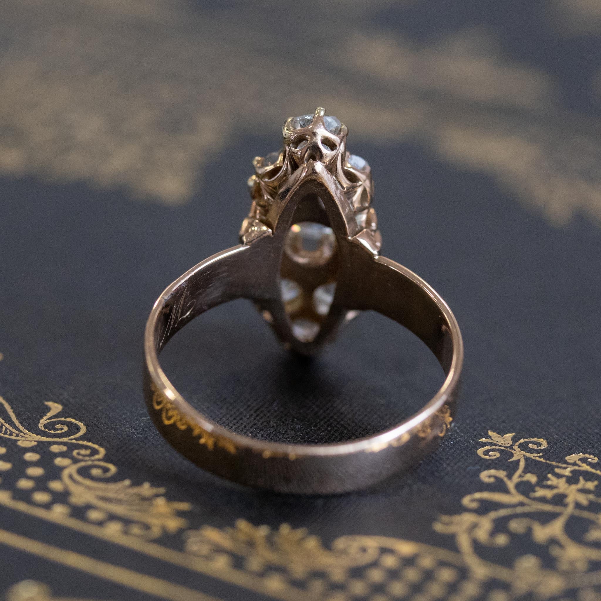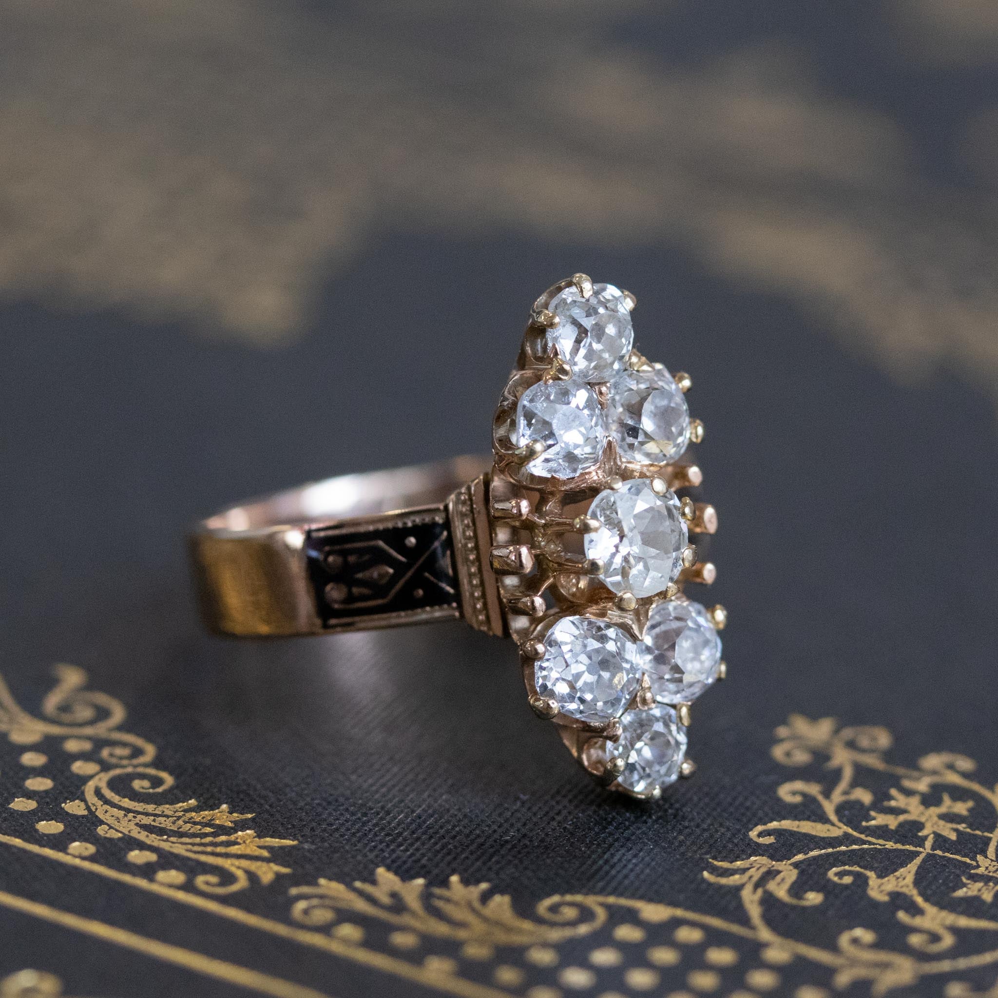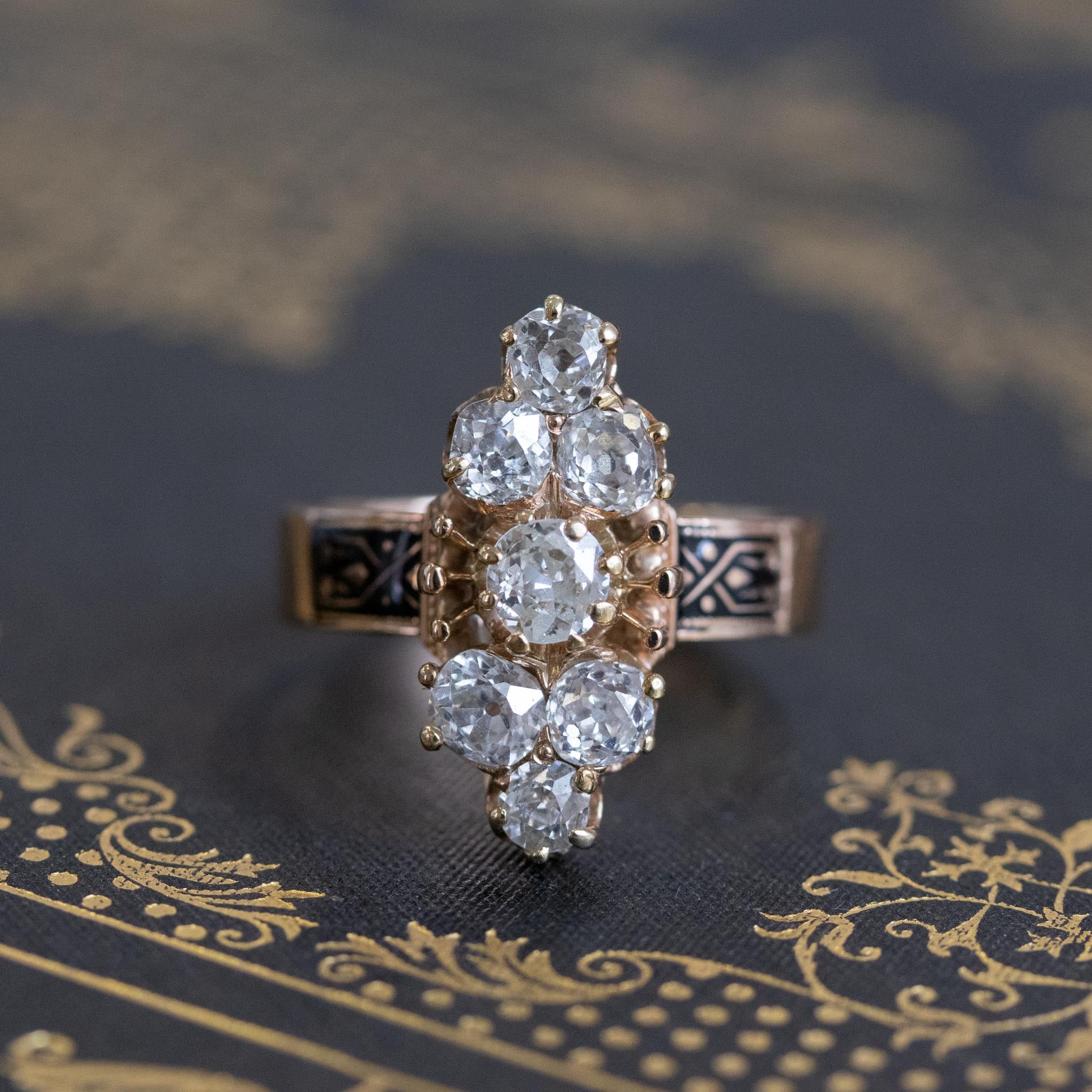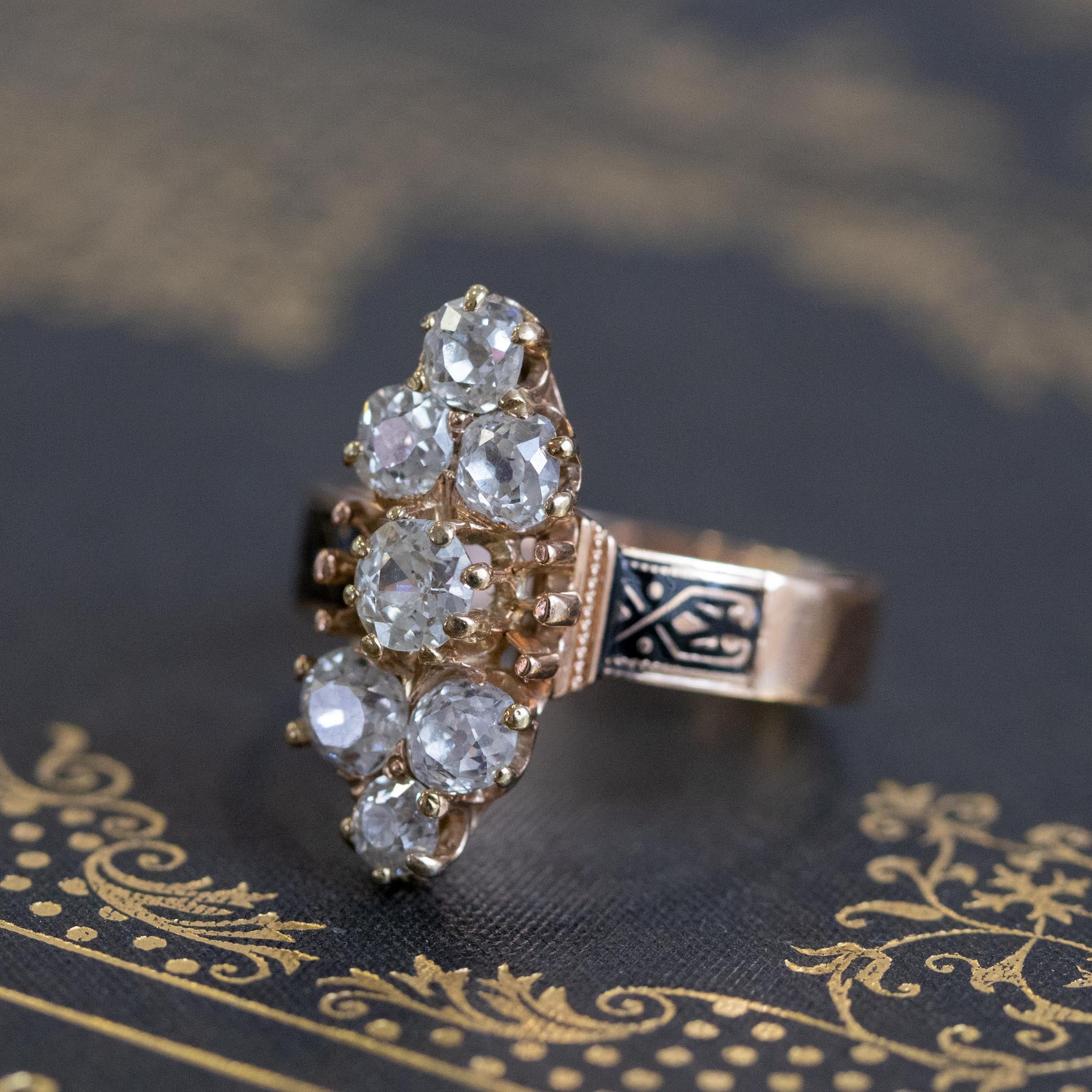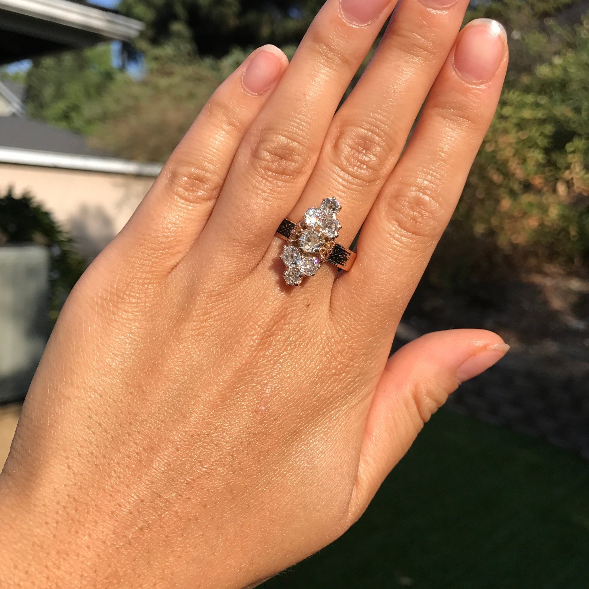 Beautiful and pretty unique cluster ring - unlike any other we have seen! We adore the unique placement of the old mine cut diamonds, with a center stone flanked by a trio of diamonds on top and bottom. The diamonds are very chunky and utterly charming, and we adore their rustic makes! Very elegant on the finger, and a style which can be worn by even those with smaller finger sizes. Gorgeous and intricate hand-engraved details on the shoulders only add to the charm.