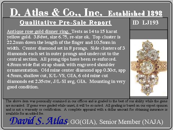 Diamonds are estimated to be J/K/L colors & VS/SI clarities. GIA standards
