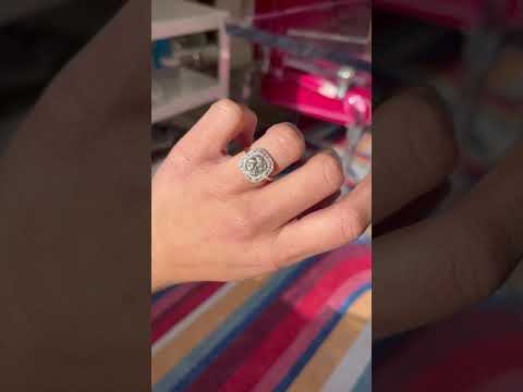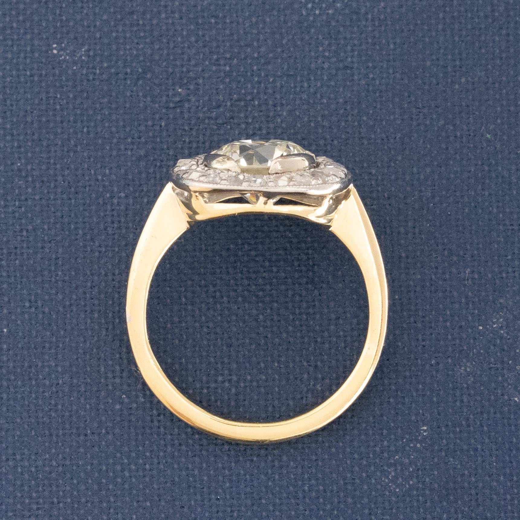 An antique cluster ring that is as elegant today as it was 150 years ago! She's got an Old European cut diamond center and a cushion-shaped halo, set with delicate milgrain details and sweet rose cut diamonds. A two-tone beauty which offers up some excellent finger real estate coverage.