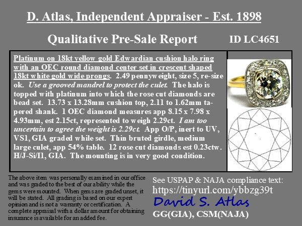 - Center: 2.15 carat (est) Old European Cut diamond; O/P color VS1-VS2 clarity