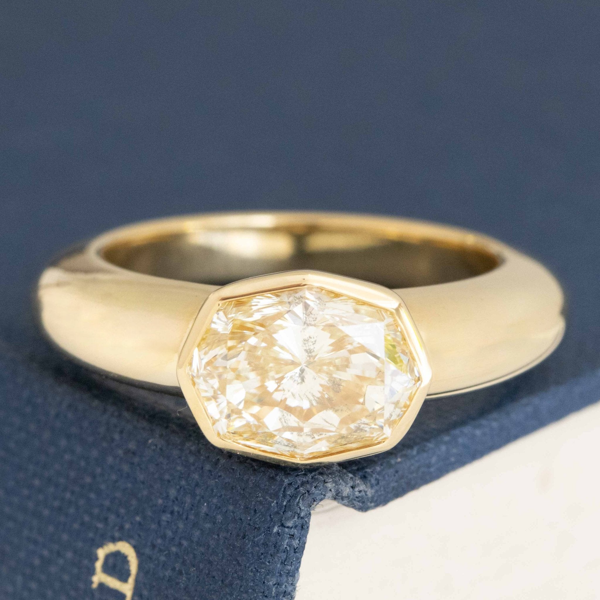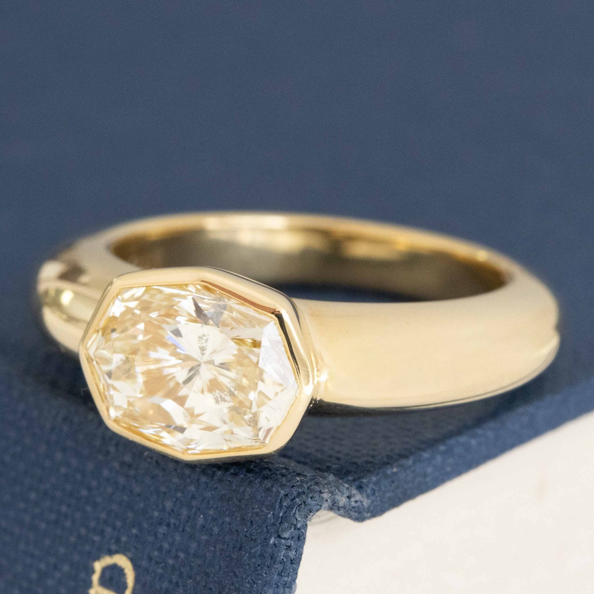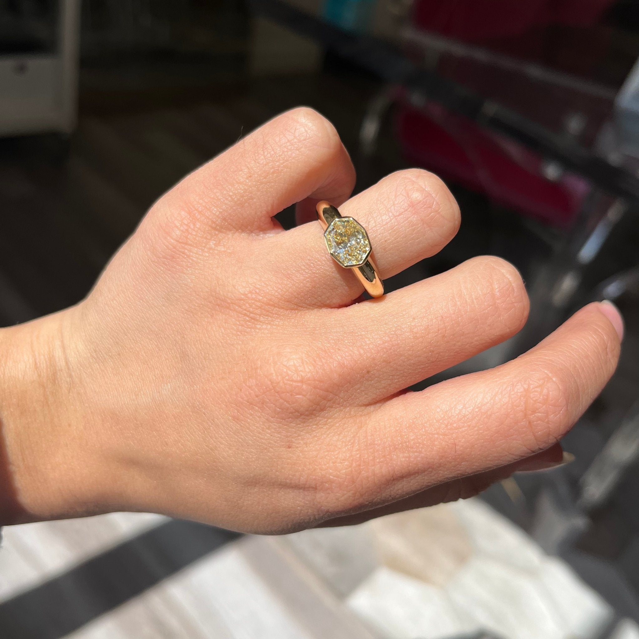 One of the more unique cuts we have in our collection, only made m ore unique in this chunkier bezel setting which truly showcases the stone's corners and shape. Richly-hued, its hard to believe the diamond is not fancy yellow! Low set on the finger, its the perfect ring fro those looking for a one-of-a-kind, special ring.