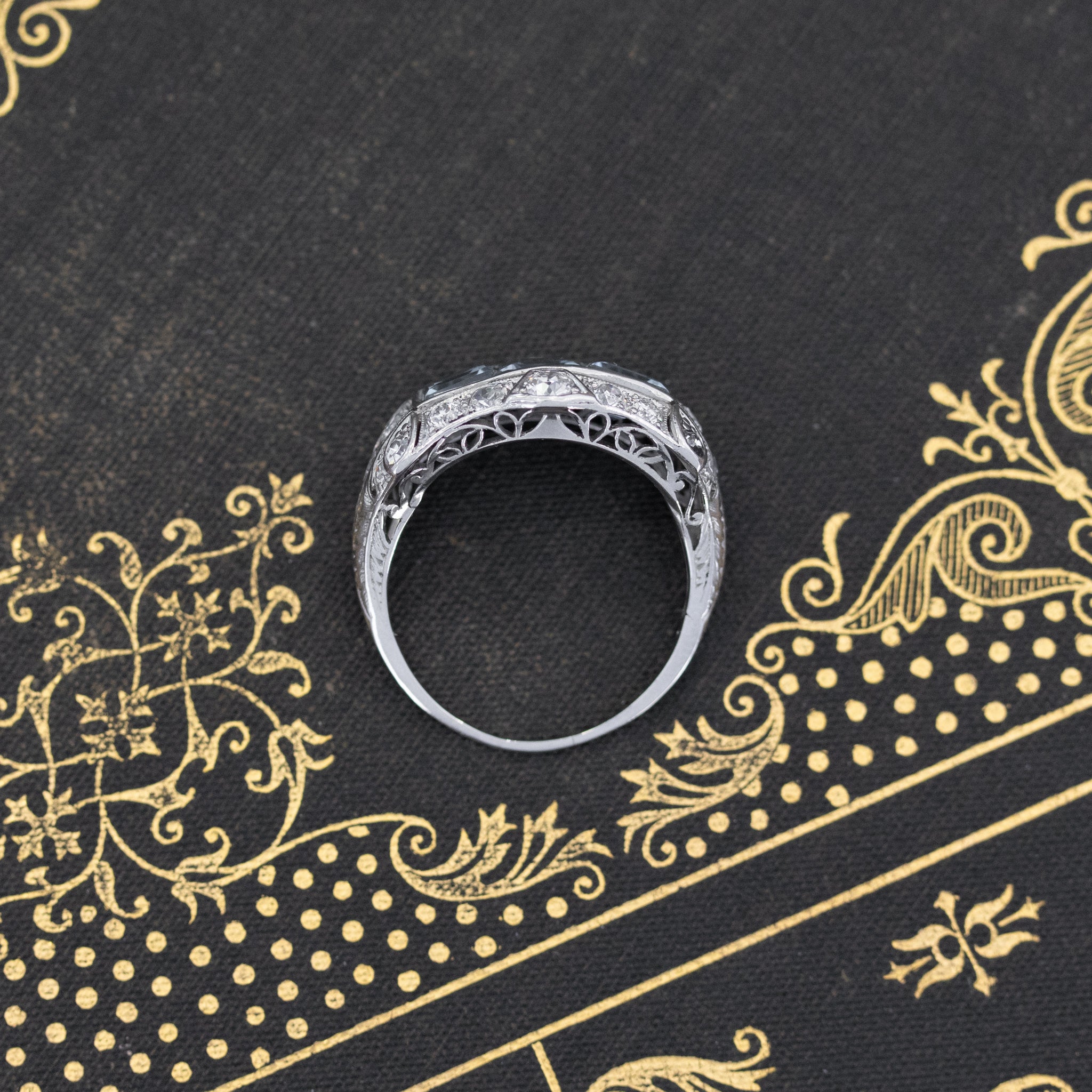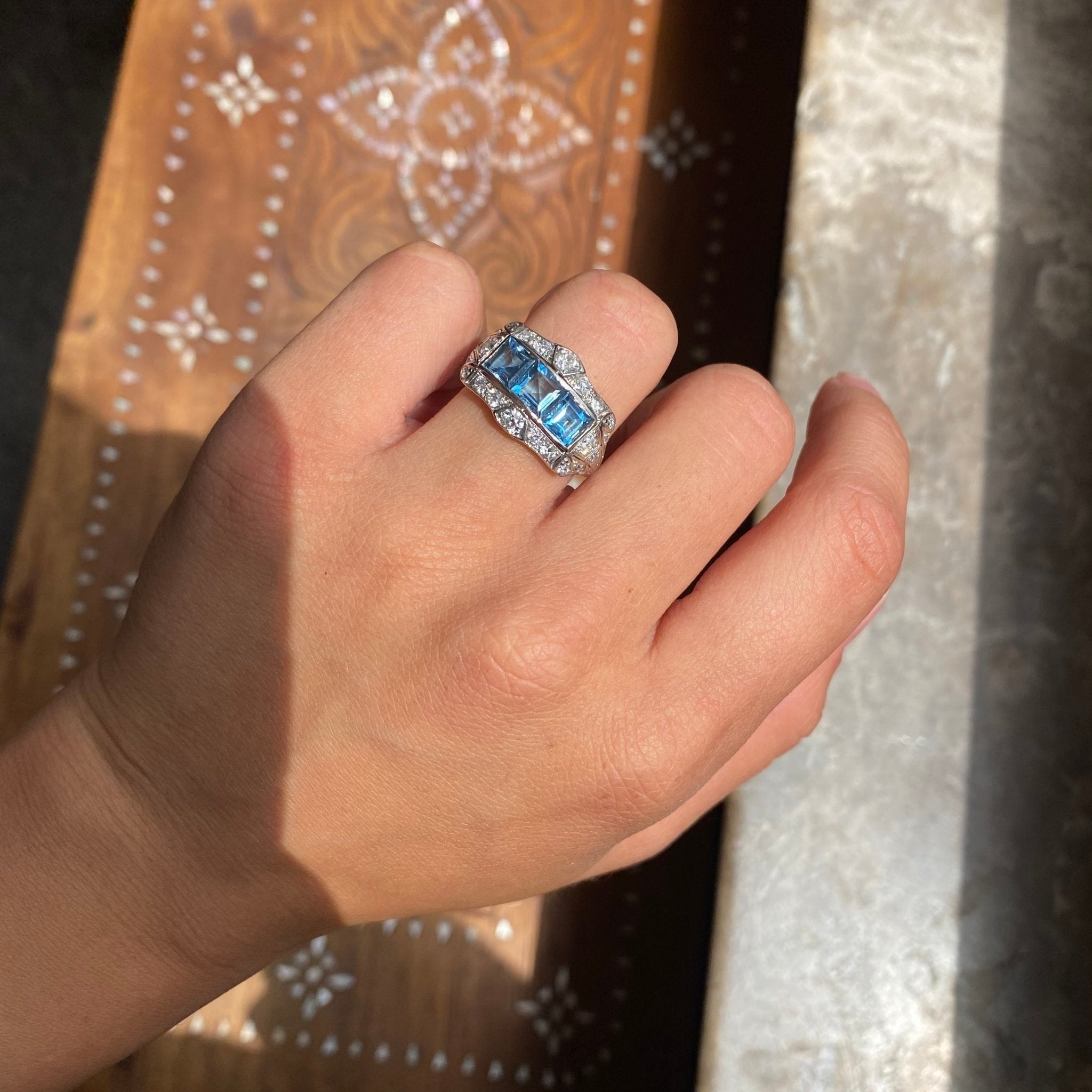 A vintage princess ring featuring a cool, blue pool of step cut aquas! There’s something so sweet and pretty about this ring, we can’t help but ooh and awe each time we come across it. The aquamarine stones in the center are the loveliest shade of blue, with faceting so crisp and clear! The Old Euros that surround it are nothing short of spectacular - bright, sparkling, and such a fun color contrast up against the aquas.