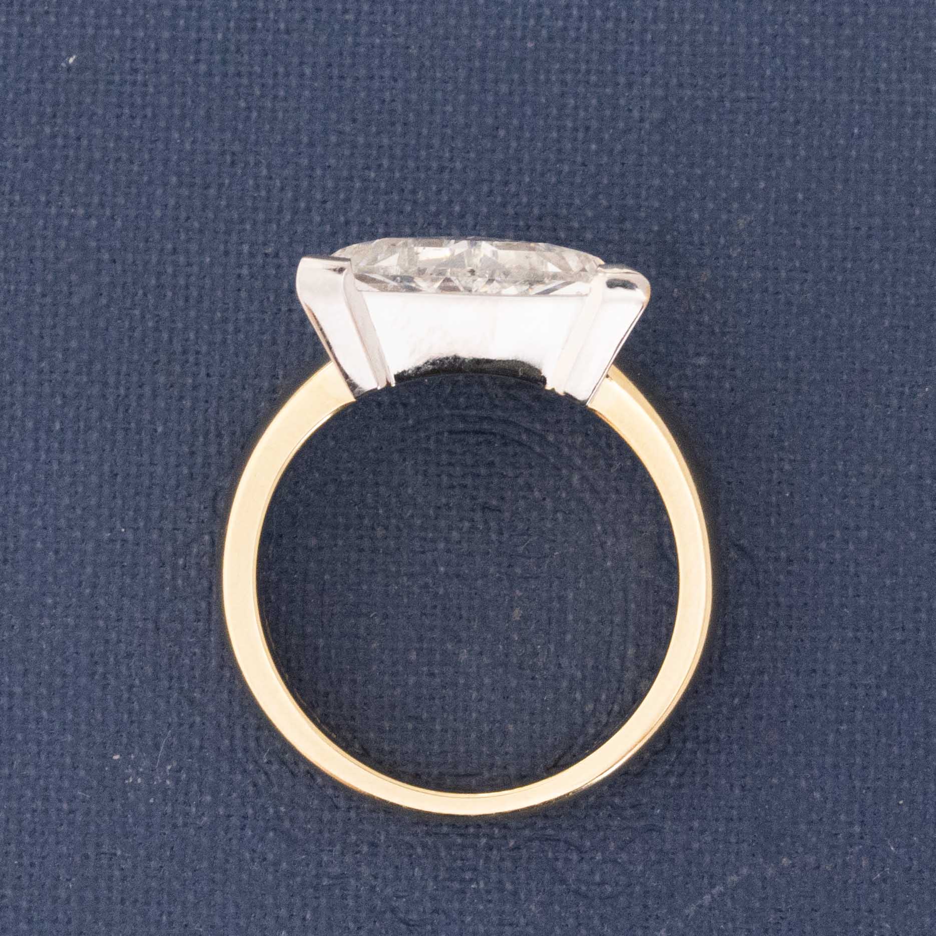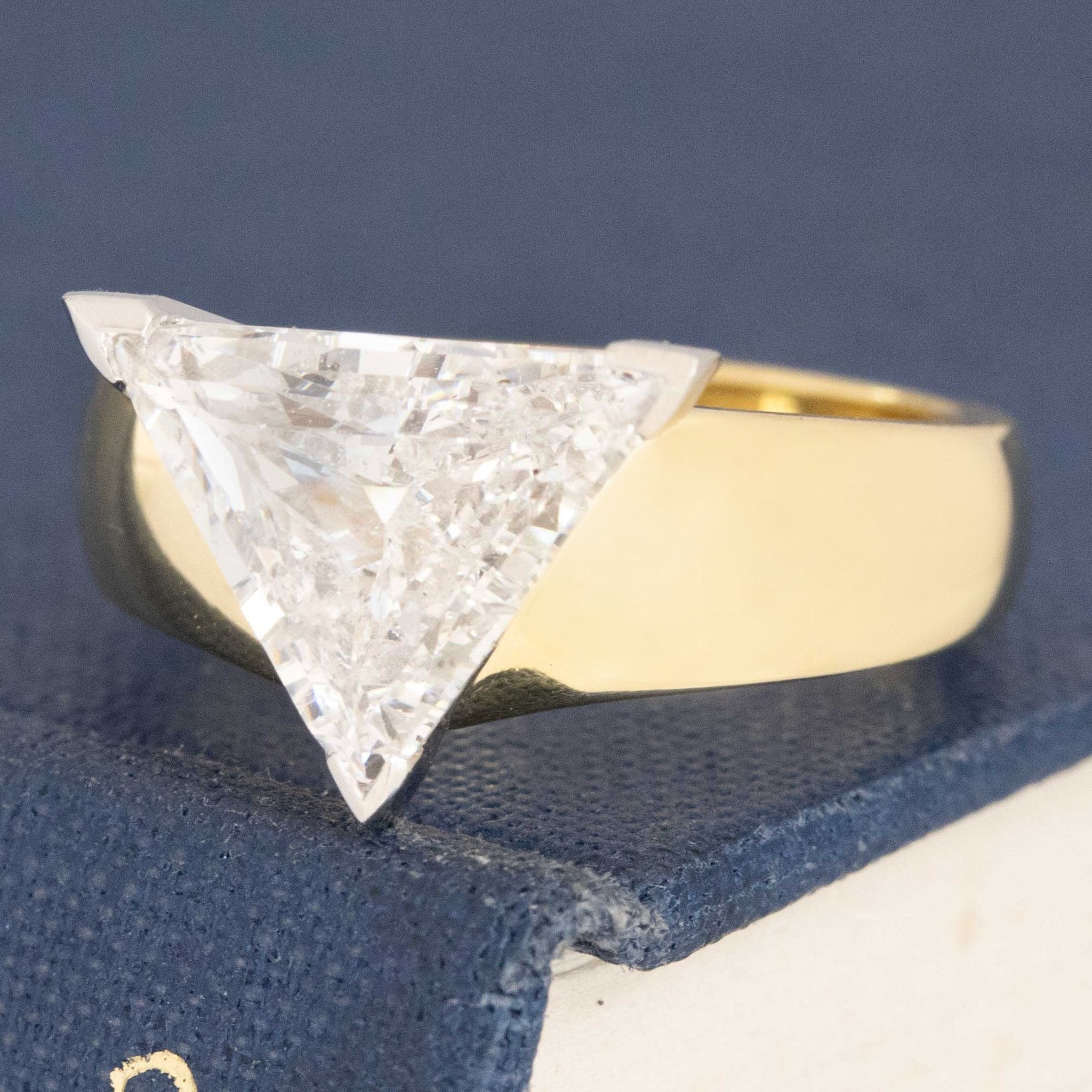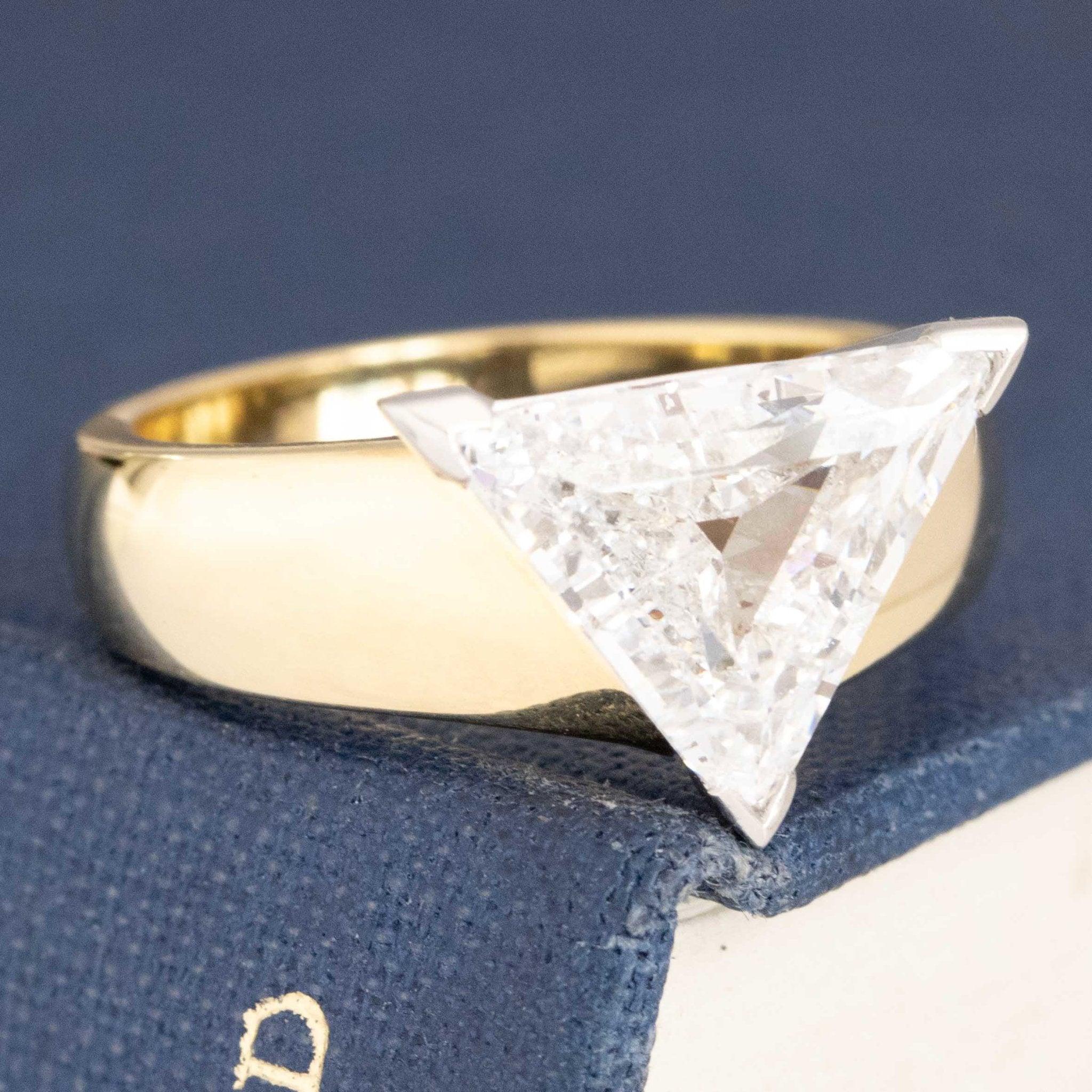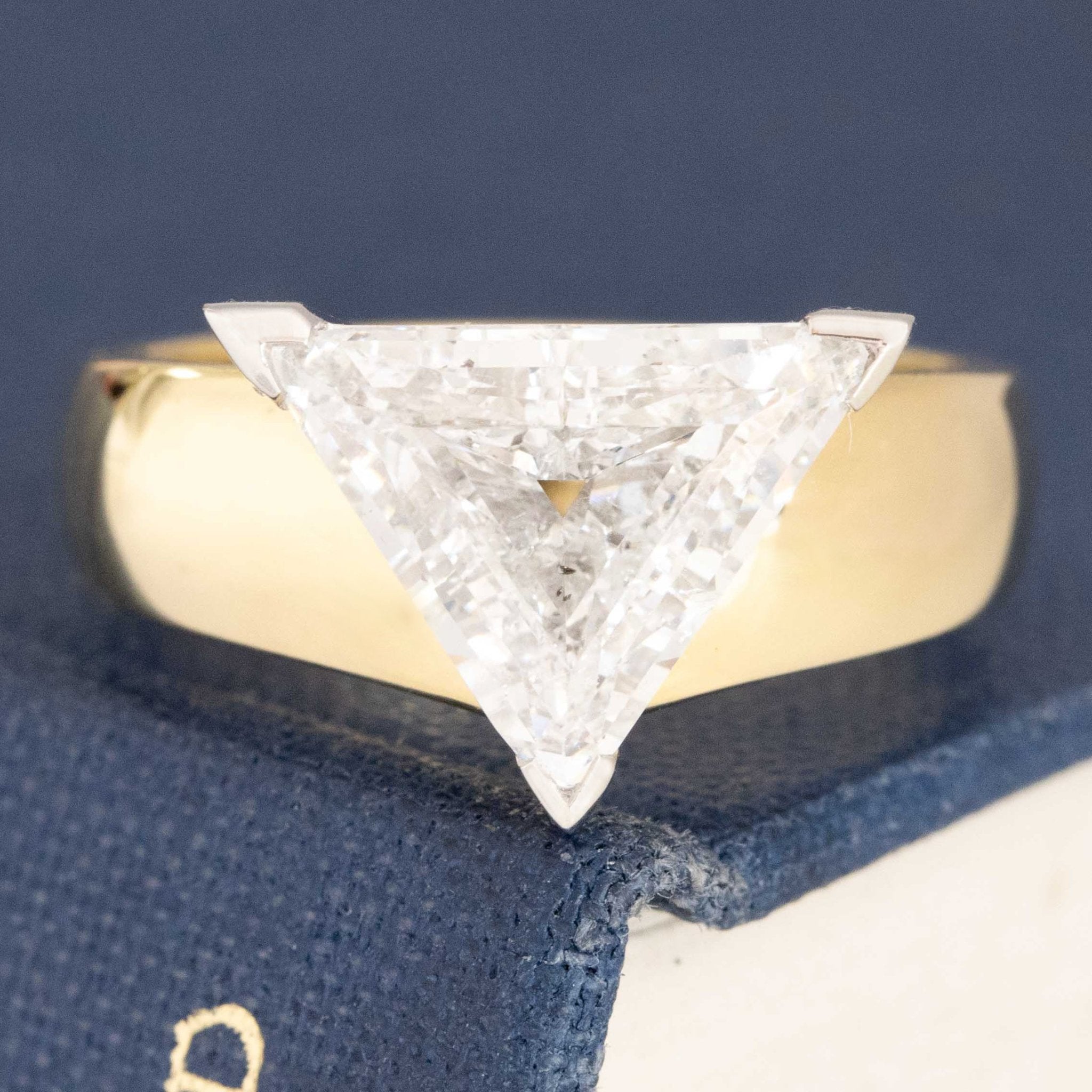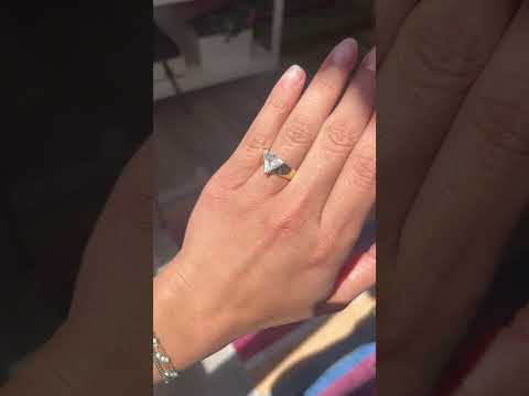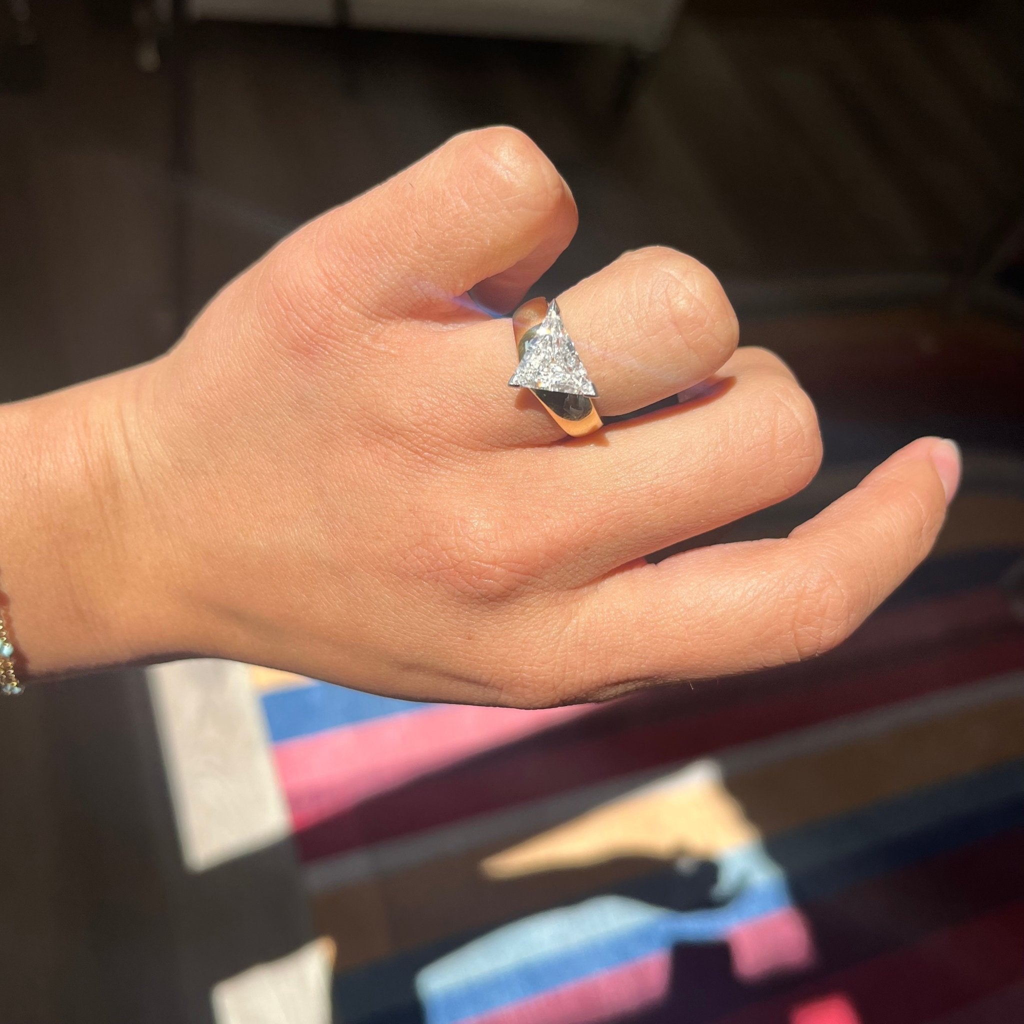 We acquired this art deco era triangular cut diamond from a late deco jewel (quite an unattractive piece with broken pieces, if I may add!). Now reset as a simpl solitaire with a slight wider shank to balance the larger diamond. Incredibly white (GIA F color), with a prominent culet and that unique geometric shape! The perfect ring for those looking for something with an upcycled and old diamond, yet set in a contemporary "now" setting.