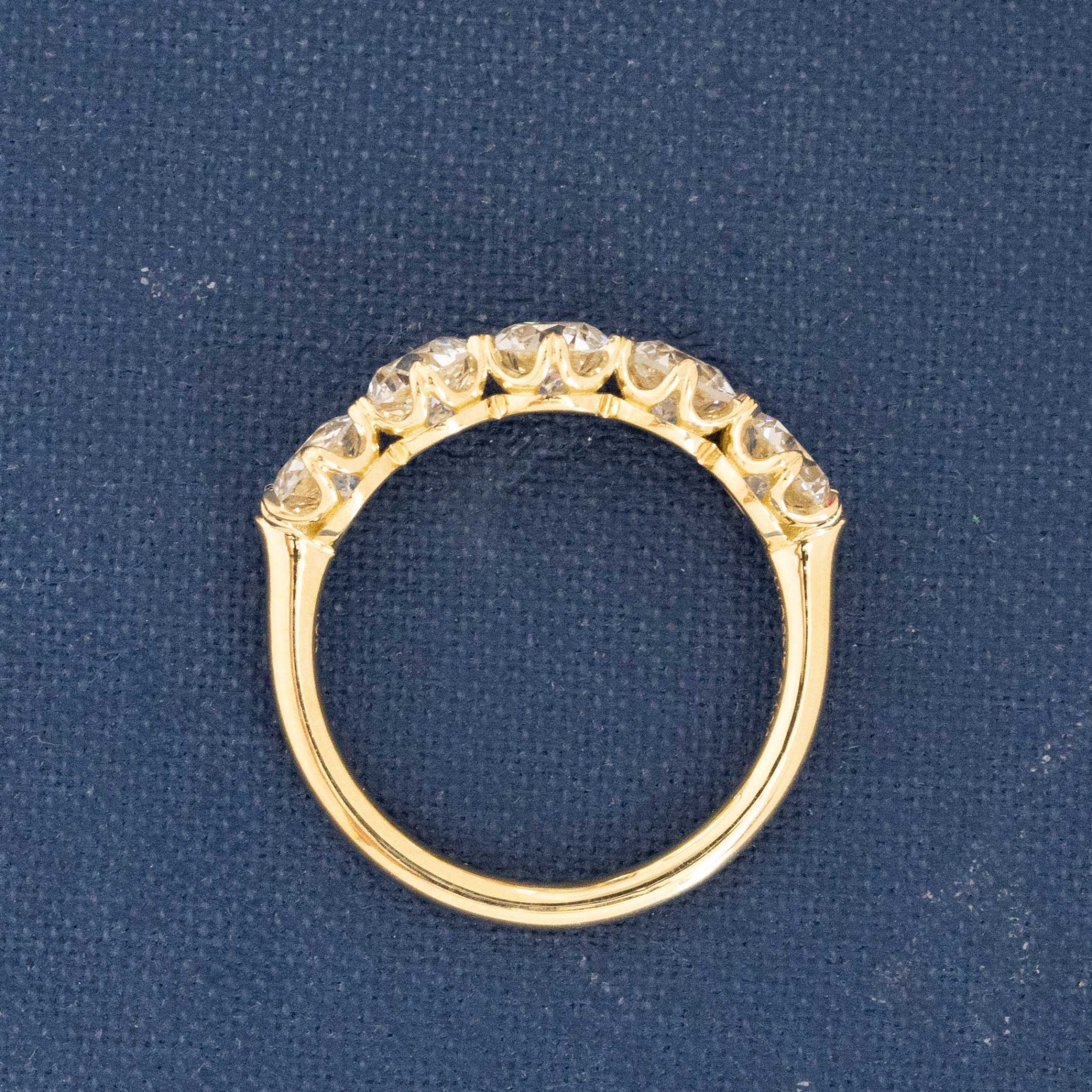 Modeled after antique diamond bands from the Georgian and Victorian eras, this 5-stone band is set with 5 chunky and charming old European cut diamonds in 18kt yellow gold! The diamonds are bright and sparkly and just looks so beautiful and elegant on the finger.
