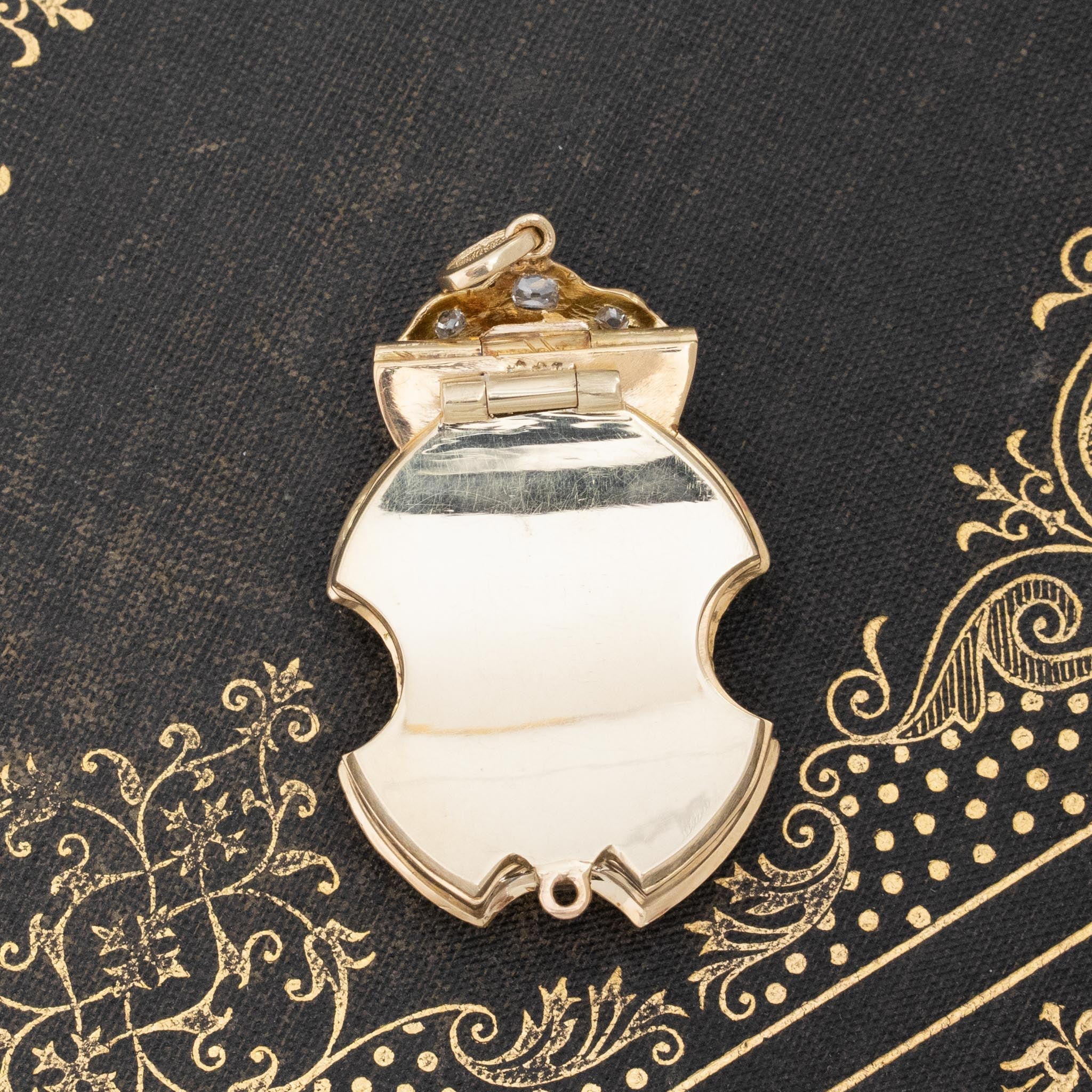When we first acquired this Victorian component, we truly had no idea what its’ first life was. All we knew was that this beautiful gold tone, crisp enamel work, and unique diamond halo deserved to be preserved! After a bit of tinkering, our jewelers figured out a beautiful way to re-work it into a functional locket that is deep enough even to be a shaker locket with loose stones on the inside! We love the regal and elegant form of this piece, with so much true-to-period details in the frame itself.