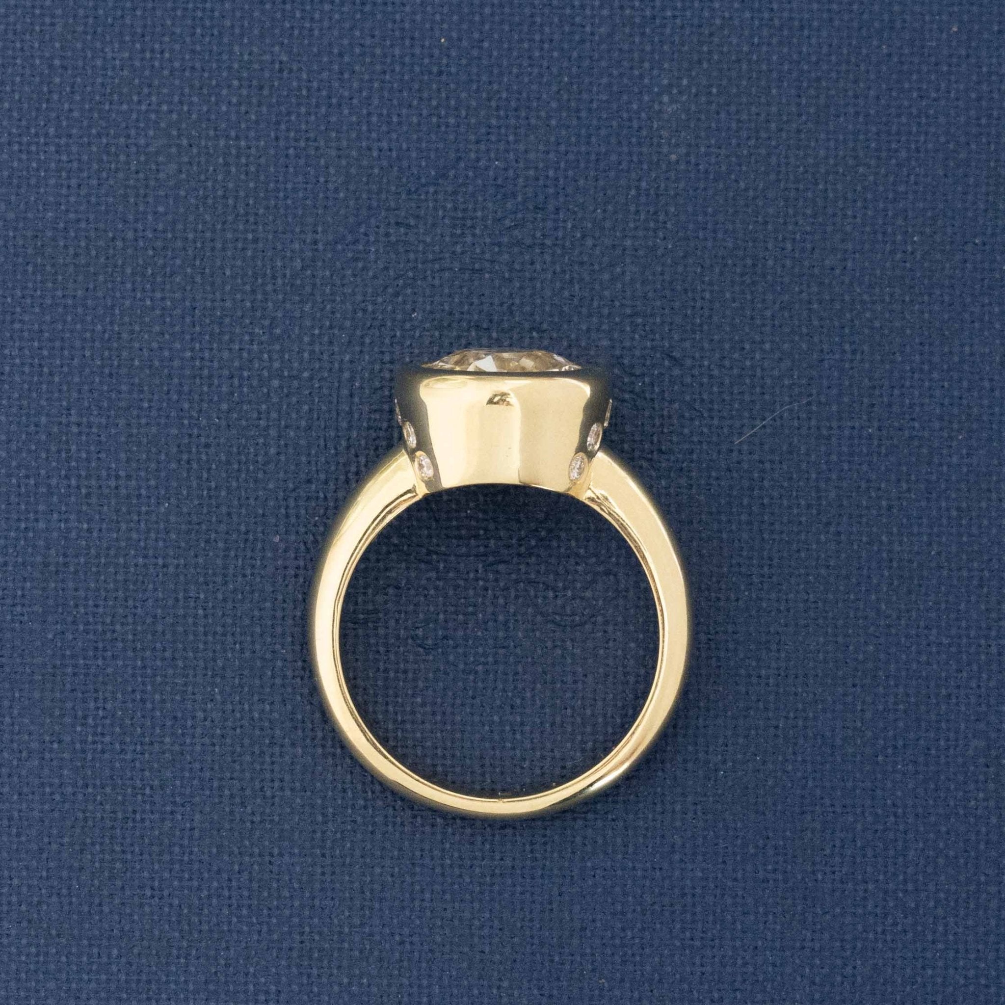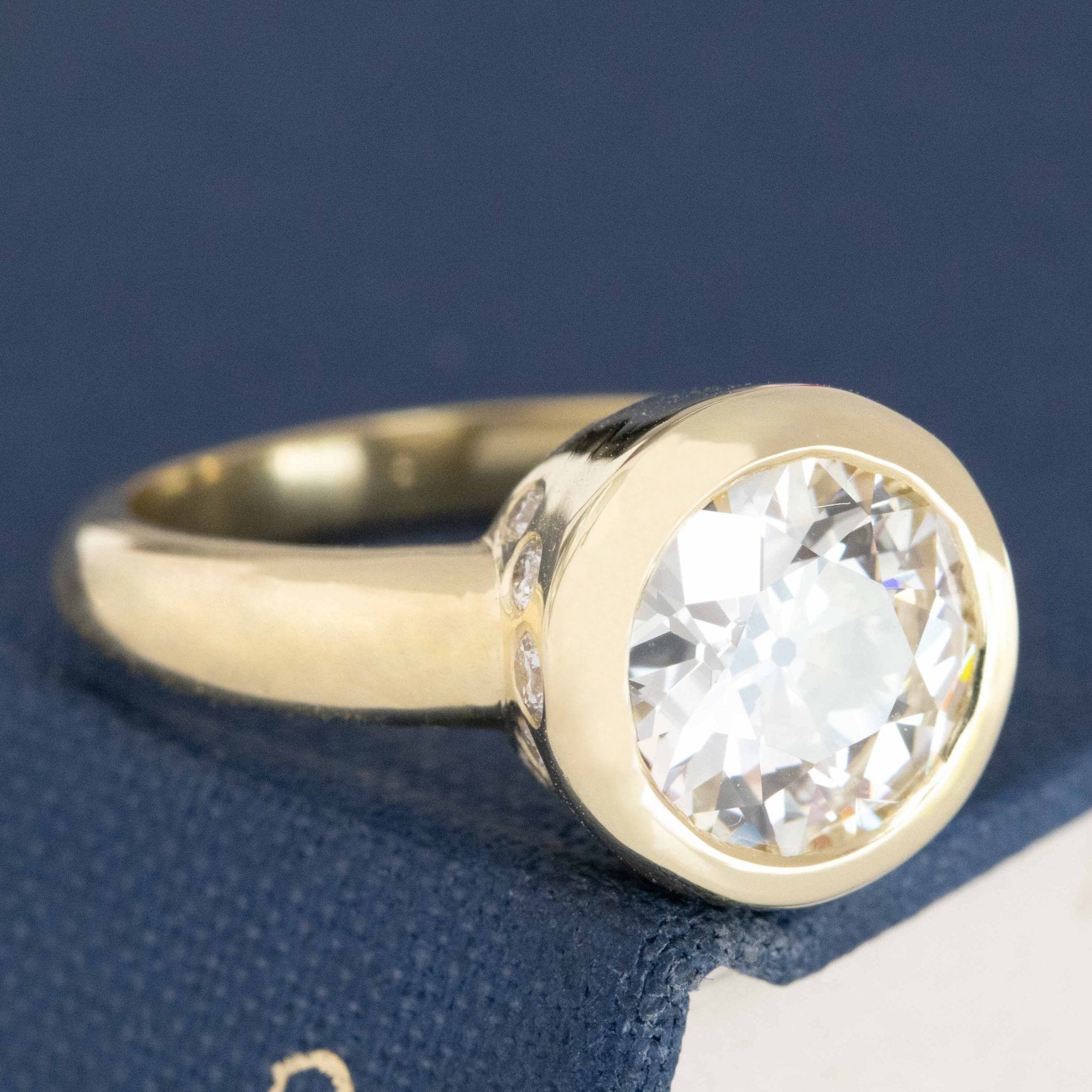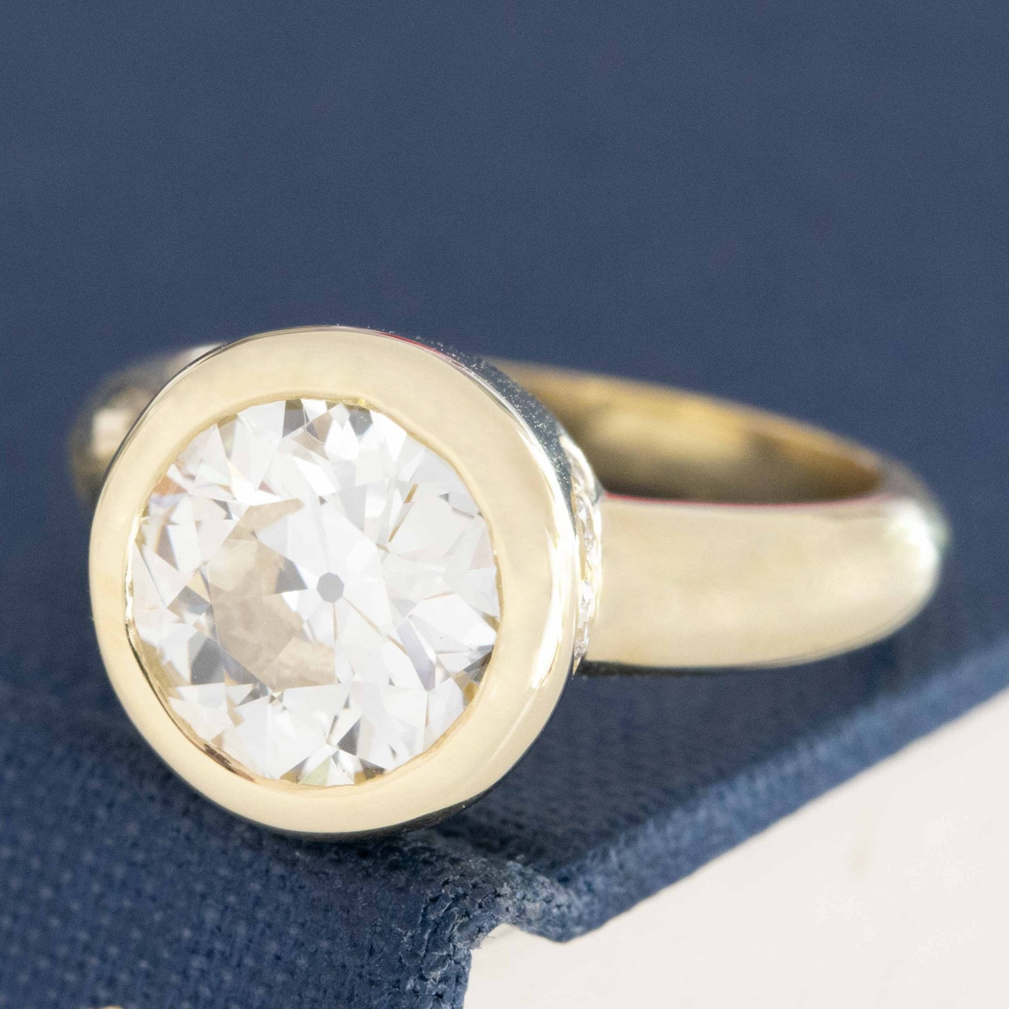 Its chunk on chunk with this 2.54ct old European cut diamond in our custom chunky bezel with diamond details on the bezel shoulders. The diamond is very bright and lively - hard to believe its graded color is an N (it faces up closer to a K color)! Full of charm and character - perfect contrast to the ring's clean lines.