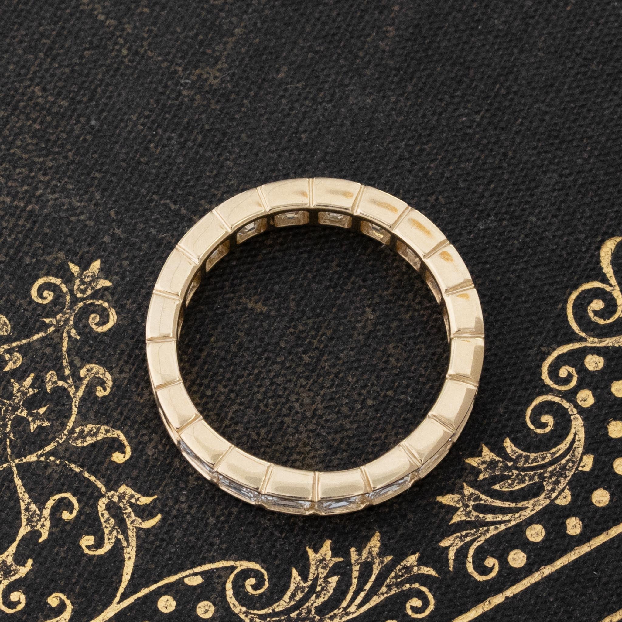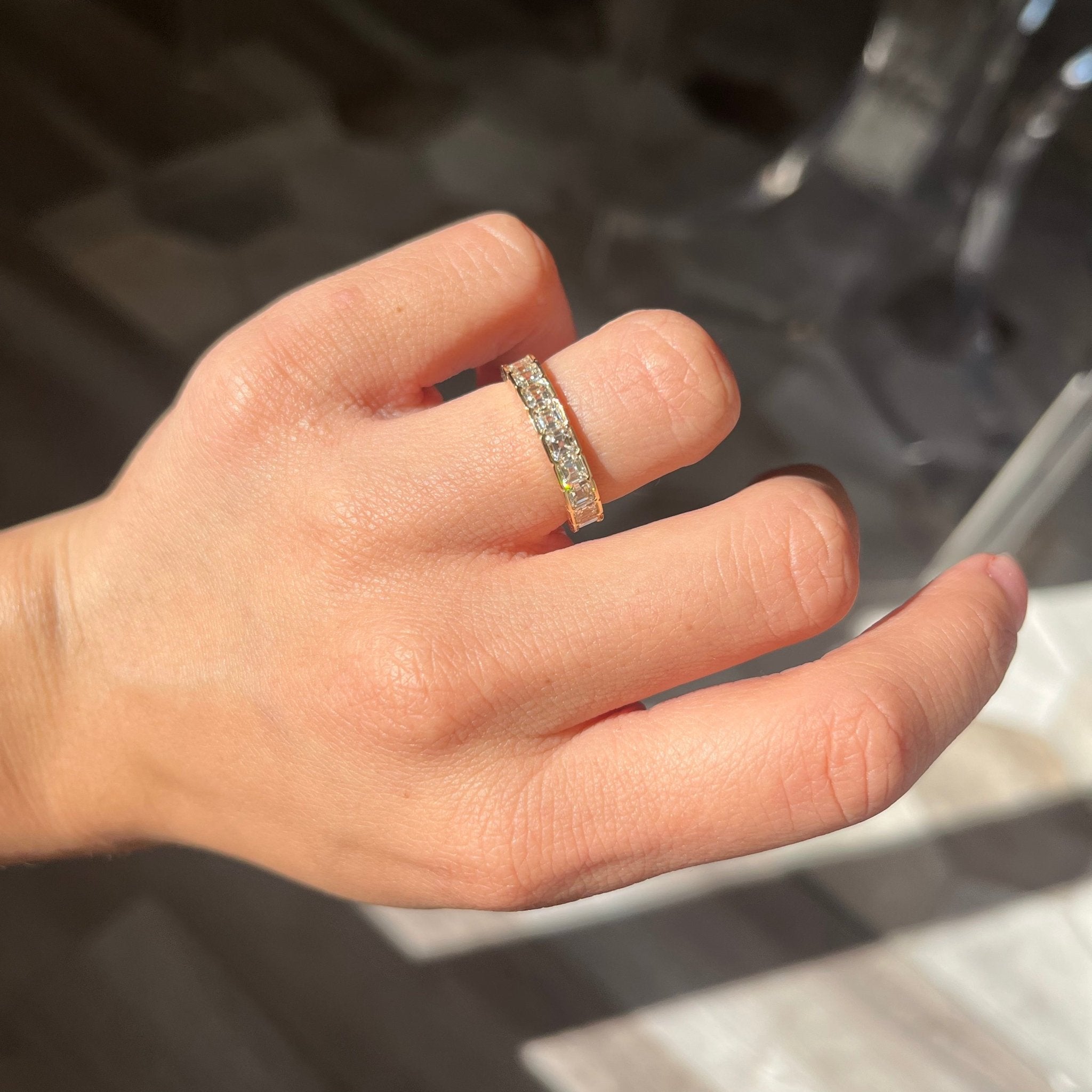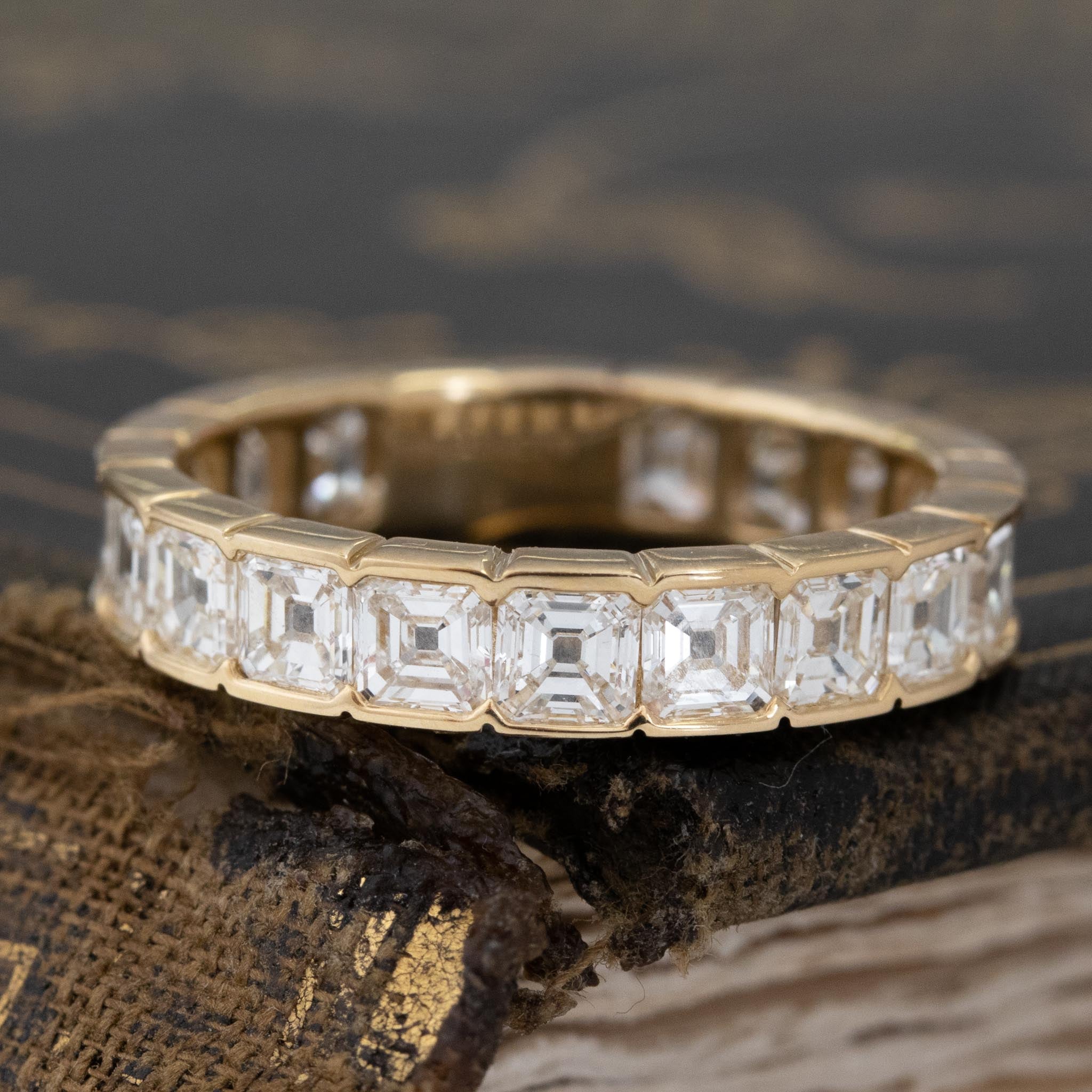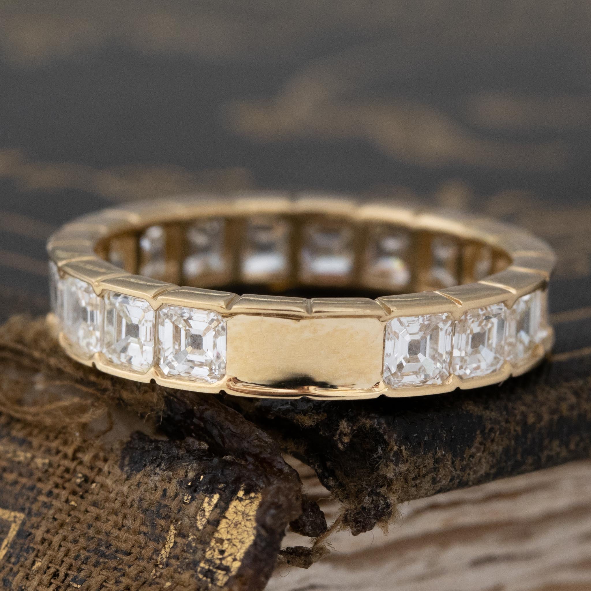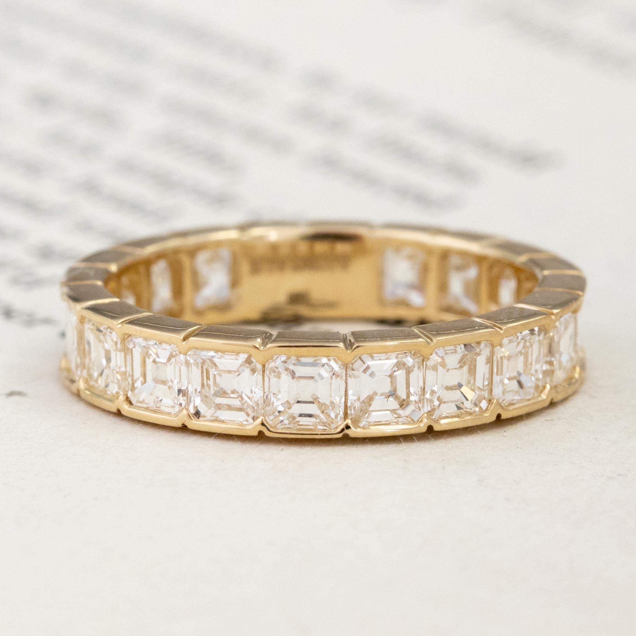 These old-style, open-culet asscher cuts were begging to be set into a band - so obviously, we had to oblige! With warm, yellow gold half bezels these diamonds look absolutely stunning. They are shimmery and sparkly, packing a big punch in a classic way. At the bottom of the band is what we call a sizing bar : not to only there to help prevent damage to any palm-side diamonds, but also to allow for some sizing if need be! A perfect stacker, killer band, and new favorite in your jewelry box.