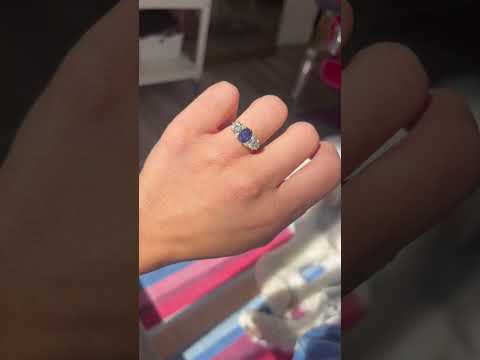 Since we often find the antique scroll rings in platinum, this antique-inspired yellow gold number is quite the fun vibe! Centering ion an oval-cut blue sapphire with two Old Euros on the shoulders, this sweet trilogy ring offers up delicious color contrast and immense sparkle. We love the blue and white up against the yellow gold, with delicate prongs holding them in, and tiny diamond accents throughout. The ring gives you great finger coverage, and would stack with bands beautifully.