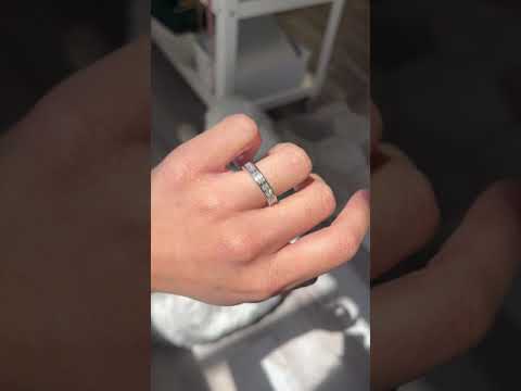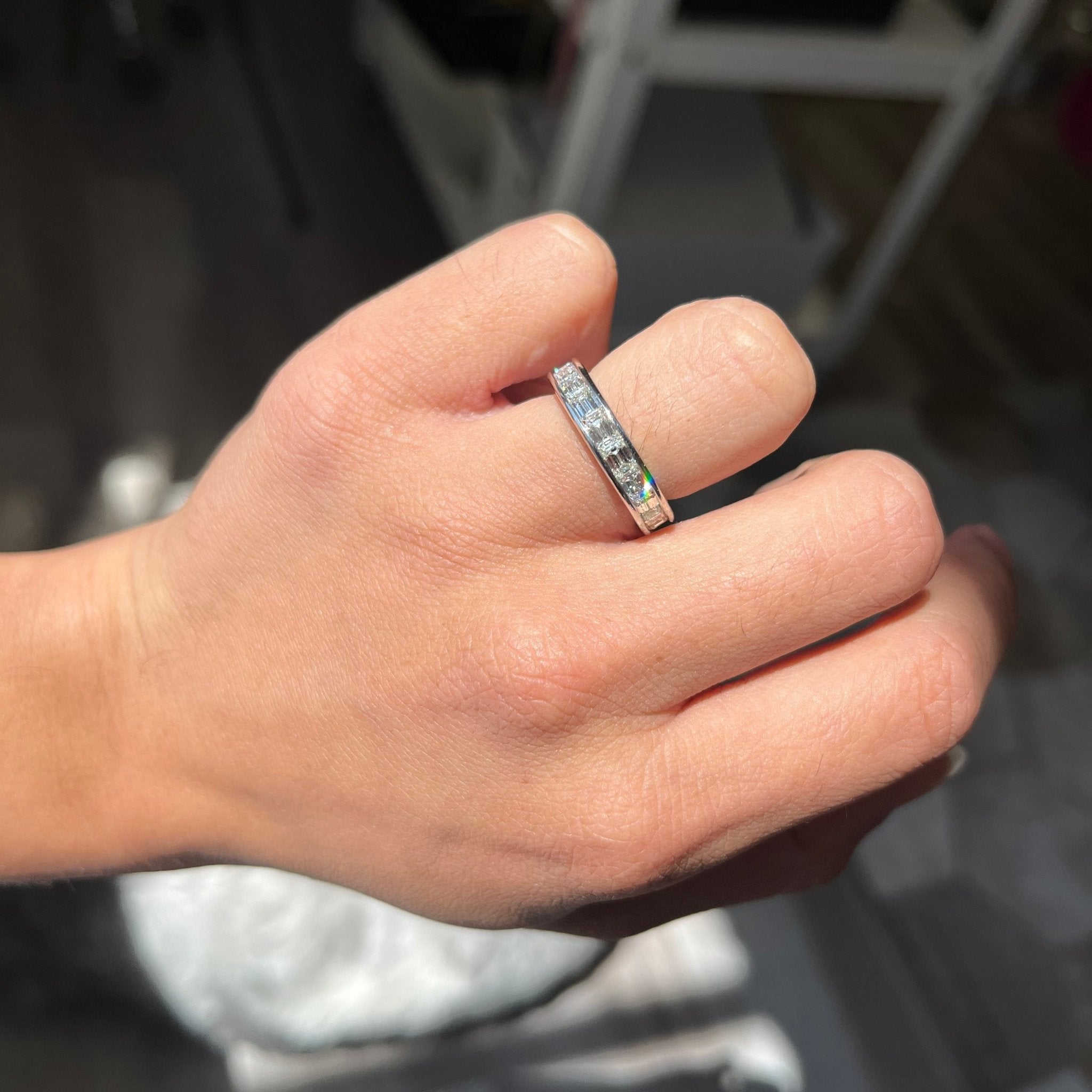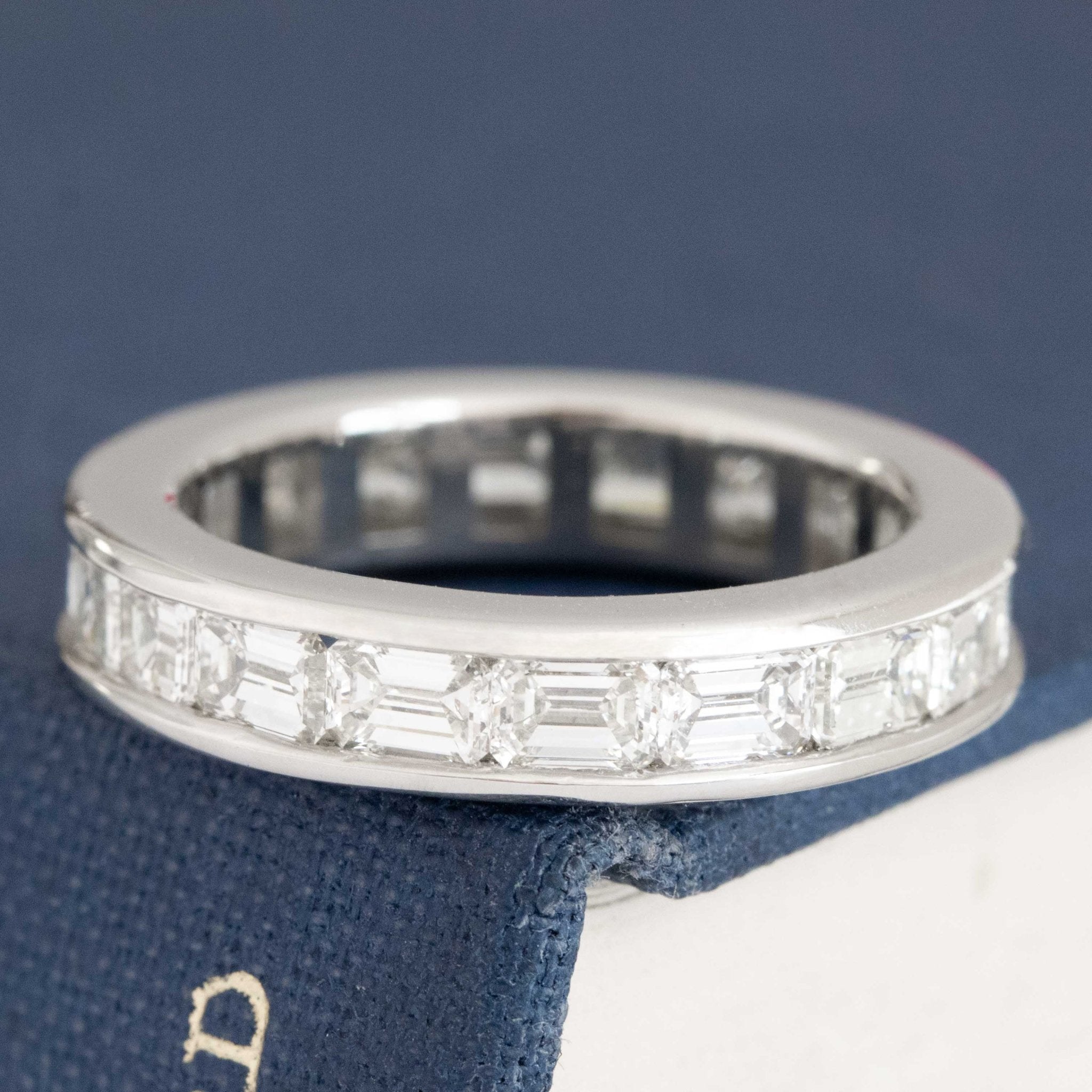 A classic emerald cut diamond eternity band in a channel style setting! Set in icy platinum, this timeless piece of jewelry spans beautifully around one's finger and stacks well with others.